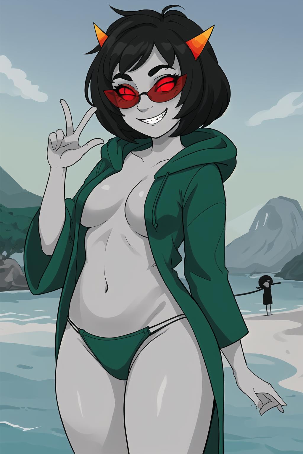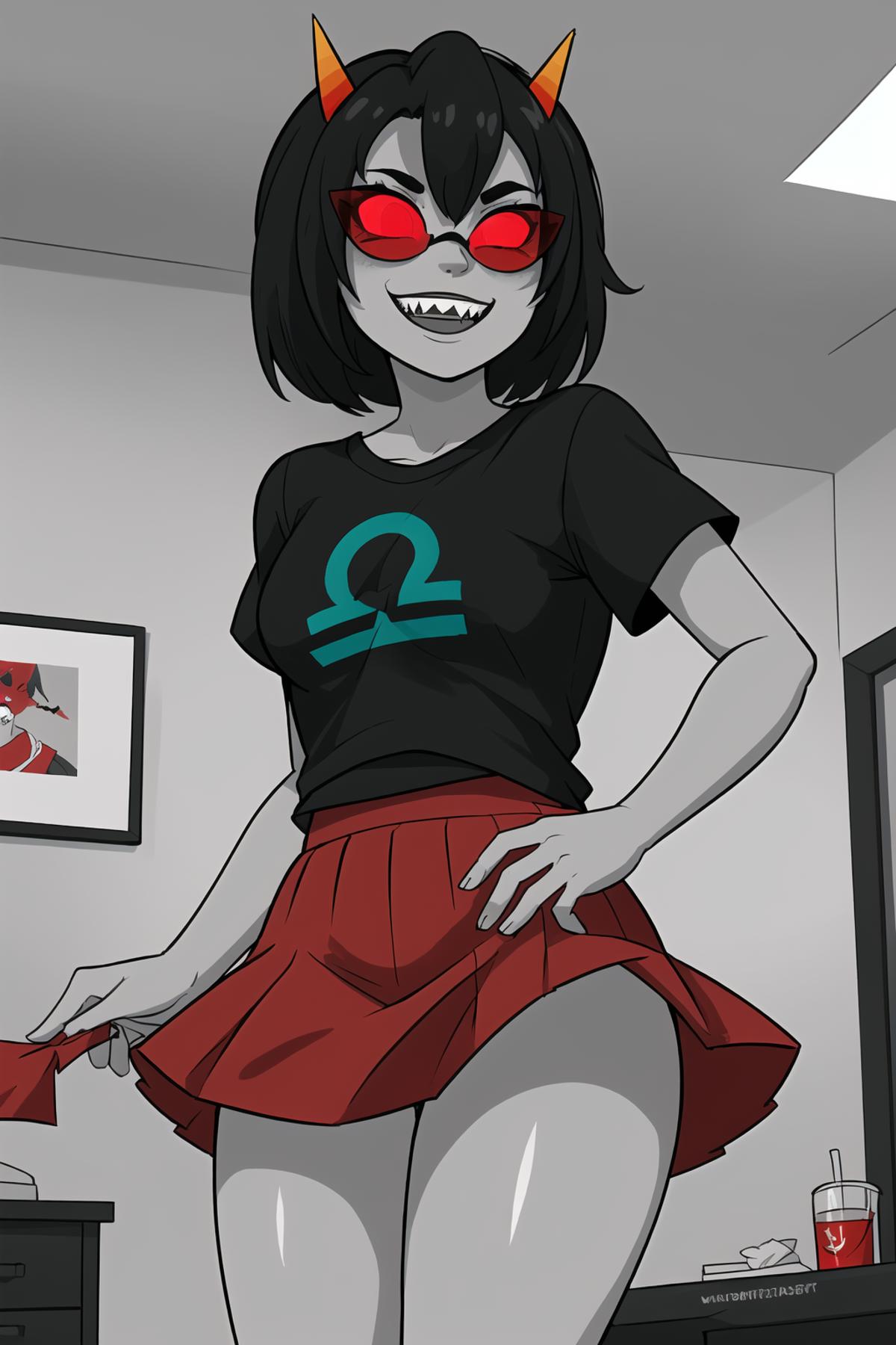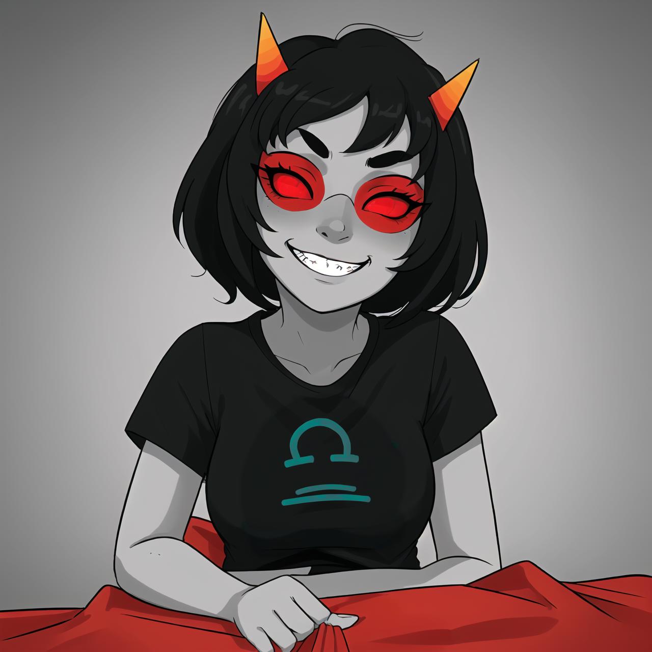 Main prompts: 1girl, horns, colored skin, solo, black hair, grey skin, smile, glasses, sharp teeth, fangs, sunglasses, re-tinted eyewear, colored sclera, shirt, grin, red eyes, black shirt, t-shirt