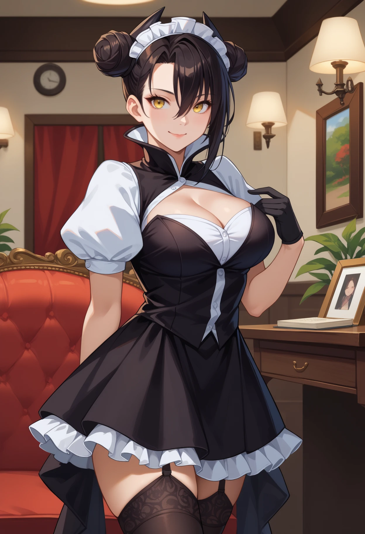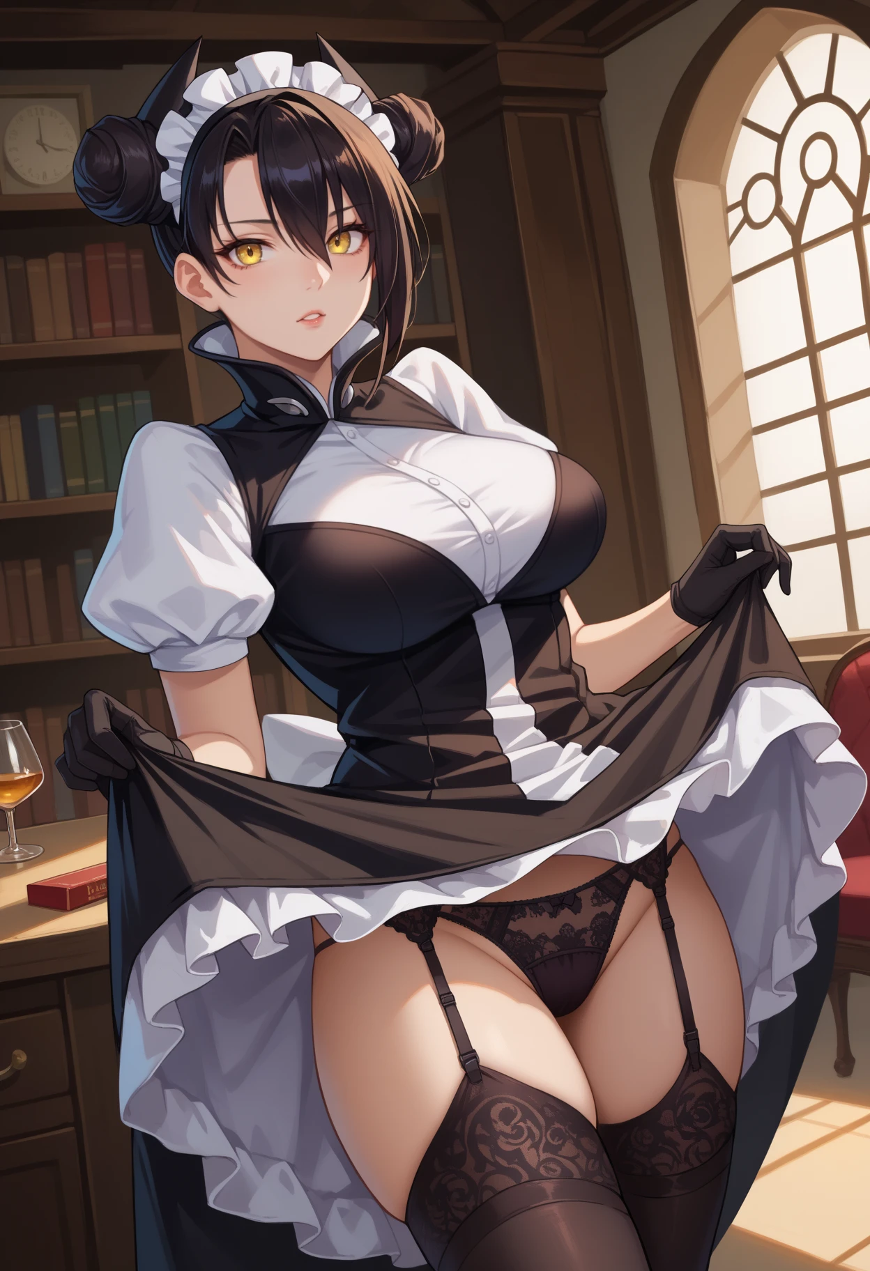 jeloag, medium breasts, grey eyes, black hair, asymmetrical hair, double bun, hair between eyes, black horns, headdress, high collar, layered clothes, white shirt, black dress, puffy sleeves, short sleeves, white bow, black gloves, garter straps, black thighhighs