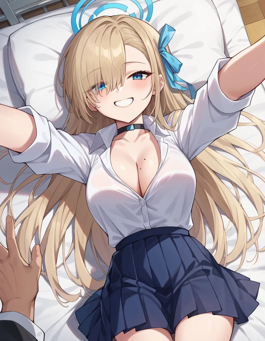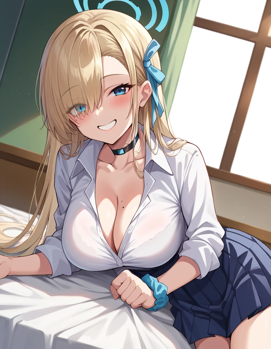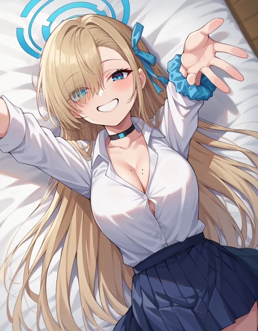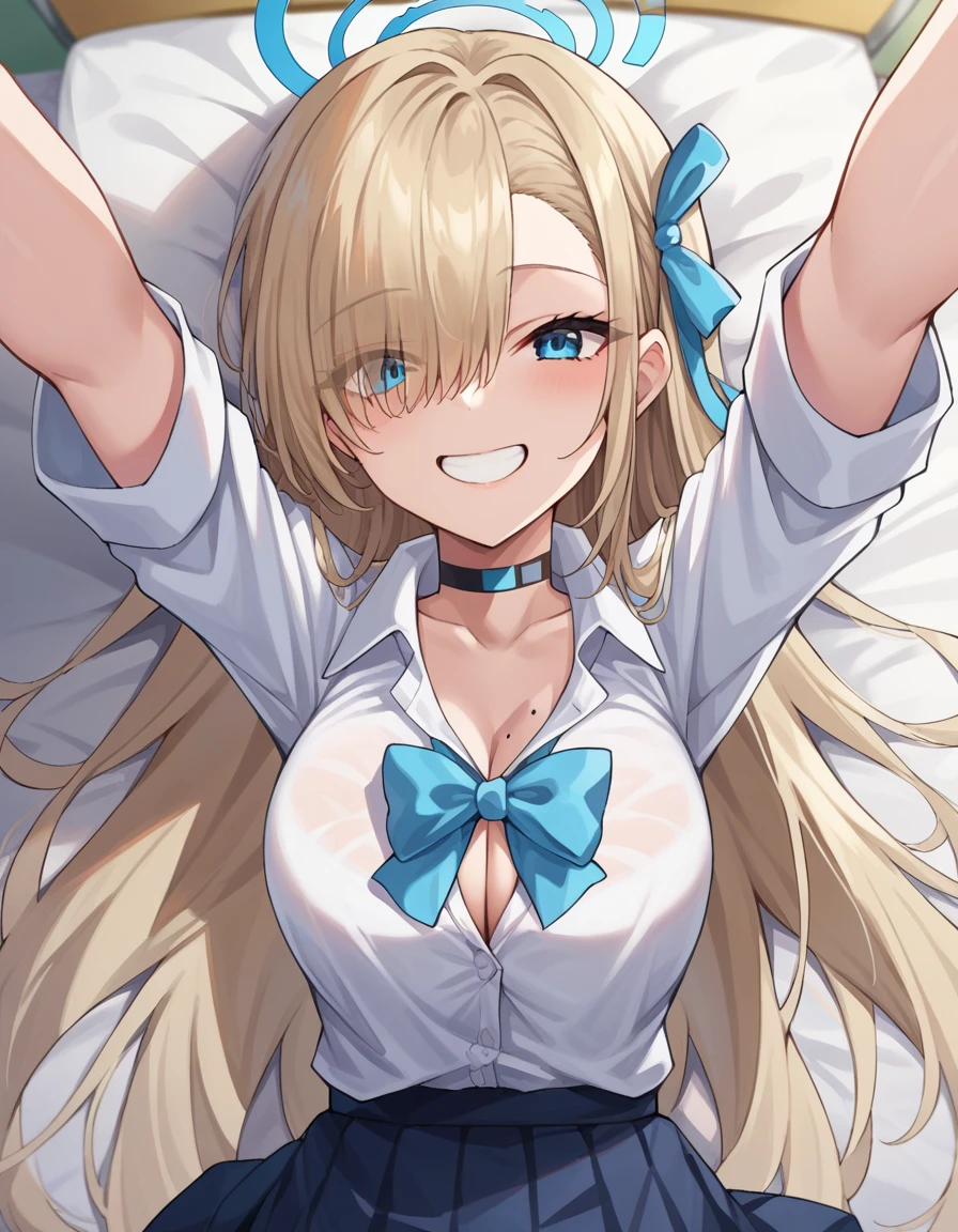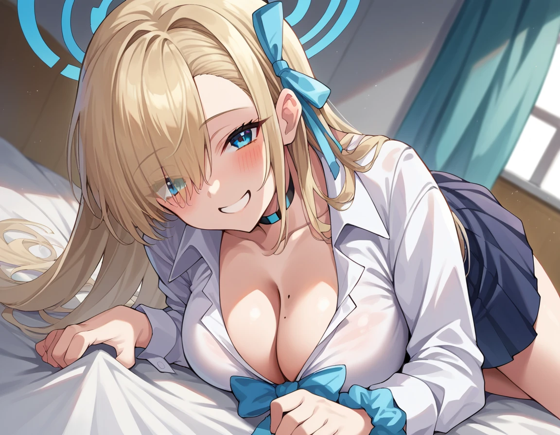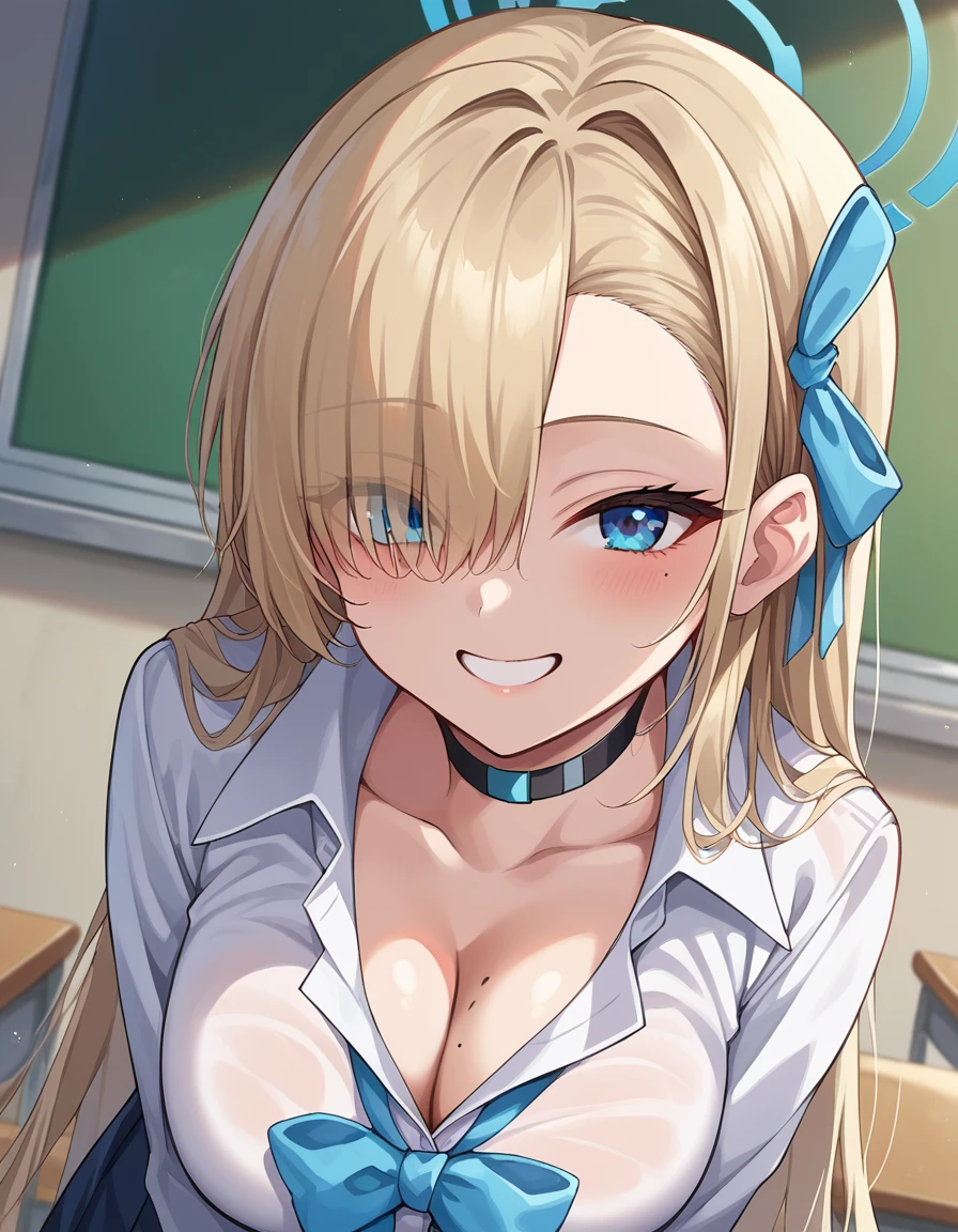 asuna ichinose, blonde hair, blue eyes, hair bow, hair ornament, hair over one eye, halo, long hair, mole, mole on breast, mechanical halo,
