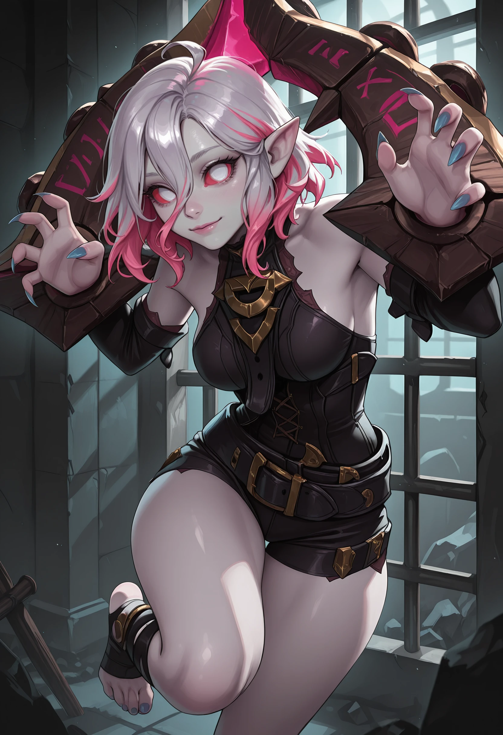 briaril, red sclera, white eyes, no pupils, medium hair, pink hair, grey hair, ahoge, multicolored hair, sidelocks, two-tone hair, streaked hair, hair between eyes, pointy ears, colored skin, grey skin, ???? shoulders, ??????????????, detached sleeves, belt, toeless legwear, stirrup legwear, ???? thighs, thick thighs, black shorts, short shorts, (long fingernails:0.9), blue nails, sharp fingernails, black sleeves,claw pose, toes, wrist cuffs, pillory, bound wrists, I use V12 WAI-NSFW-illustrious-SDXL checkpoint for my images.