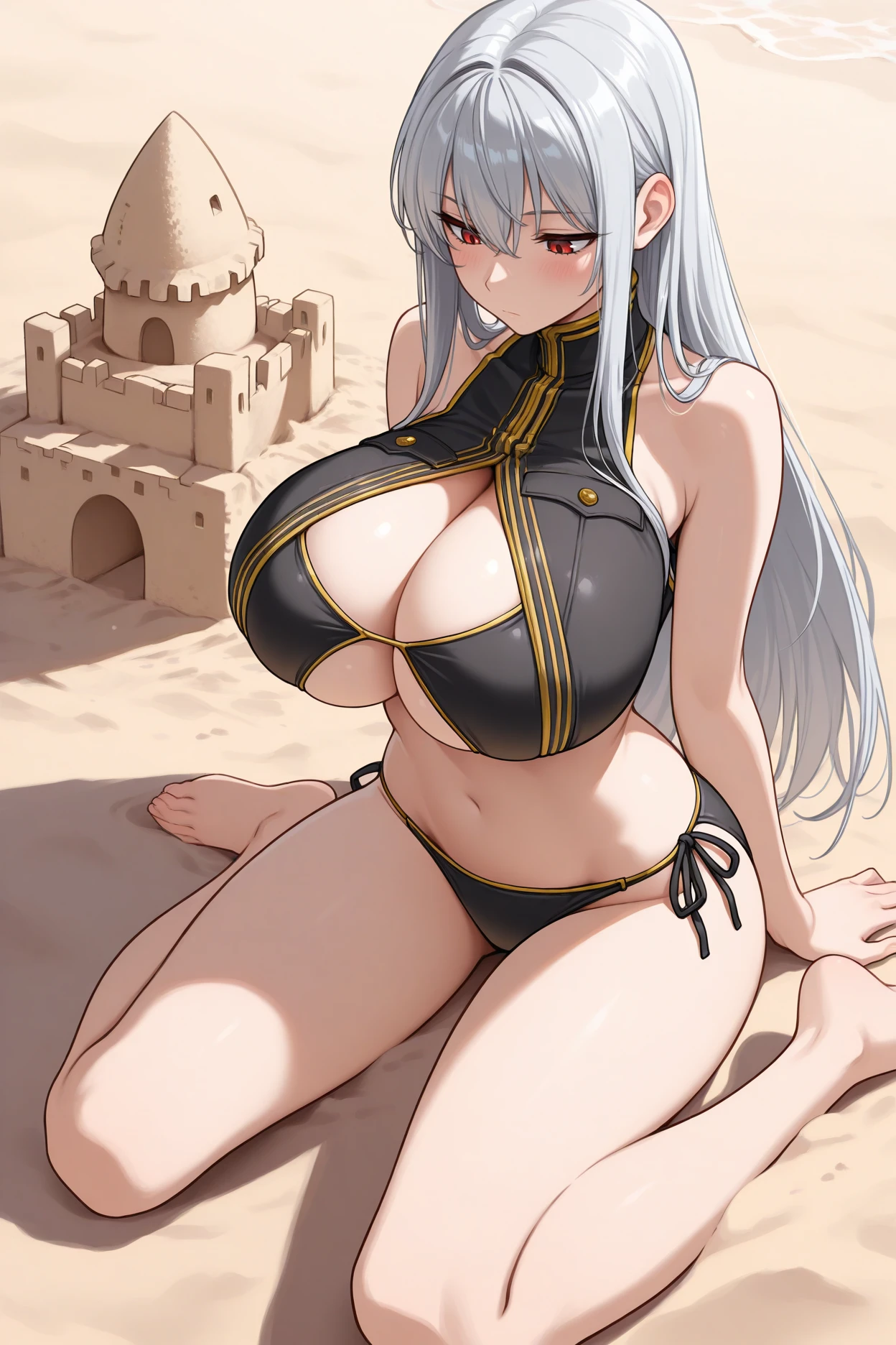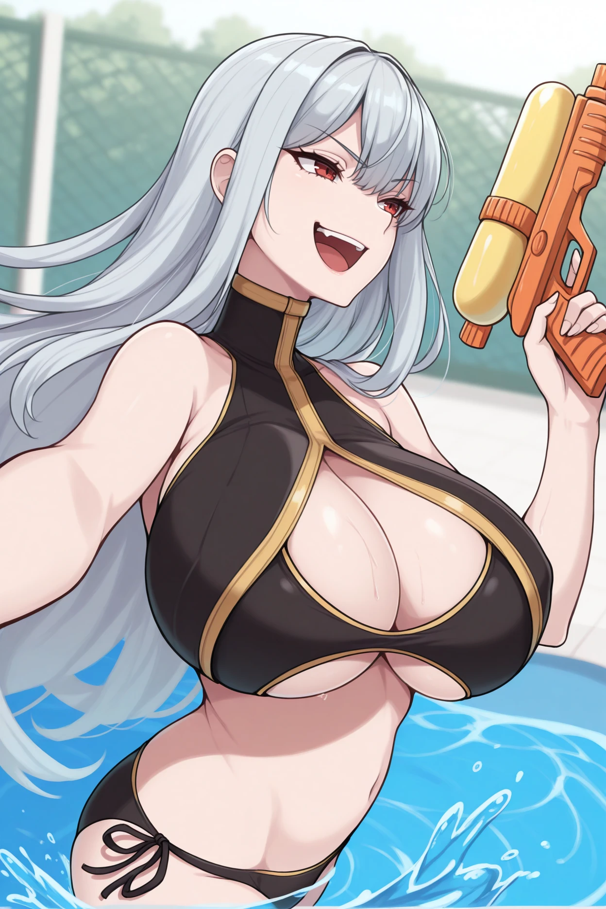 Add "turtleneck, black crop top, sleeveless, cleavage cutout, black bikini, underboob, side-tie bikini bottom" for her swimsuit.