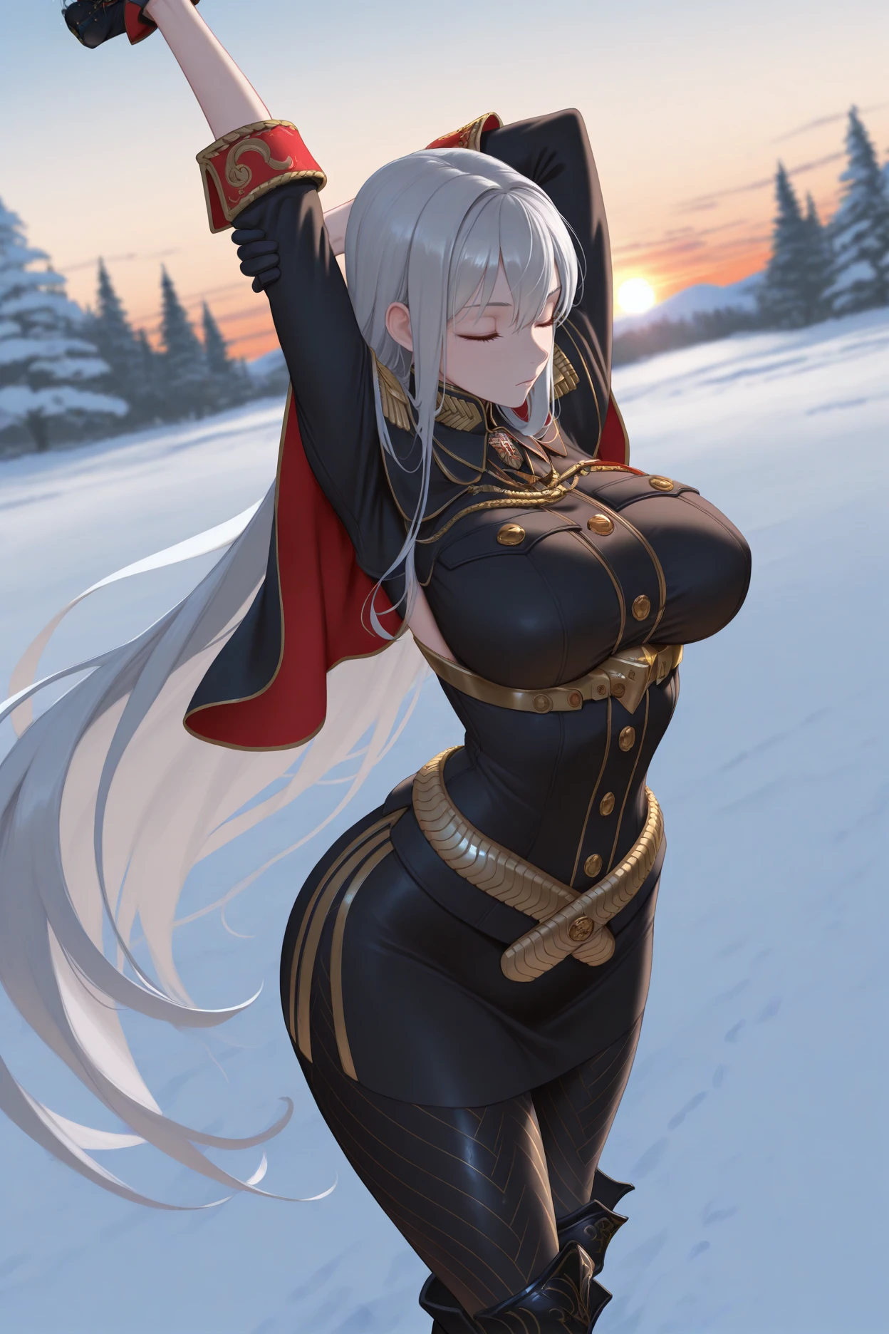 Add "black shirt collar, black uniform, black capelet, epaulettes, black sleeves, gold belt, black gloves, black pantyhose, patterned pantyhose, black boots" for her cape/epaulettes.