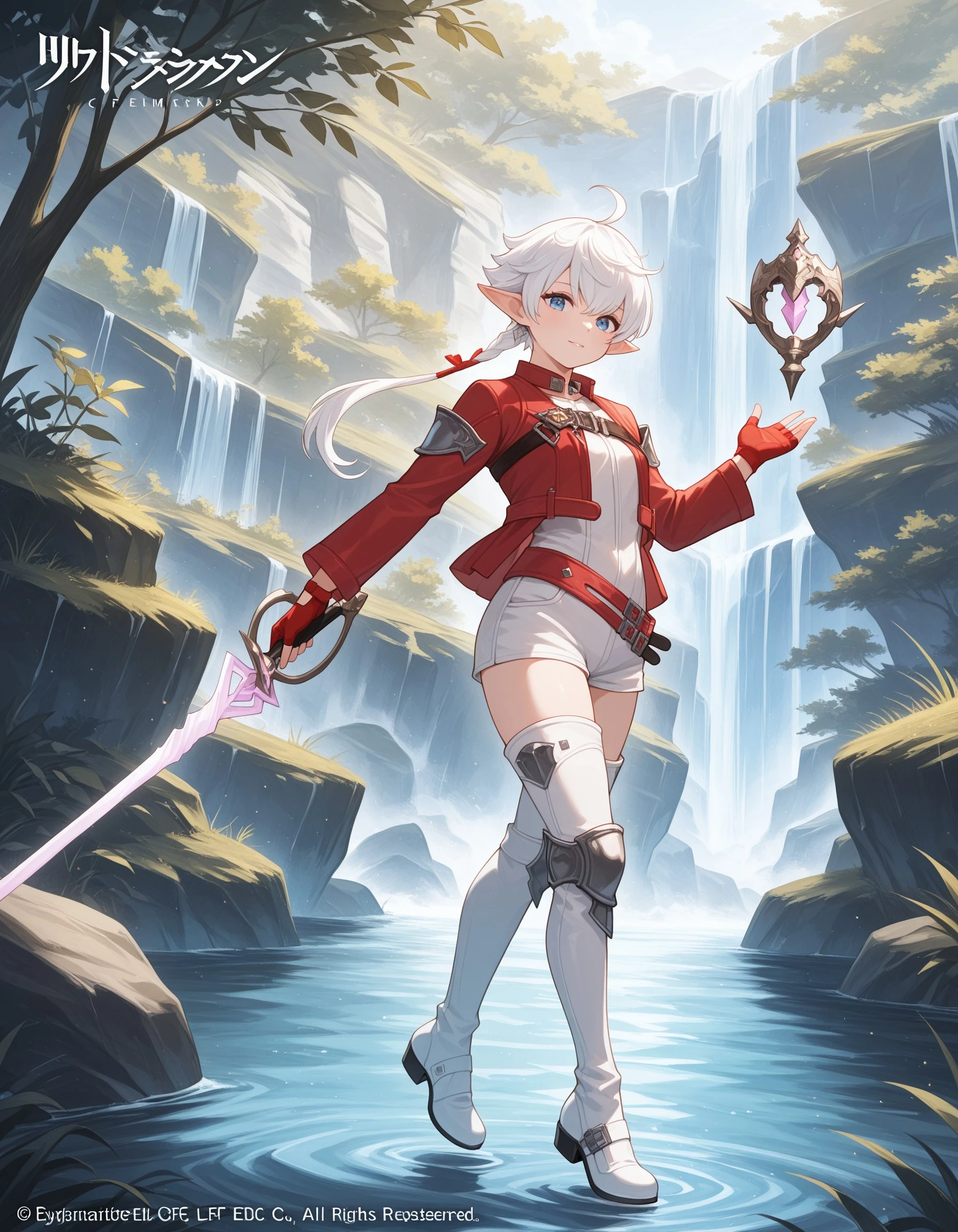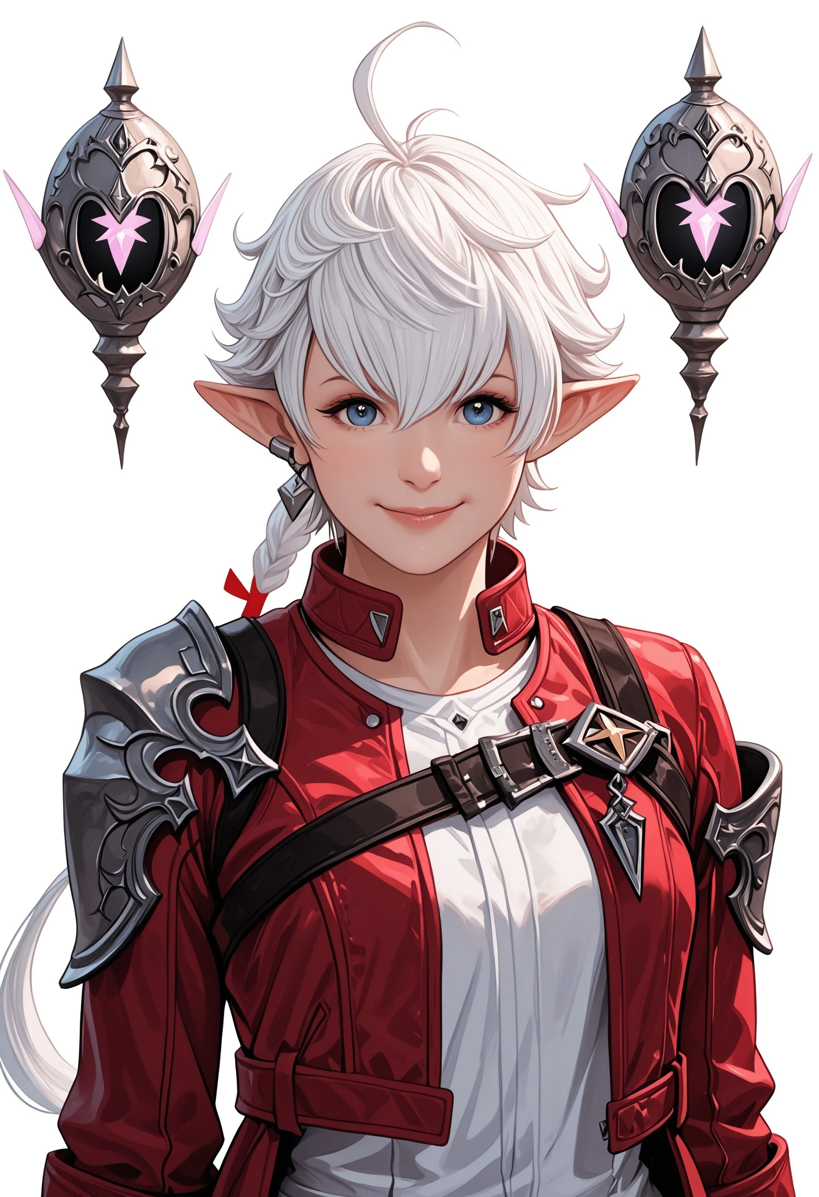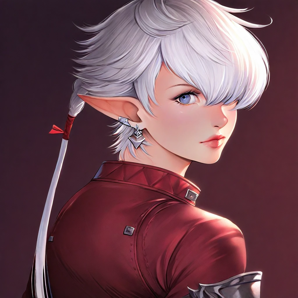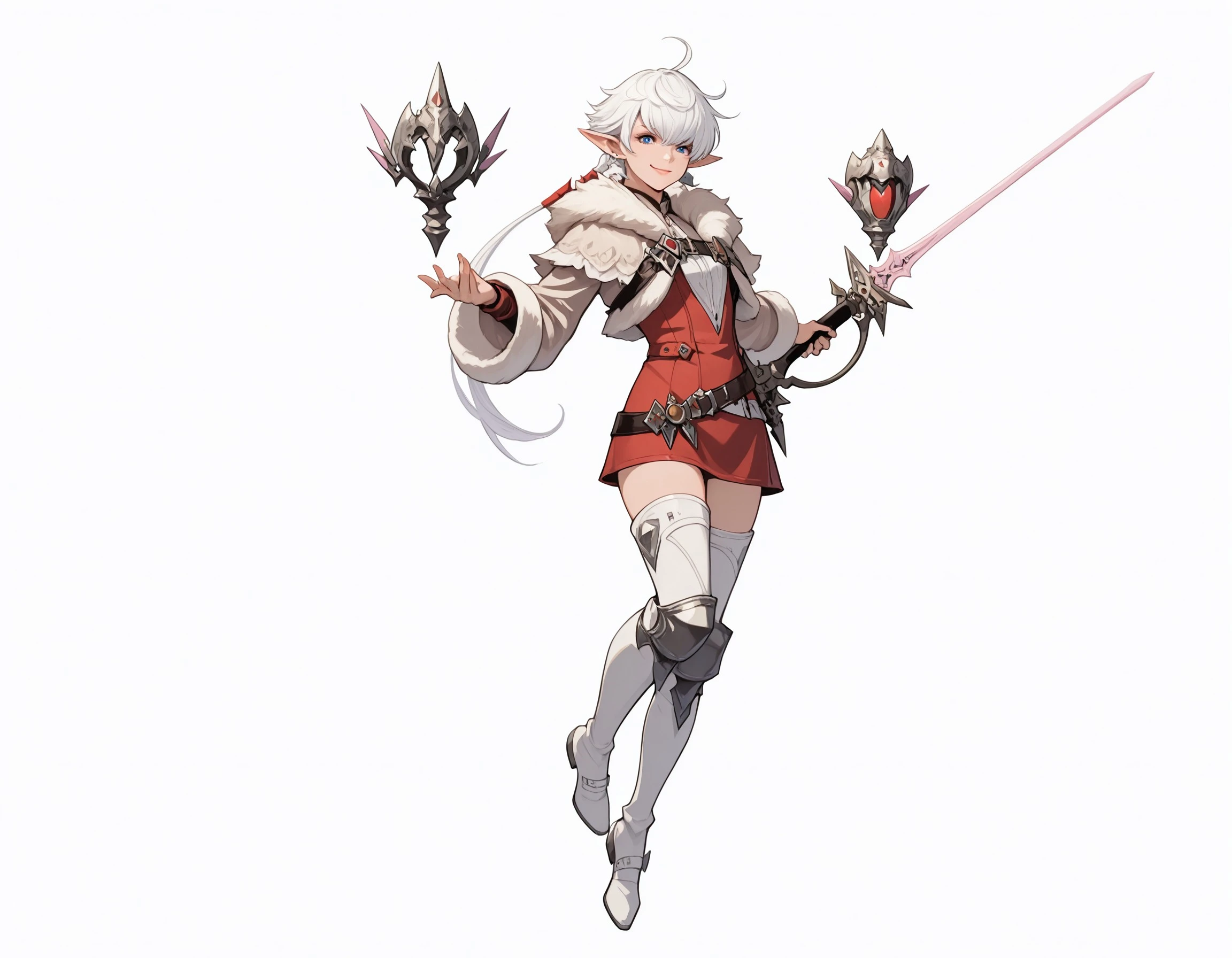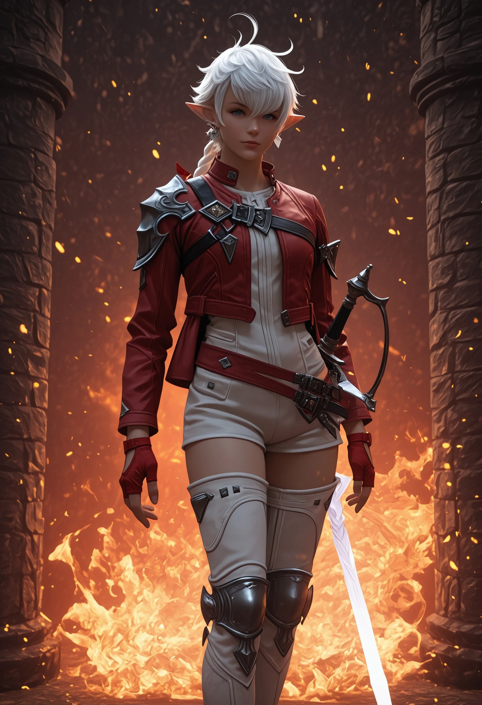 In Final Fantasy XIV: Endwalker, Alisaie receives a new outfit comprised of a white short jumpsuit, a cropped leather jacket with a longer trail in the back, and thigh high white boots with armored kneepads. The look is accessorized by her red leather gloves, red belts on her waistline, and a large dark blue belt across her chest.