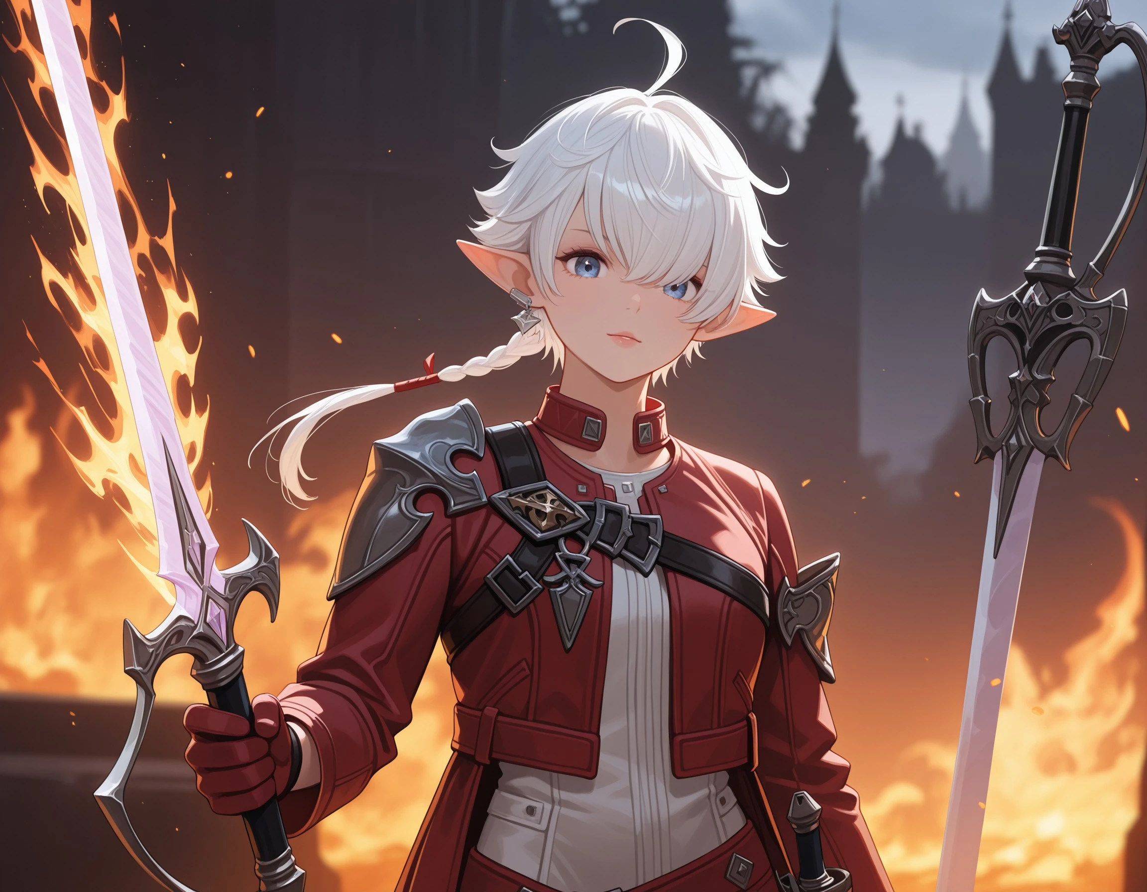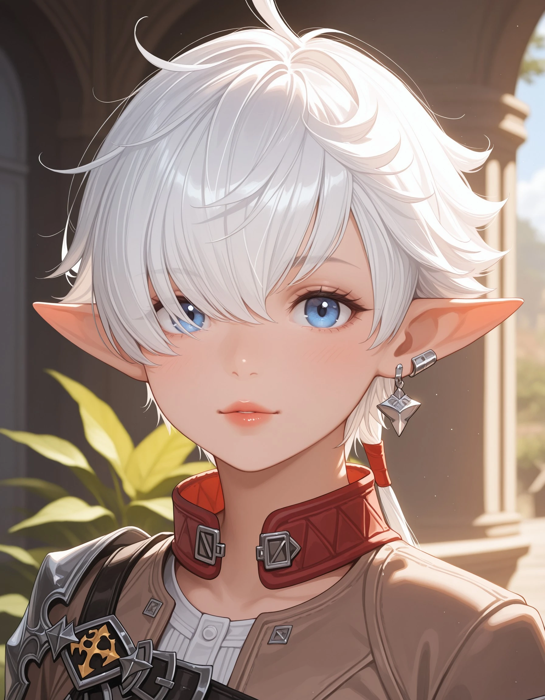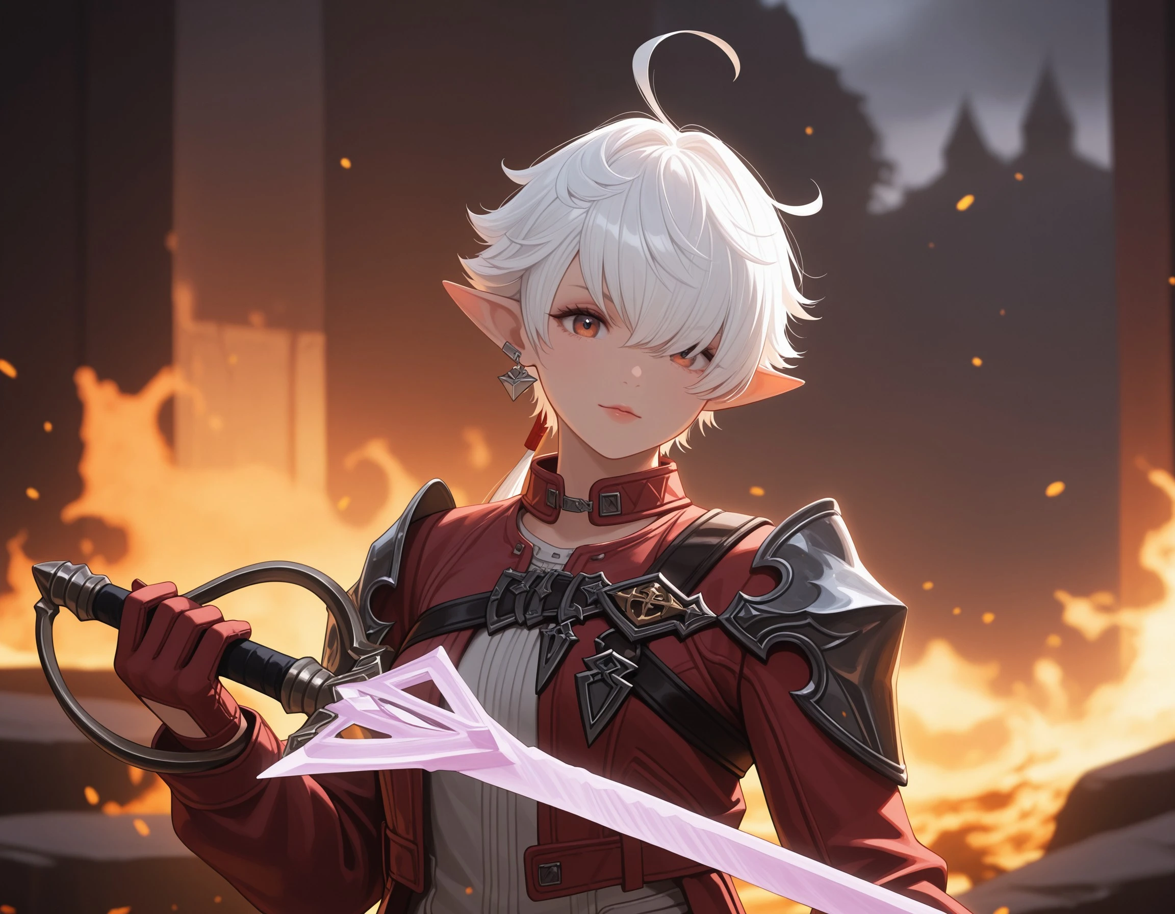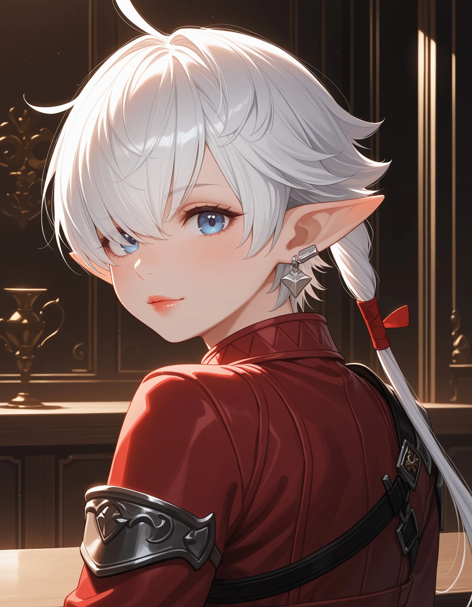 In Final Fantasy XIV: Endwalker, Alisaie receives a new outfit comprised of a white short jumpsuit, a cropped leather jacket with a longer trail in the back, and thigh high white boots with armored kneepads. The look is accessorized by her red leather gloves, red belts on her waistline, and a large dark blue belt across her chest.