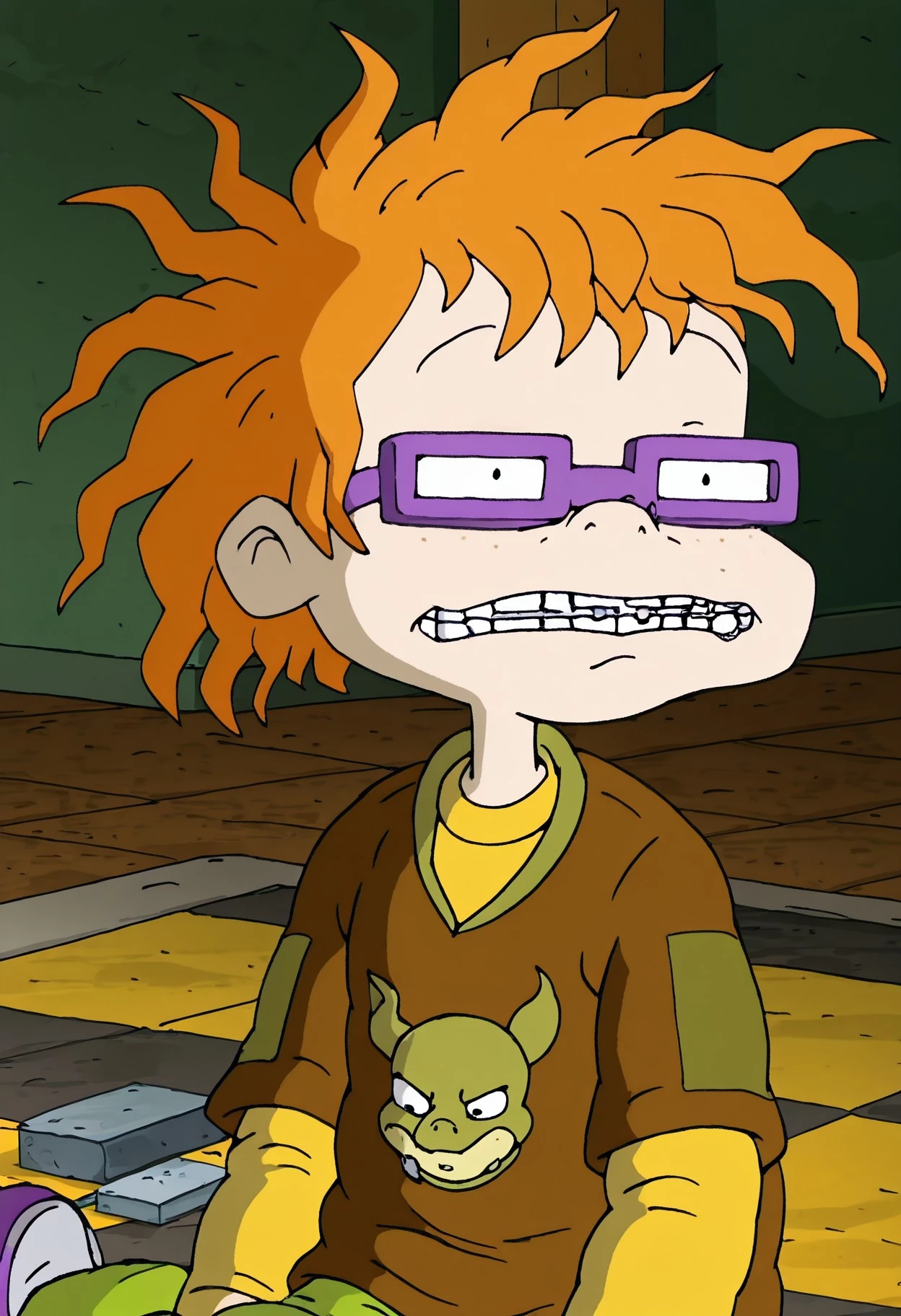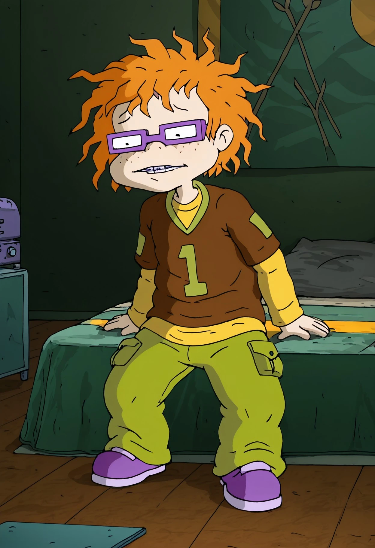 Chuckie, 1boy, solo, orange hair, Freckles, purple glasses, braces, brown shirt, yellow undershirt, green army pants, purple shoes