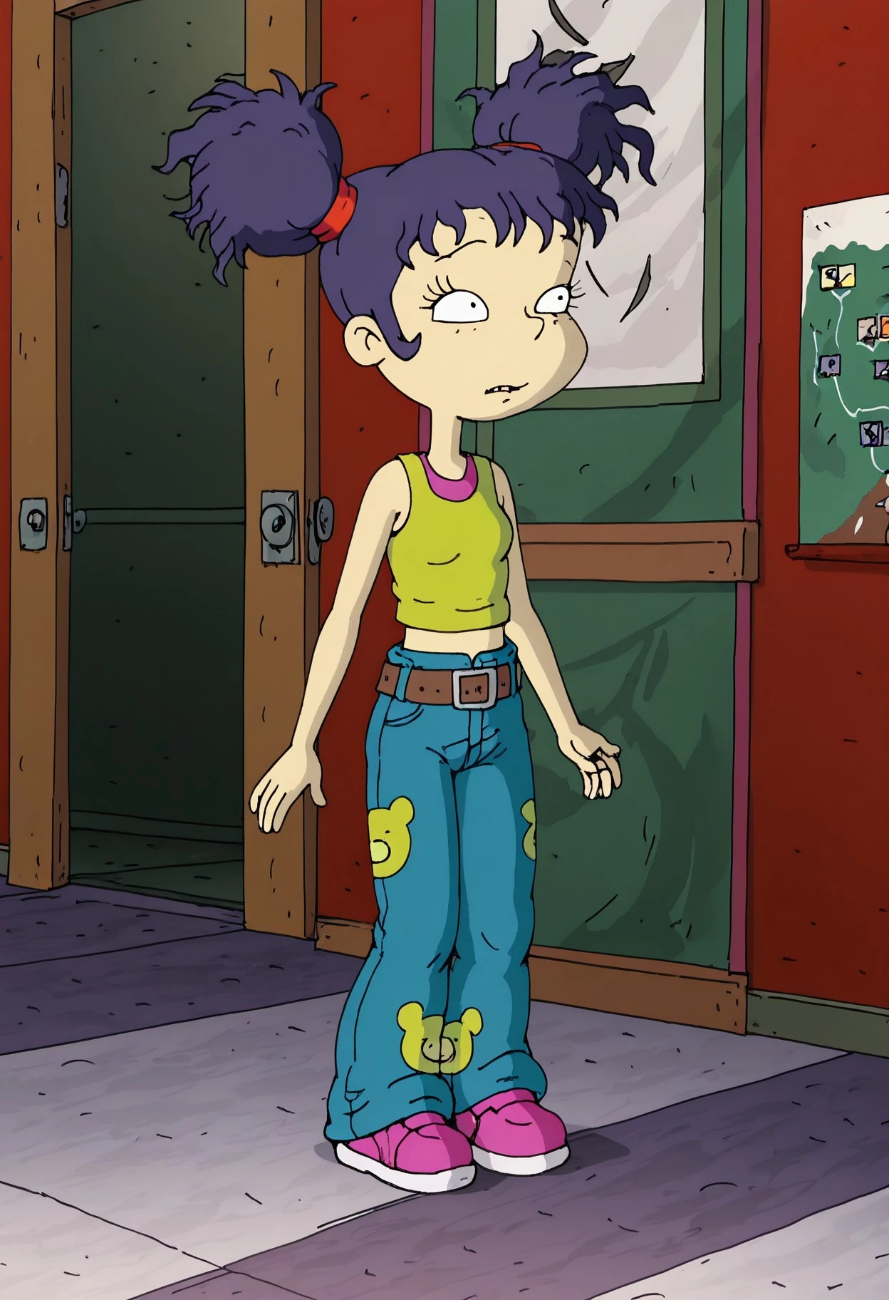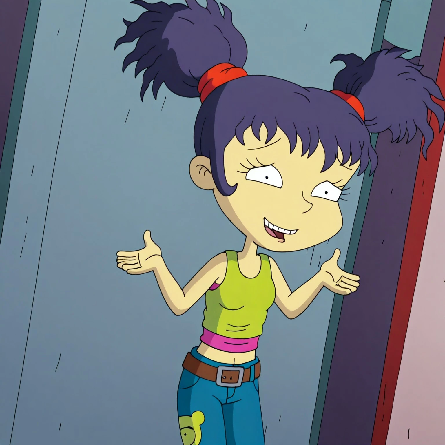 Kimi, 1girl, solo, dark purple hair, high messy pigtails, red hair ties, lime green crop top, pink undershirt, blue jeans, brown belt, pink shoes