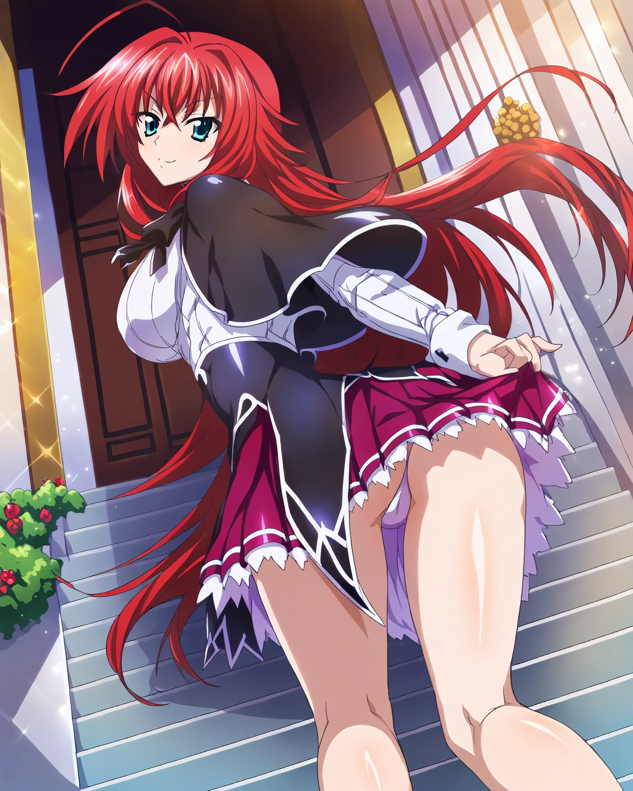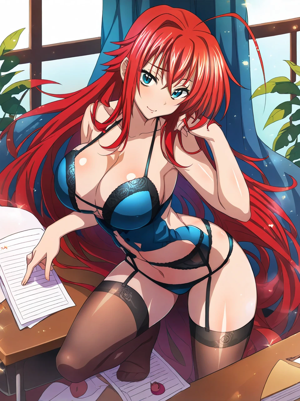 riasmobage, 1girl, solo, long hair, red hair, ahoge, blue eyes, hair between eyes, breasts, large breasts,