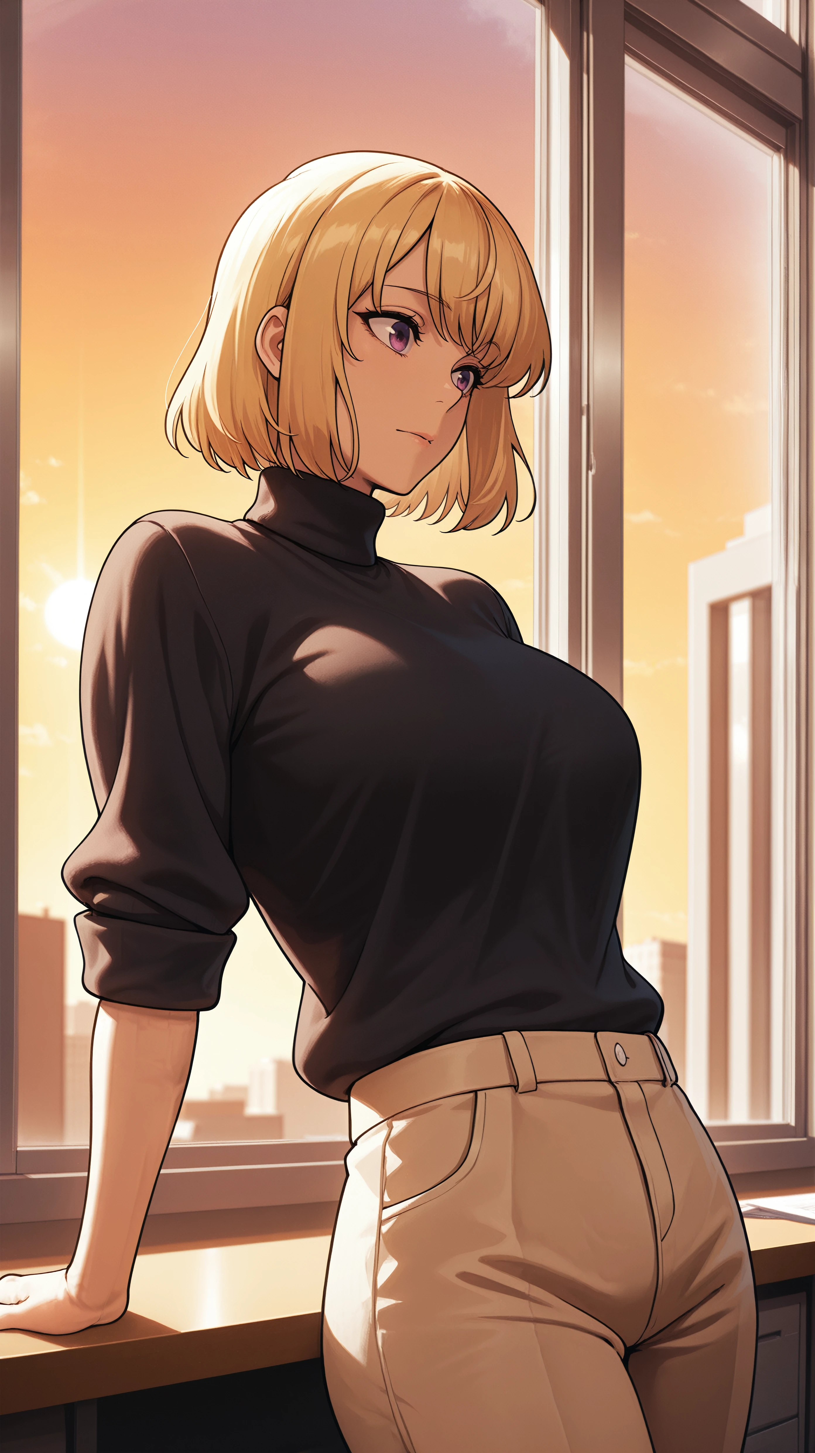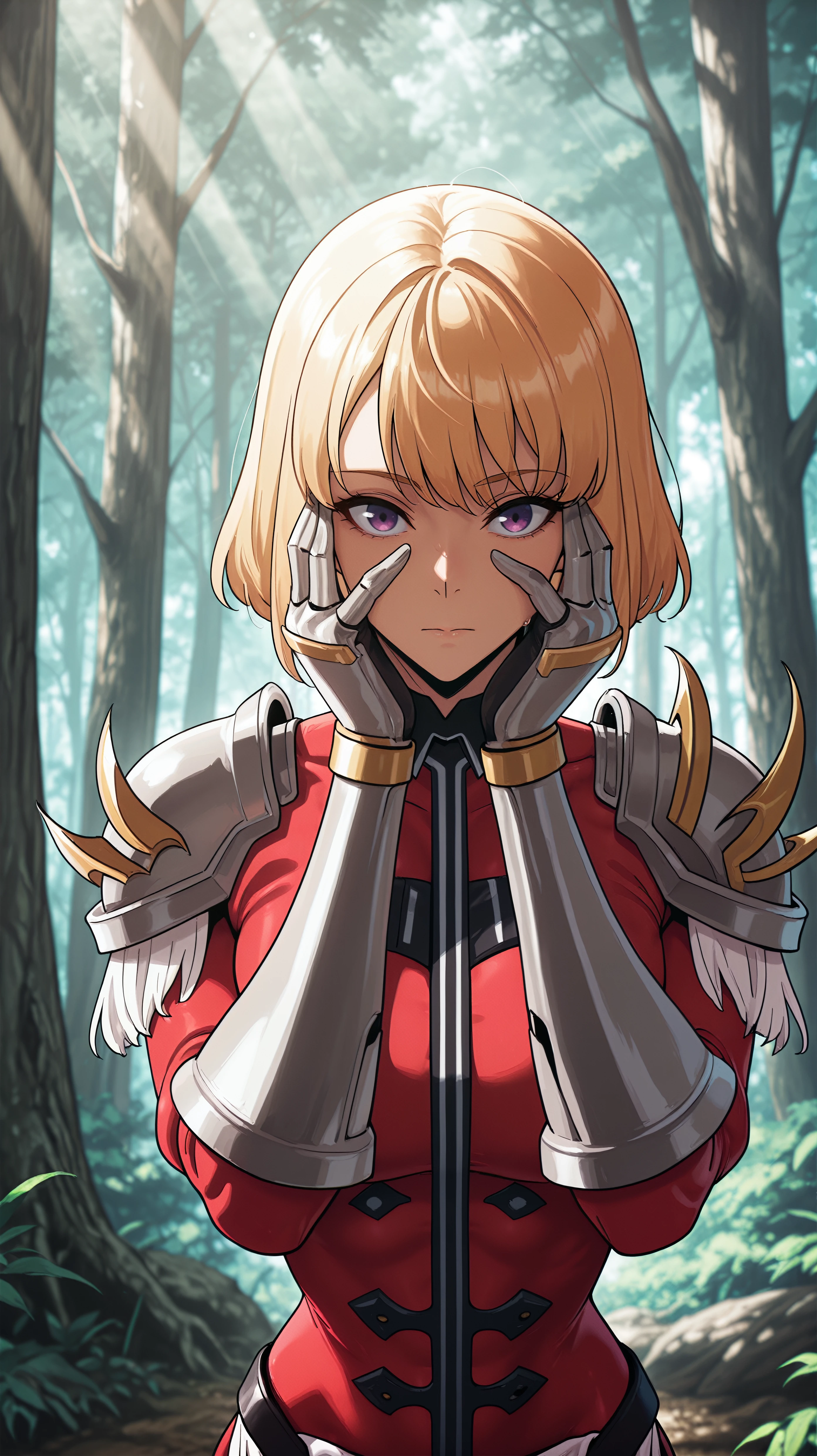 hae_in_cha_sl, blonde hair, bangs, purple eyes, red bodysuit, high collar, black collar, grey shoulder pads, armored gloves, pelvic curtain, red sleeves, red pants,Description