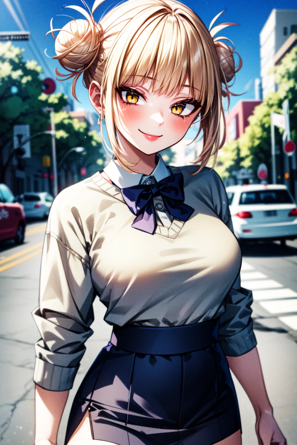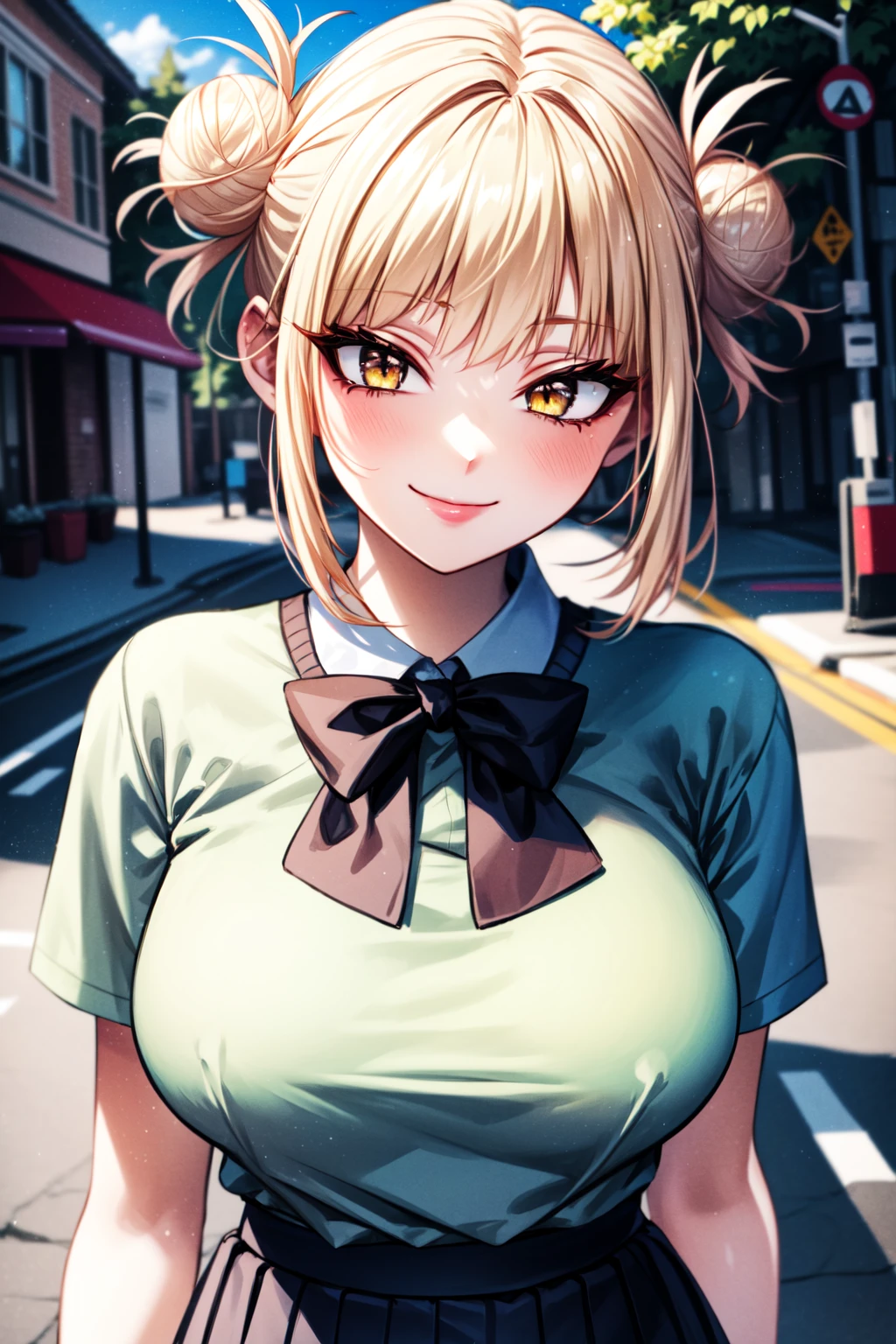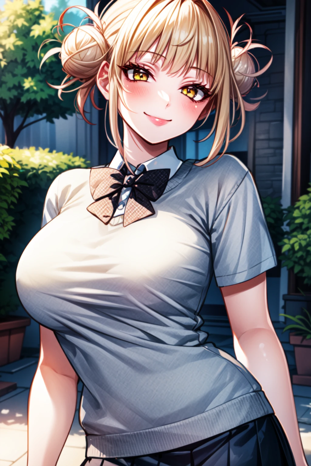 TogaHimiko_NDV, 1girl, yellow eyes, blonde hair, large breasts, short hair, double bun, hair bun, messy hairBest weight: 0.6-0.8