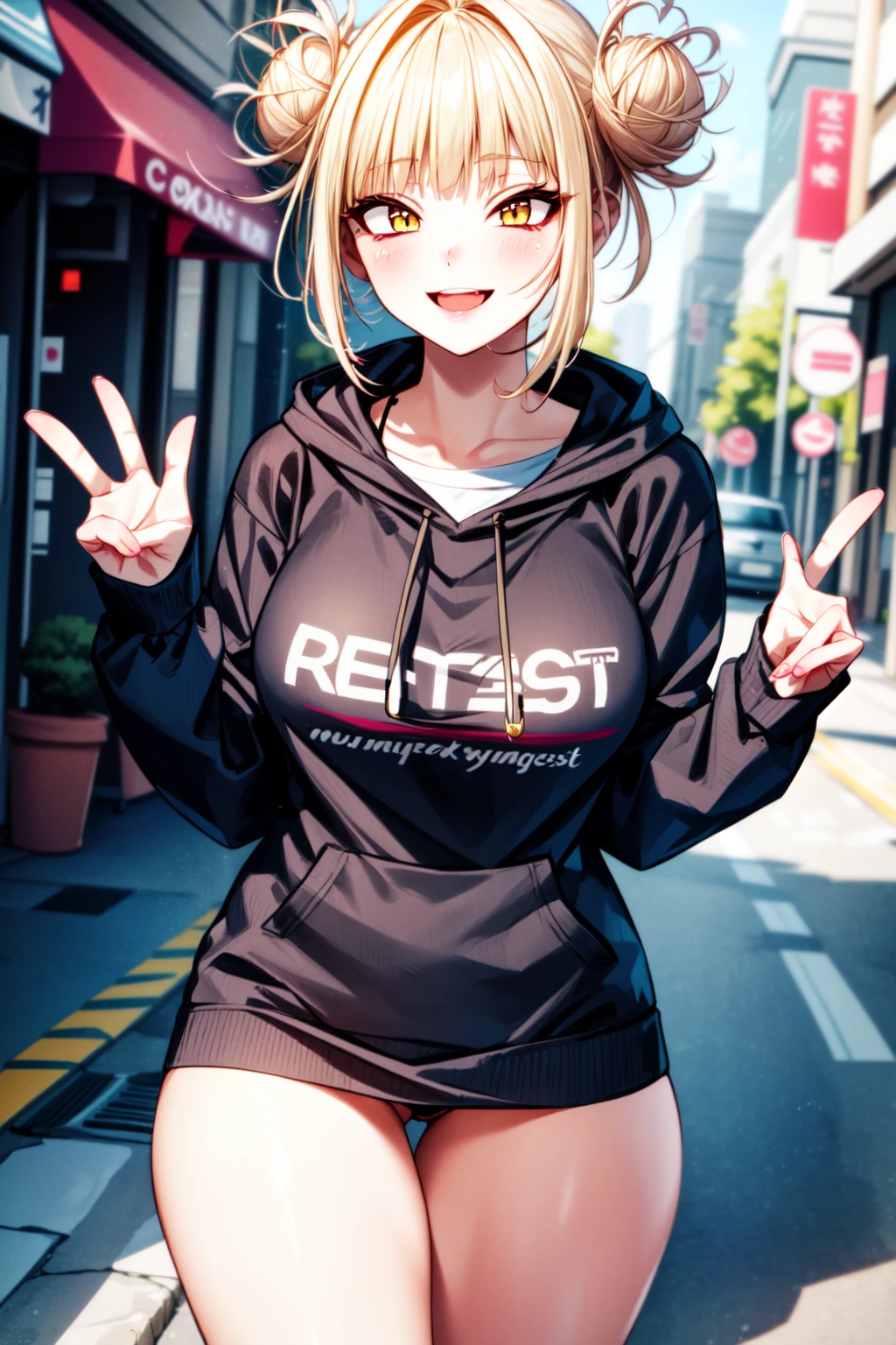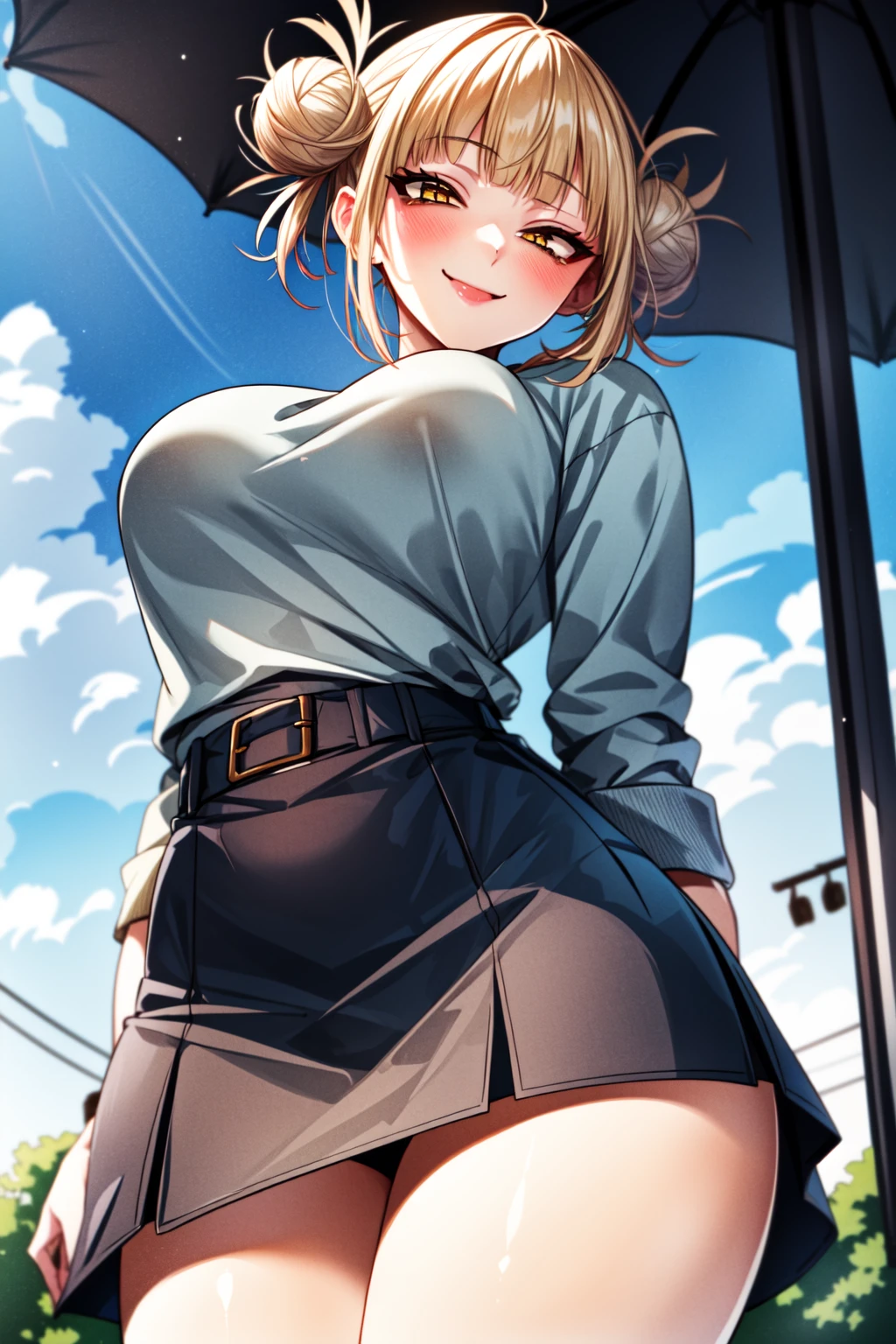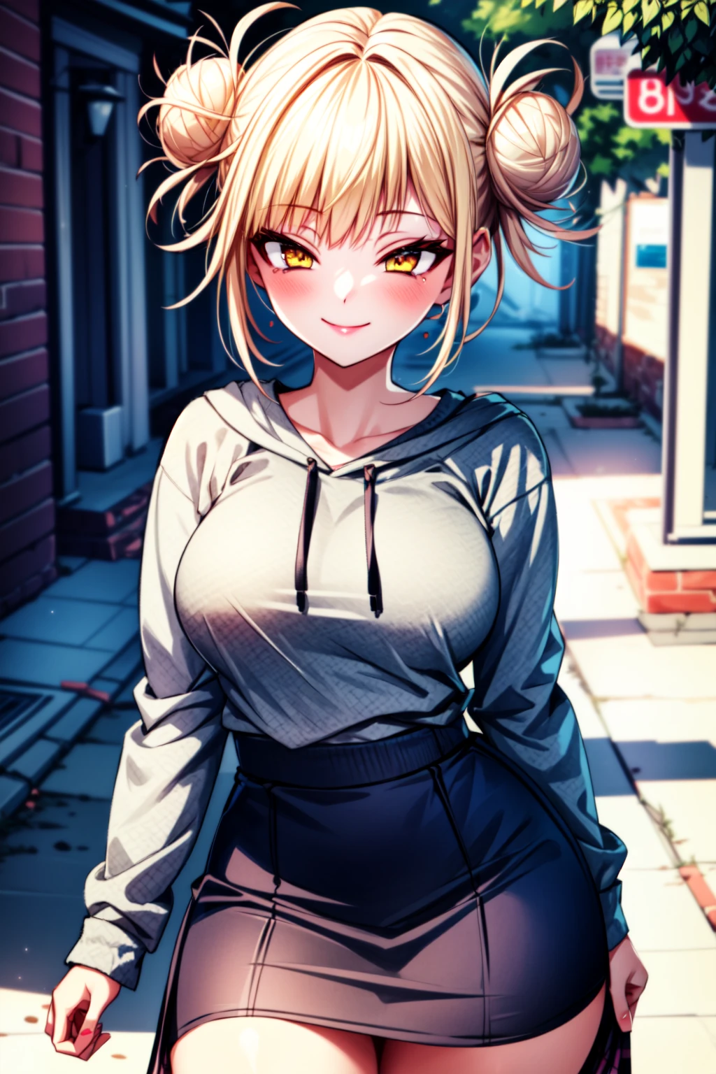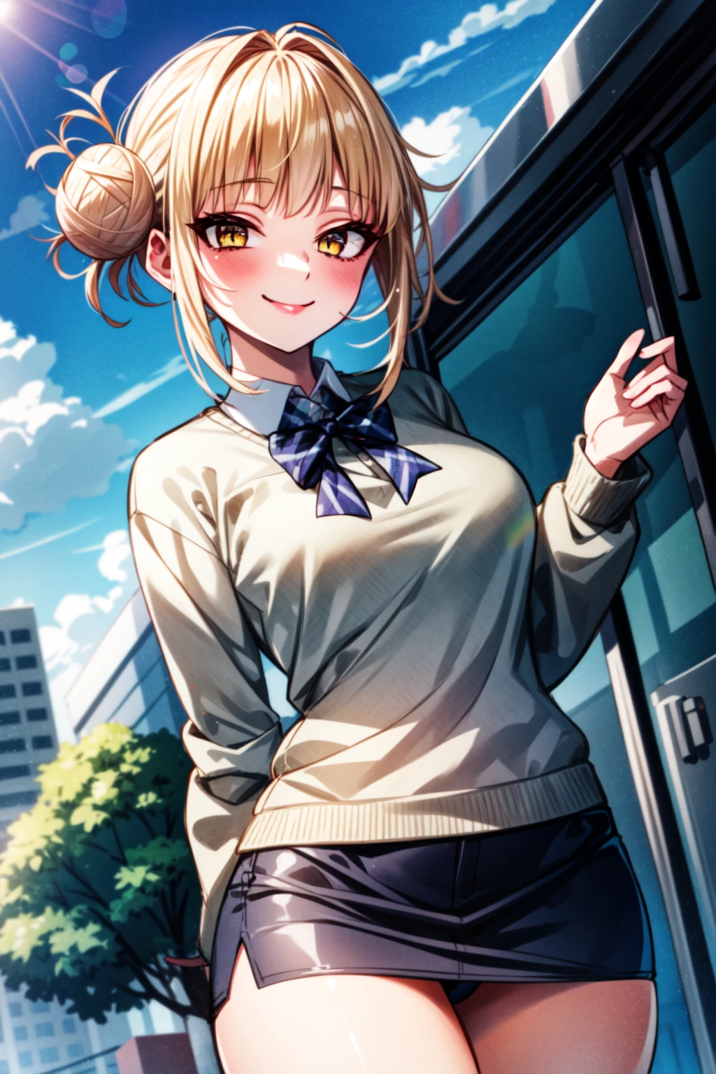 TogaHimiko_NDV, 1girl, yellow eyes, blonde hair, large breasts, short hair, double bun, hair bun, messy hairBest weight: 0.6-0.8