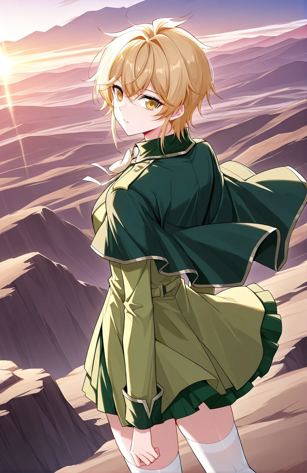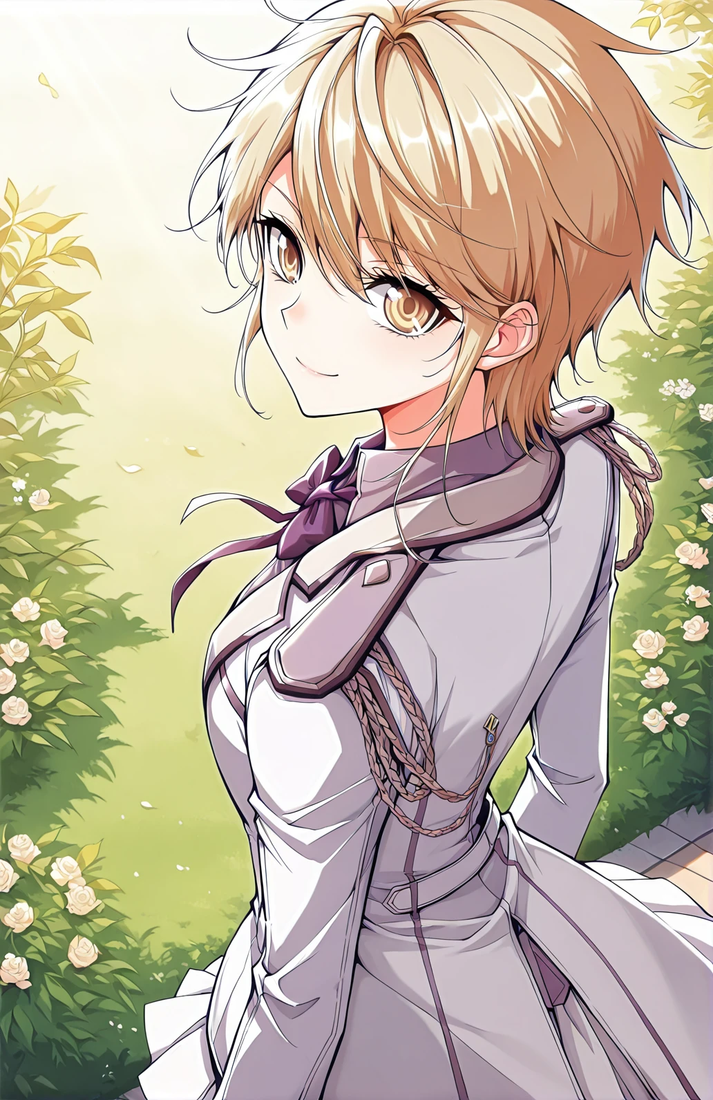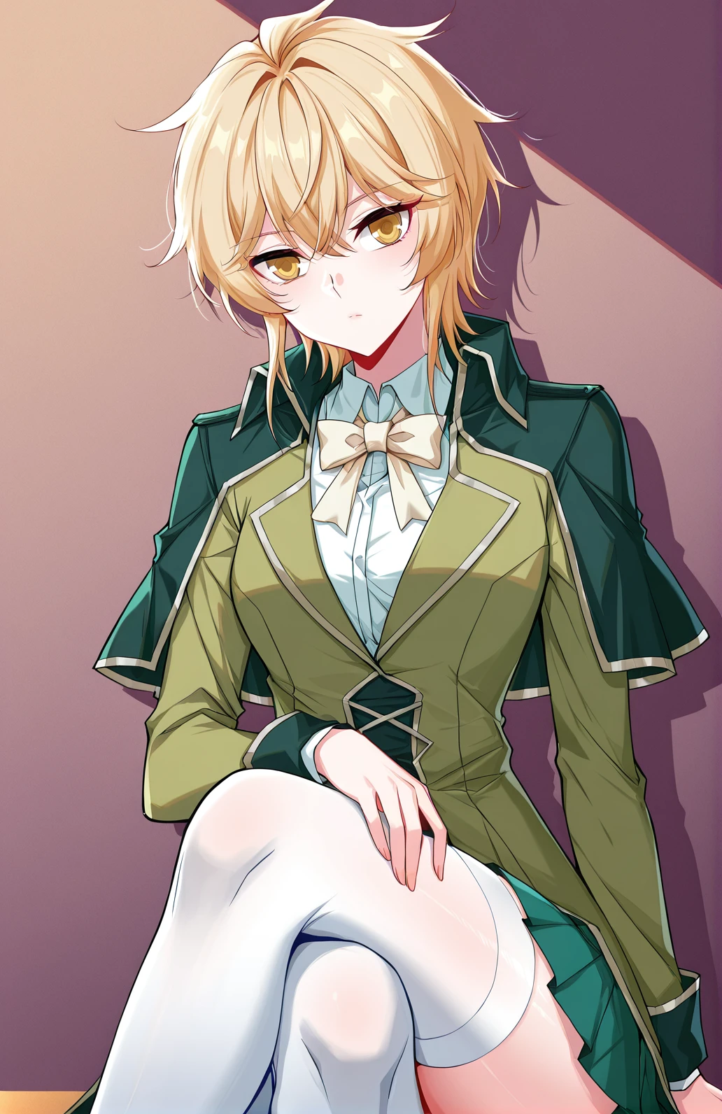 Tian, 1 girl, solo, short hair, golden hair, layered hair, messy hair tufts, long side bangs, golden eyes,
