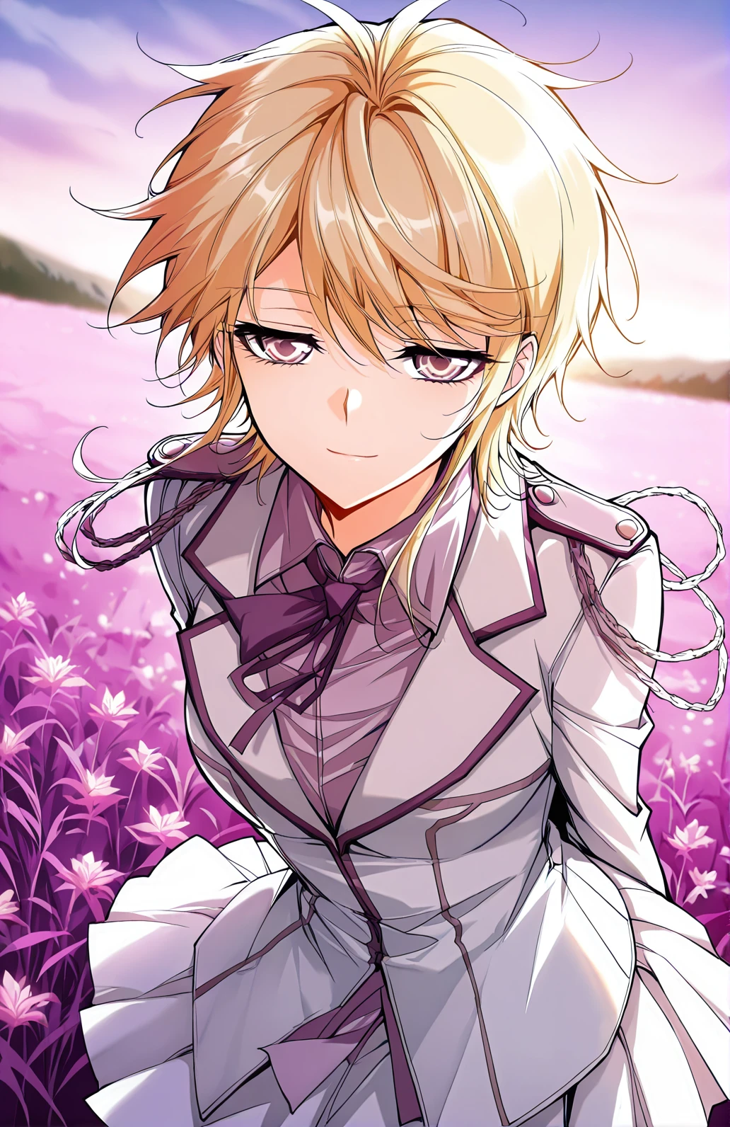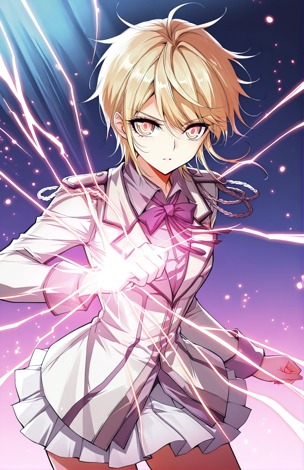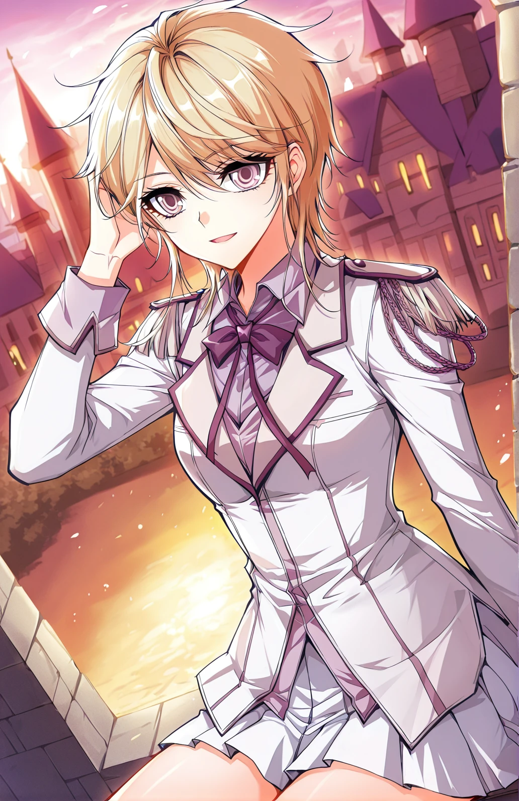 Tian_outfit2, white jacket, fitted jacket, purple accents, lapel collar, purple bowtie, shoulder epaulets, ornamental chains, pleated skirt, short skirt, white skirt, white shirt, long sleeves