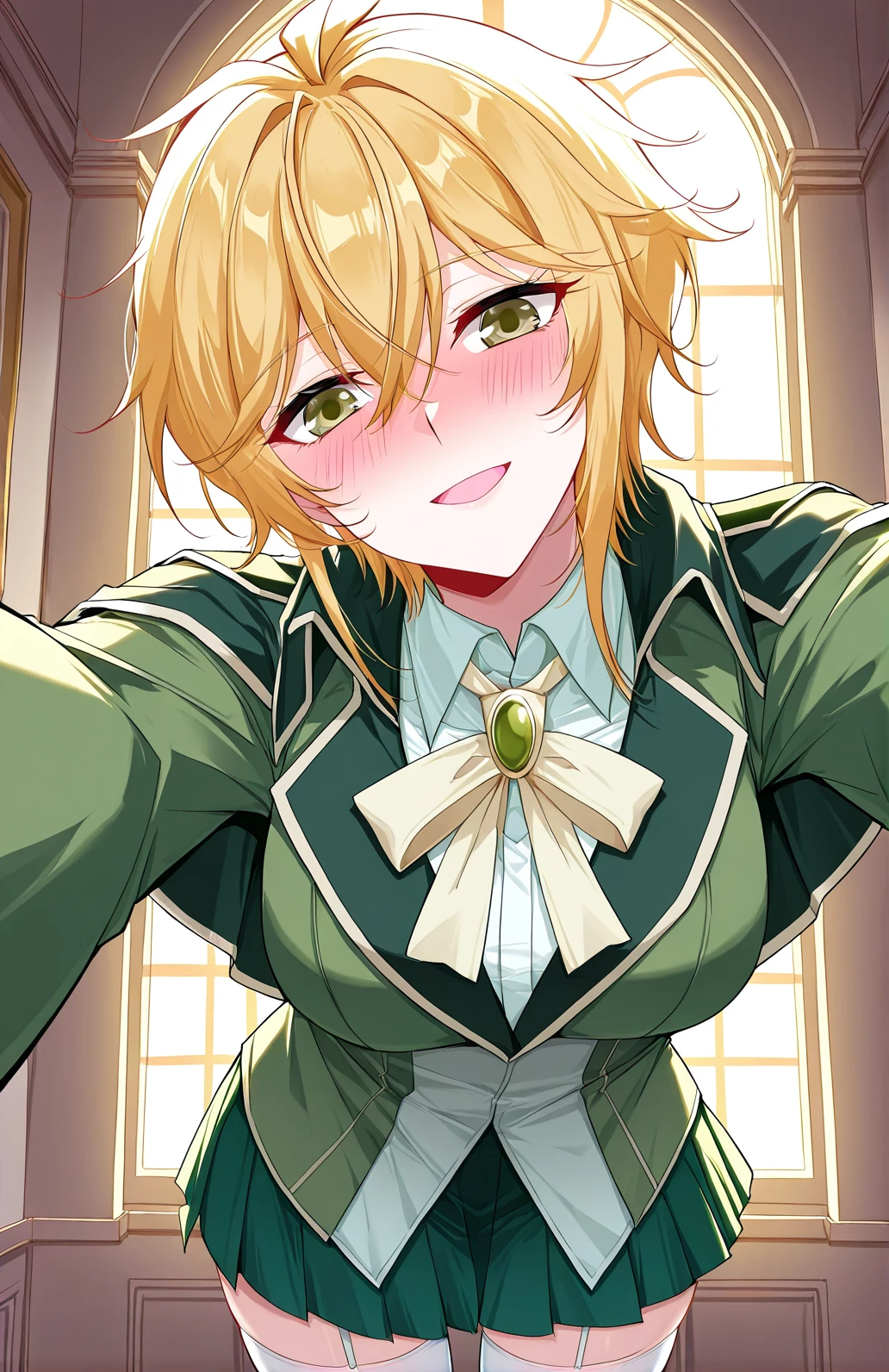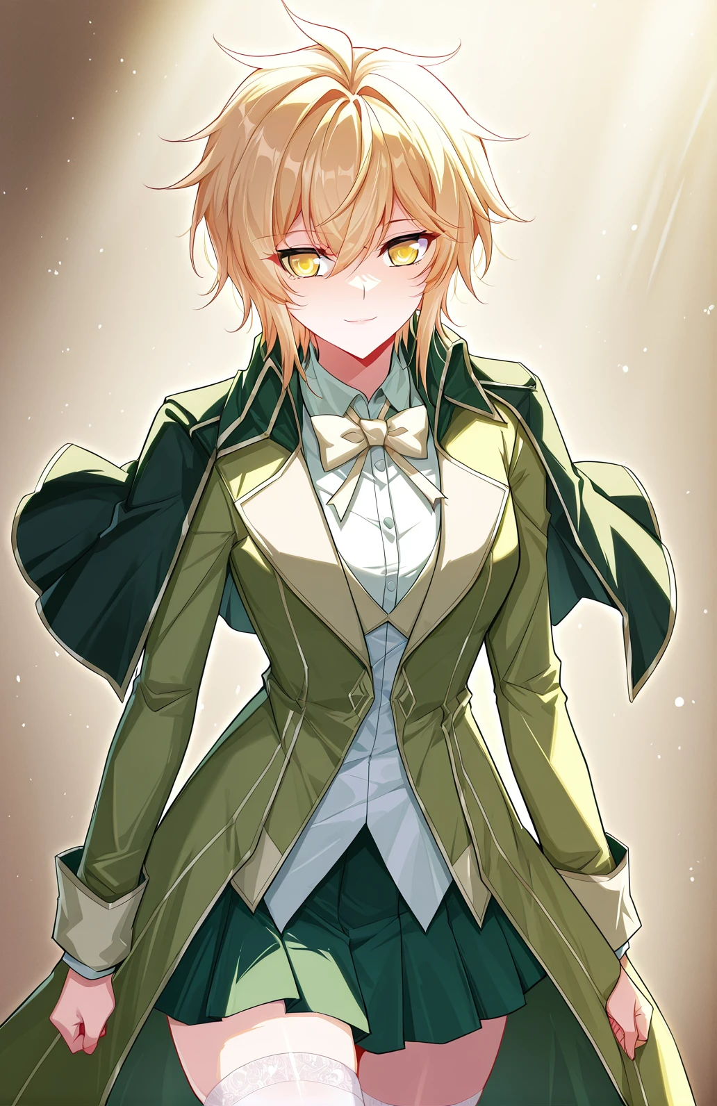 Tian_outfit1, green blazer, dark green collar, capelet-style collar, pale beige trim, light olive front panel, green pleated skirt, white dress shirt, cream bow, white thighhighs