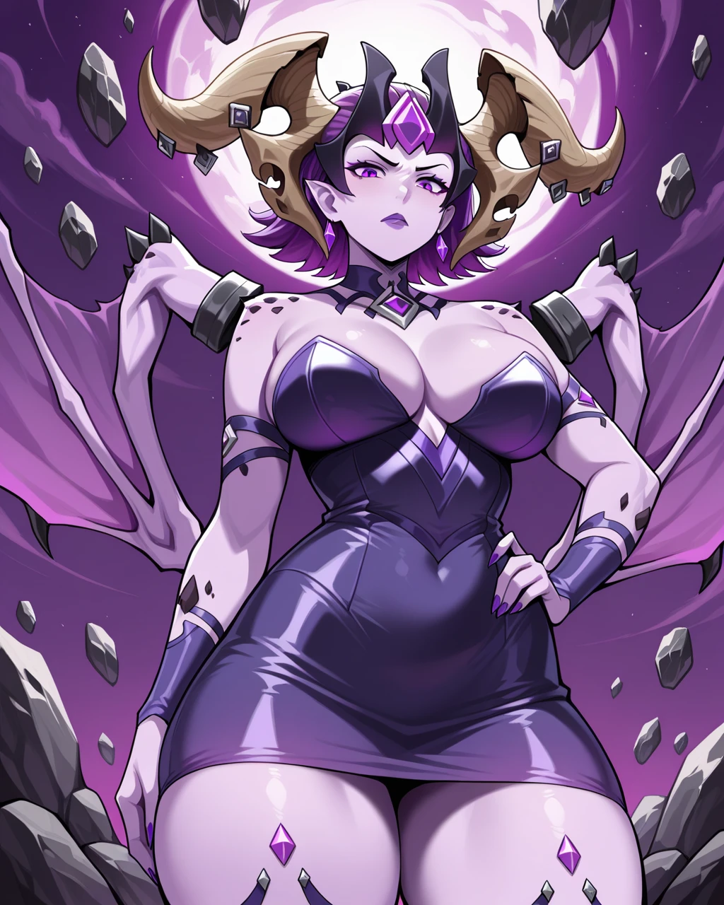 horns, wings, strapless minidress, purple hair, purple lips,