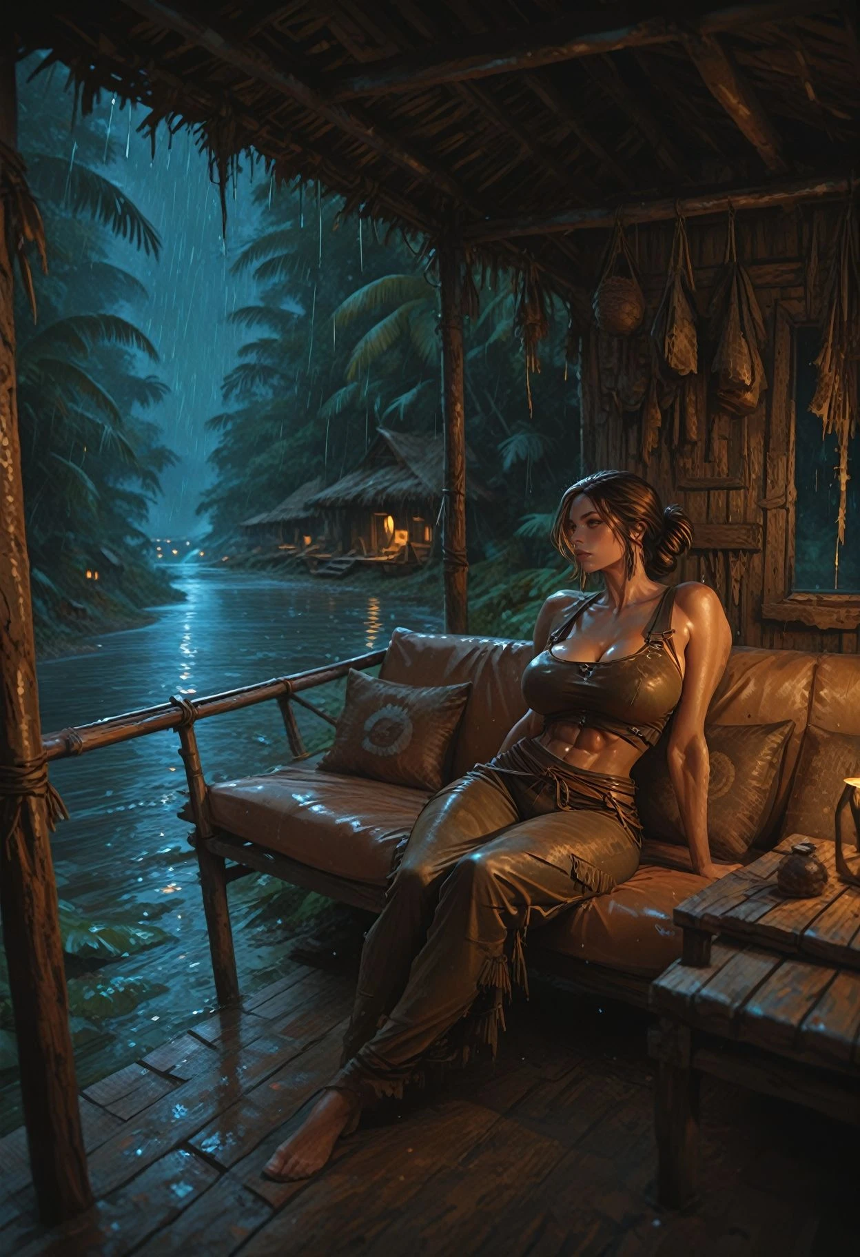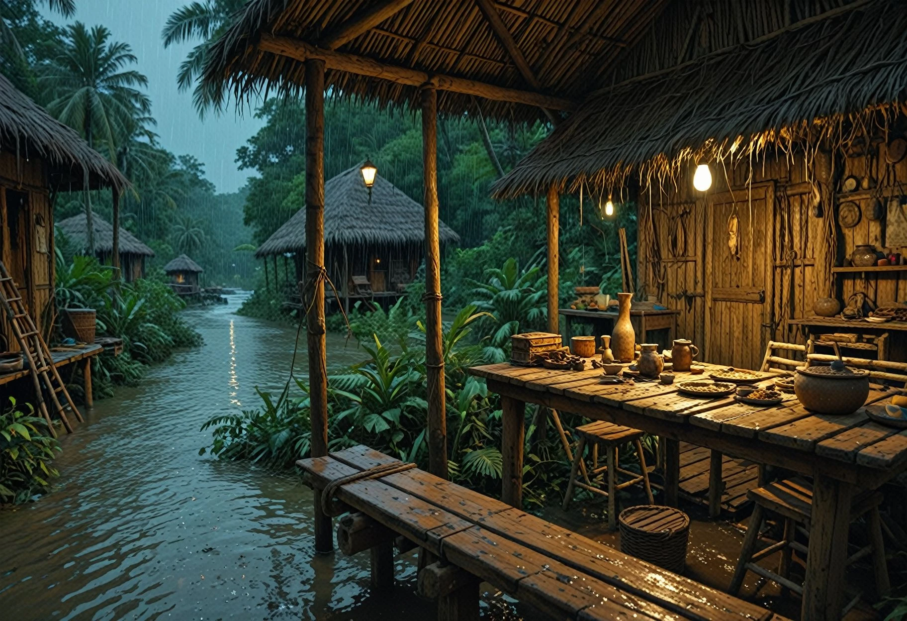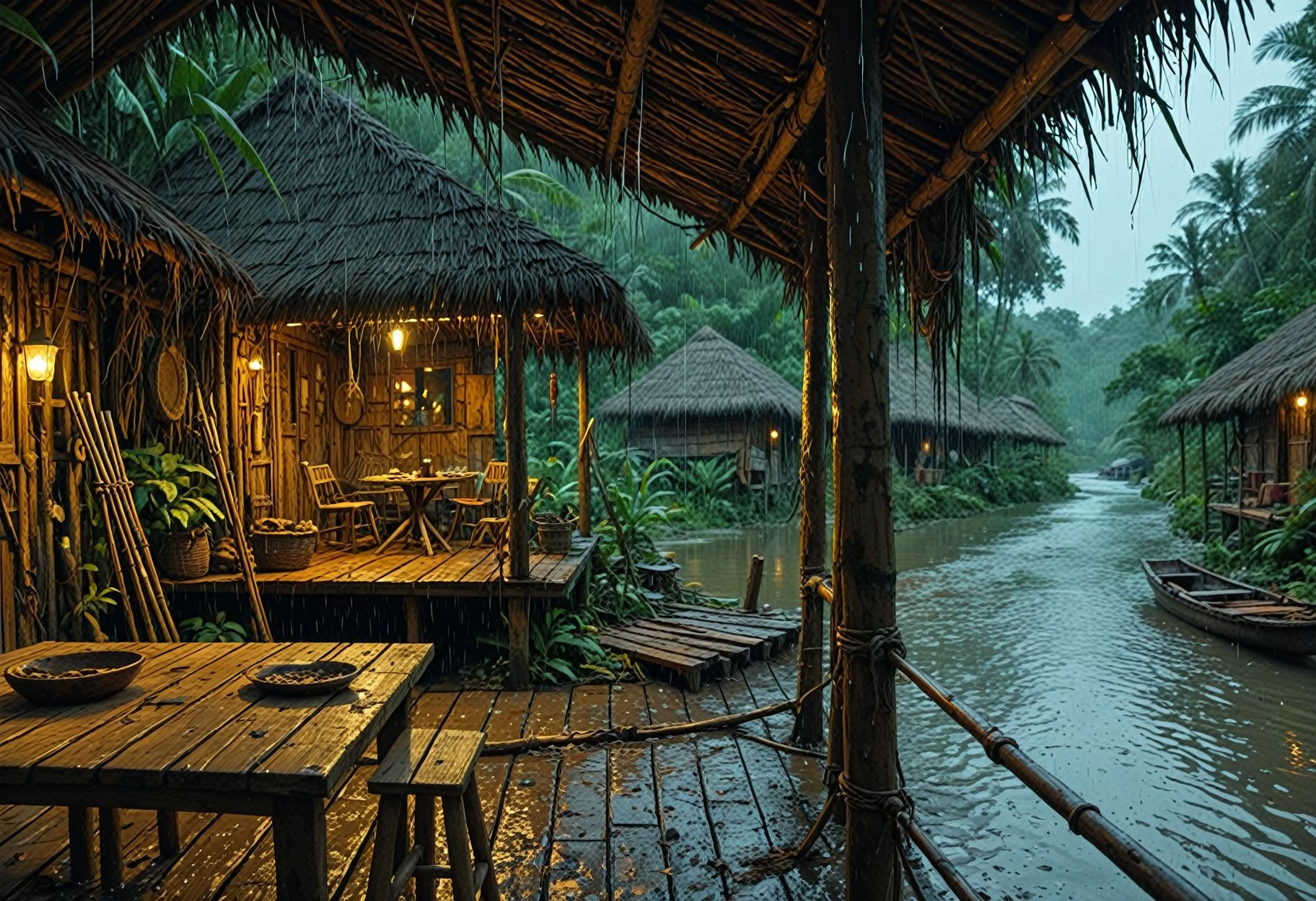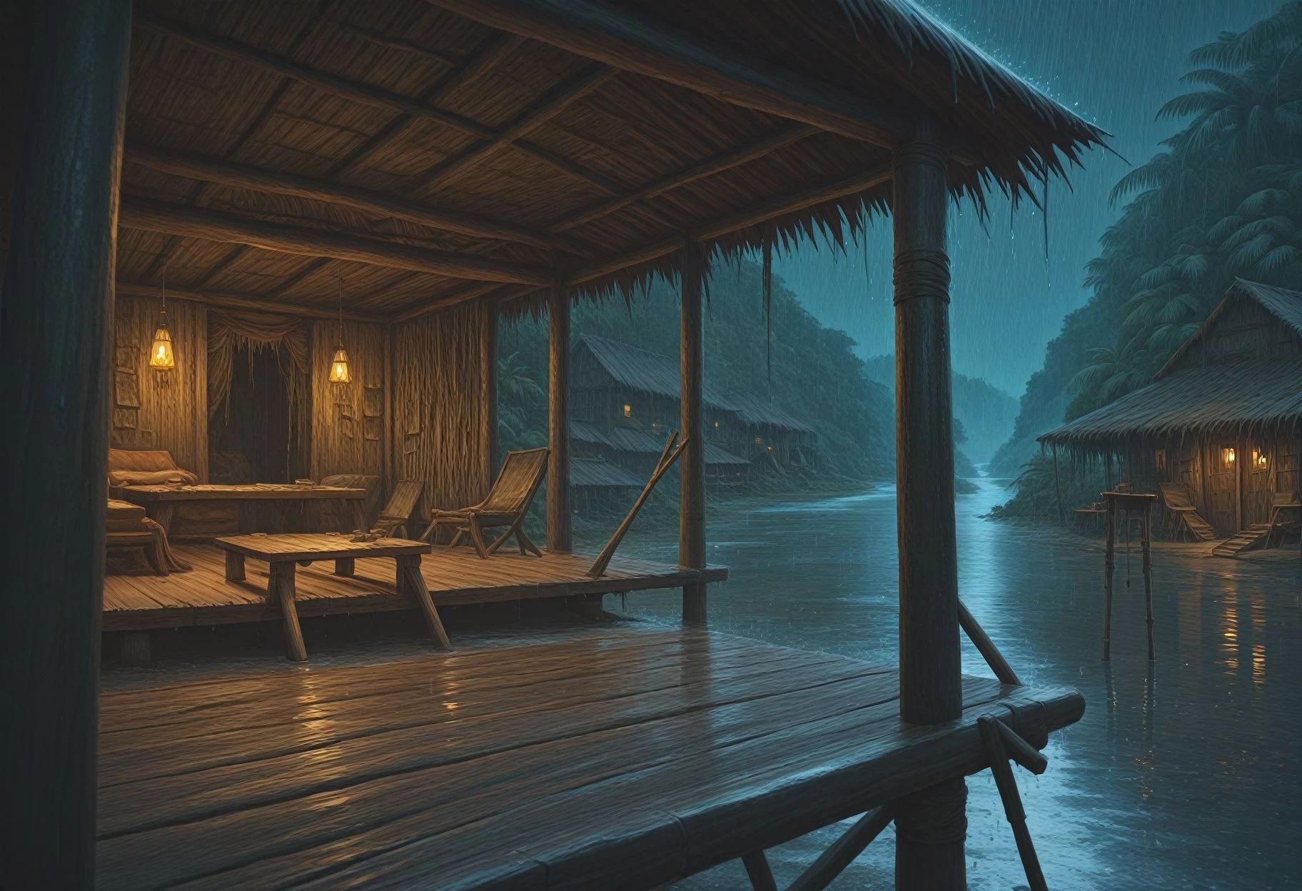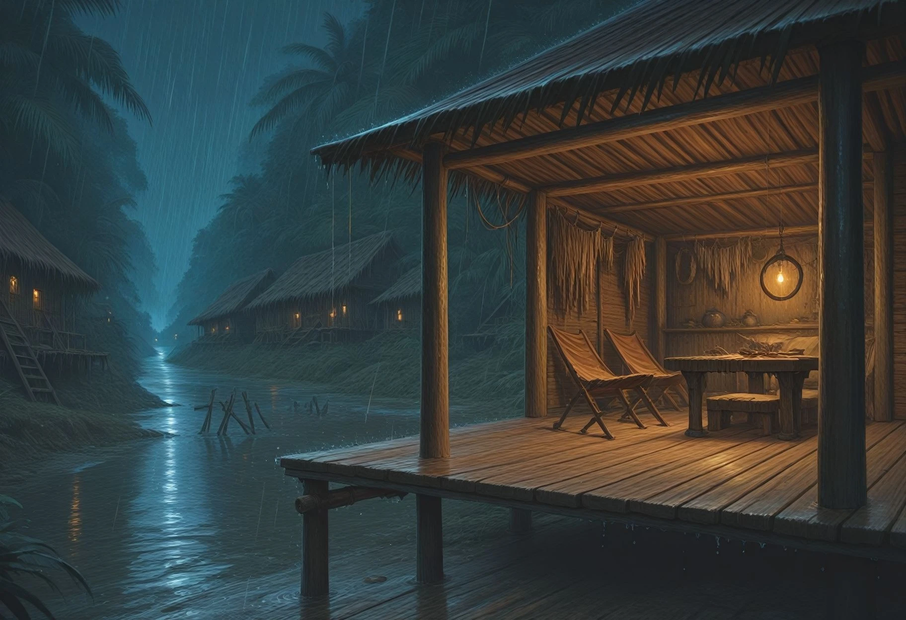 A lora for setting the scene on a porch in a village by a river in a jungle.