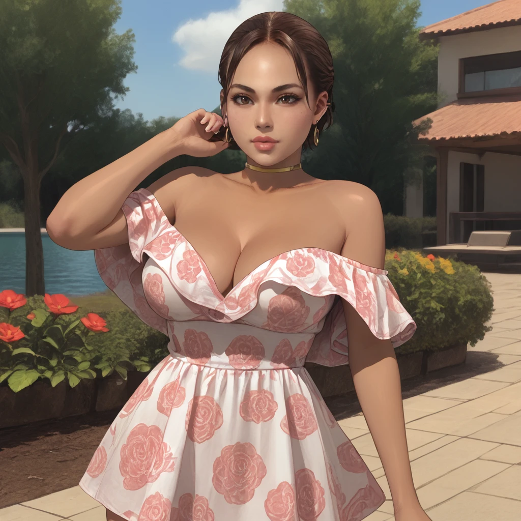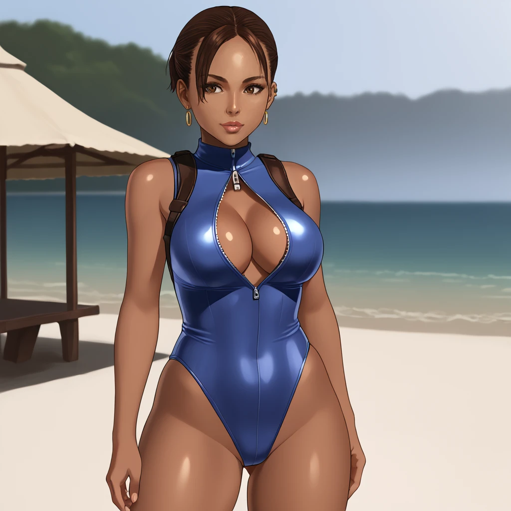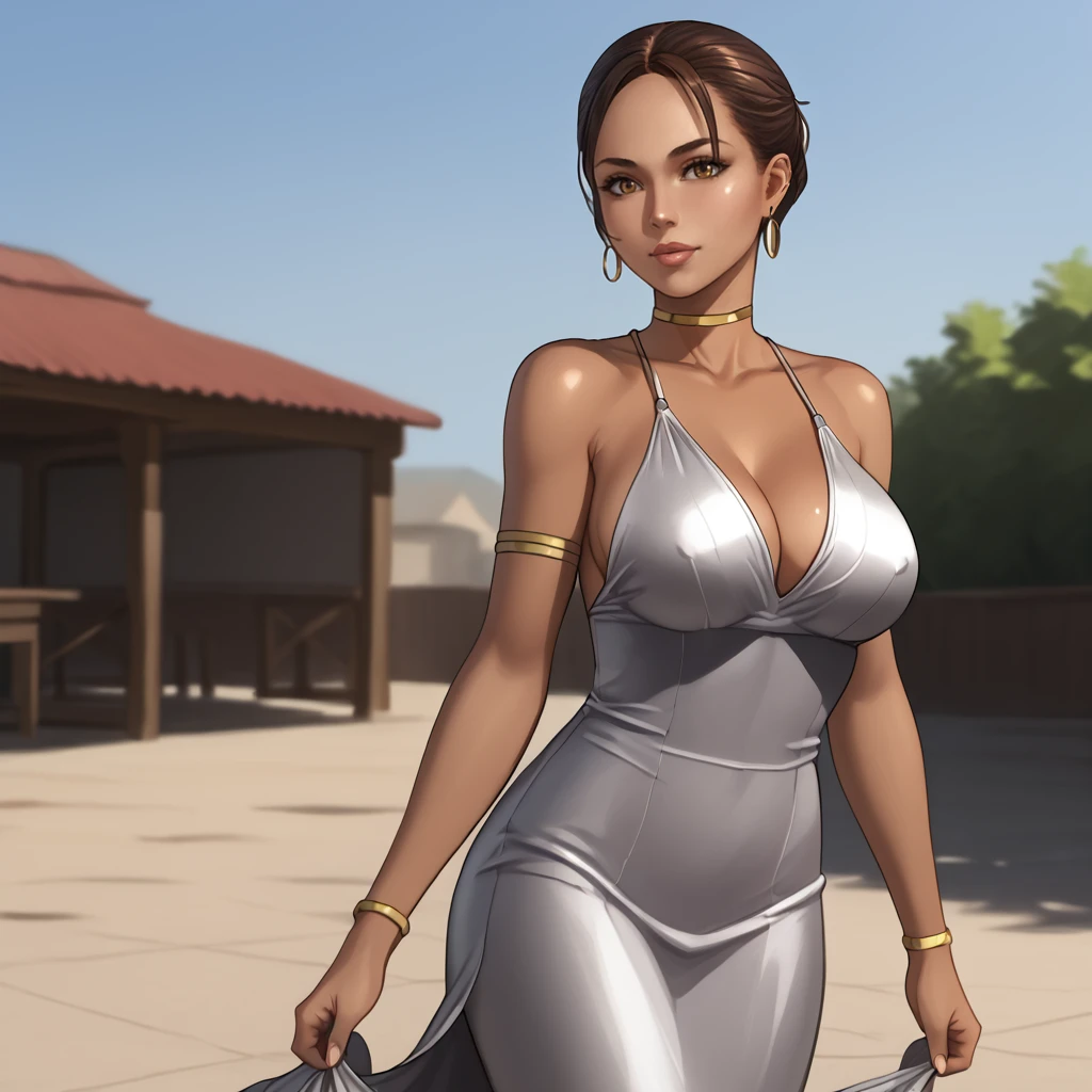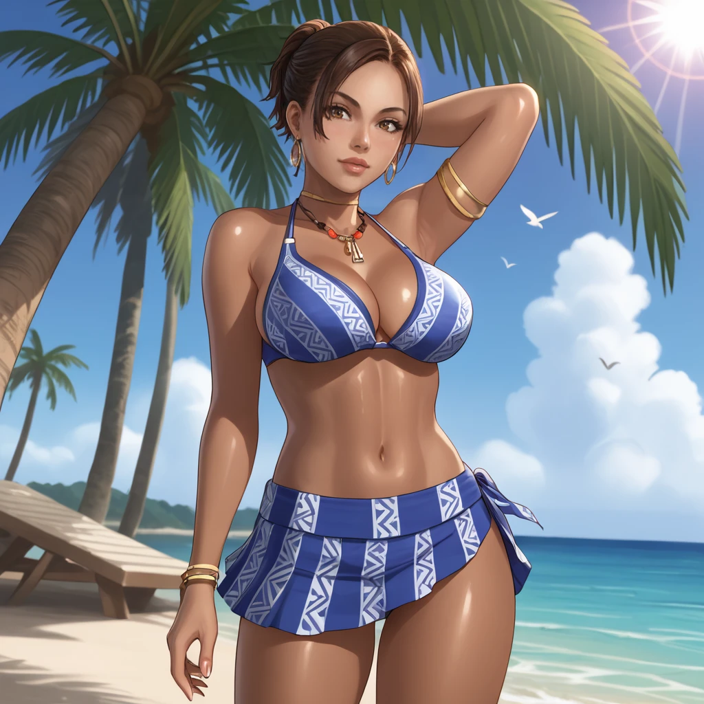 Trigger : shevaalomar, 1girl, fingerless gloves, medium breasts, belt, cleavage, dark-skinned female, dark skin, brown hair, jewelry, earrings, breasts, holster, tank top, ponytail, necklace, lips, short hair, armband, cowboy shot