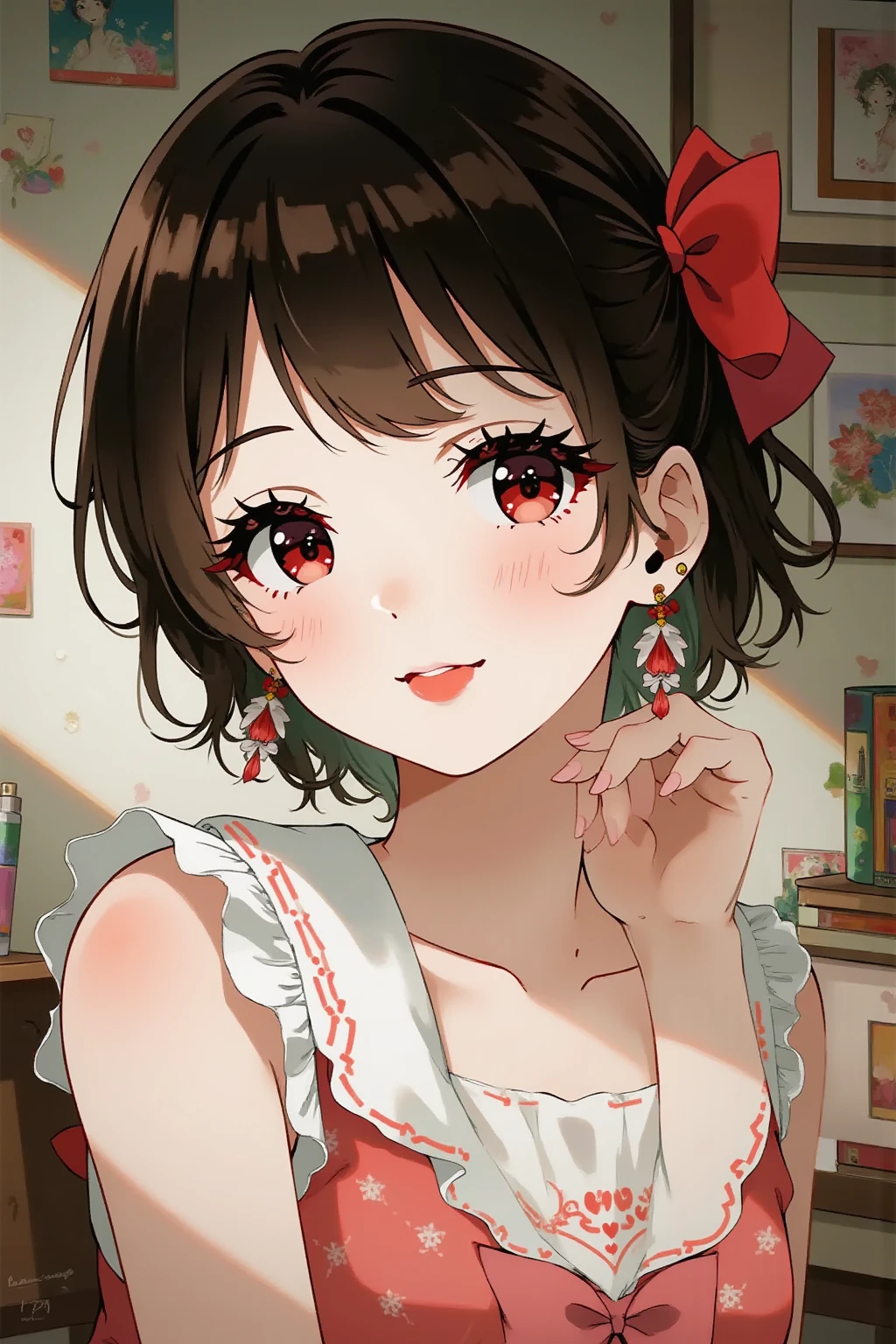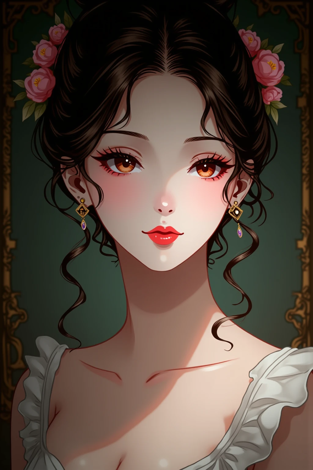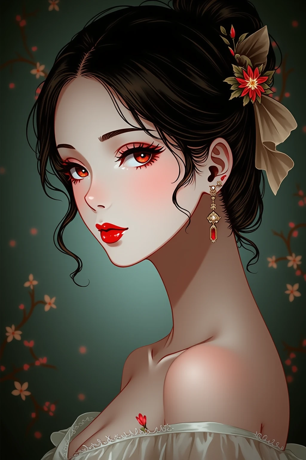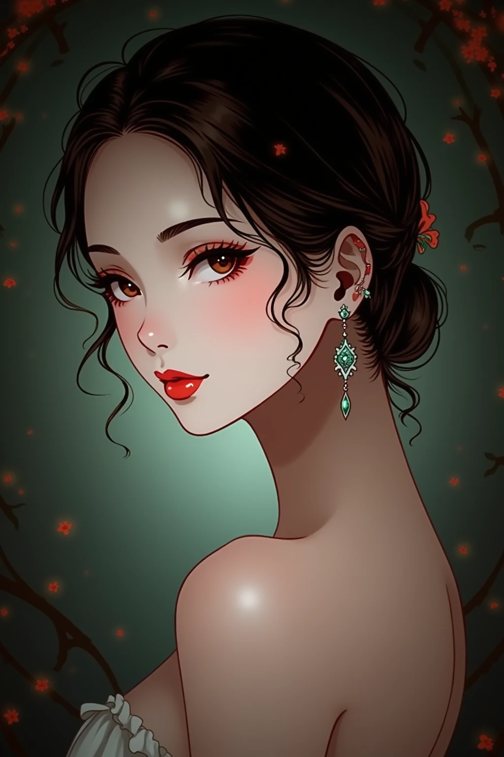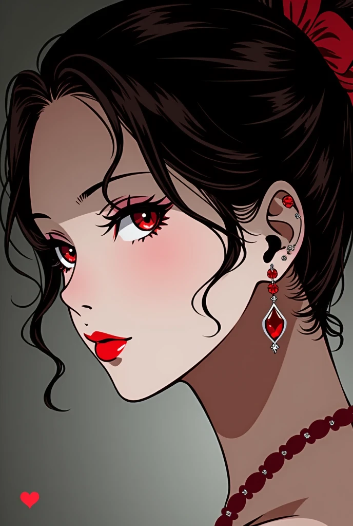 ポップアートアニメ顔、目立つ赤いアイメイクと赤い口紅をした女性のクローズアップの肖像画が描かれています。彼女の髪はゆるいカールにスタイリングされており、幾何学模様の垂れ下がるイヤリングを着けています。背景は落ち着いた緑色で、照明は柔らかく、彼女の顔の輪郭とイヤリングの複雑なディテールが際立っています。画像のスタイルはポップアートを彷彿とさせ、大胆な線と動きとエネルギーの感覚を呼び起こす鮮やかな色彩を備えています。