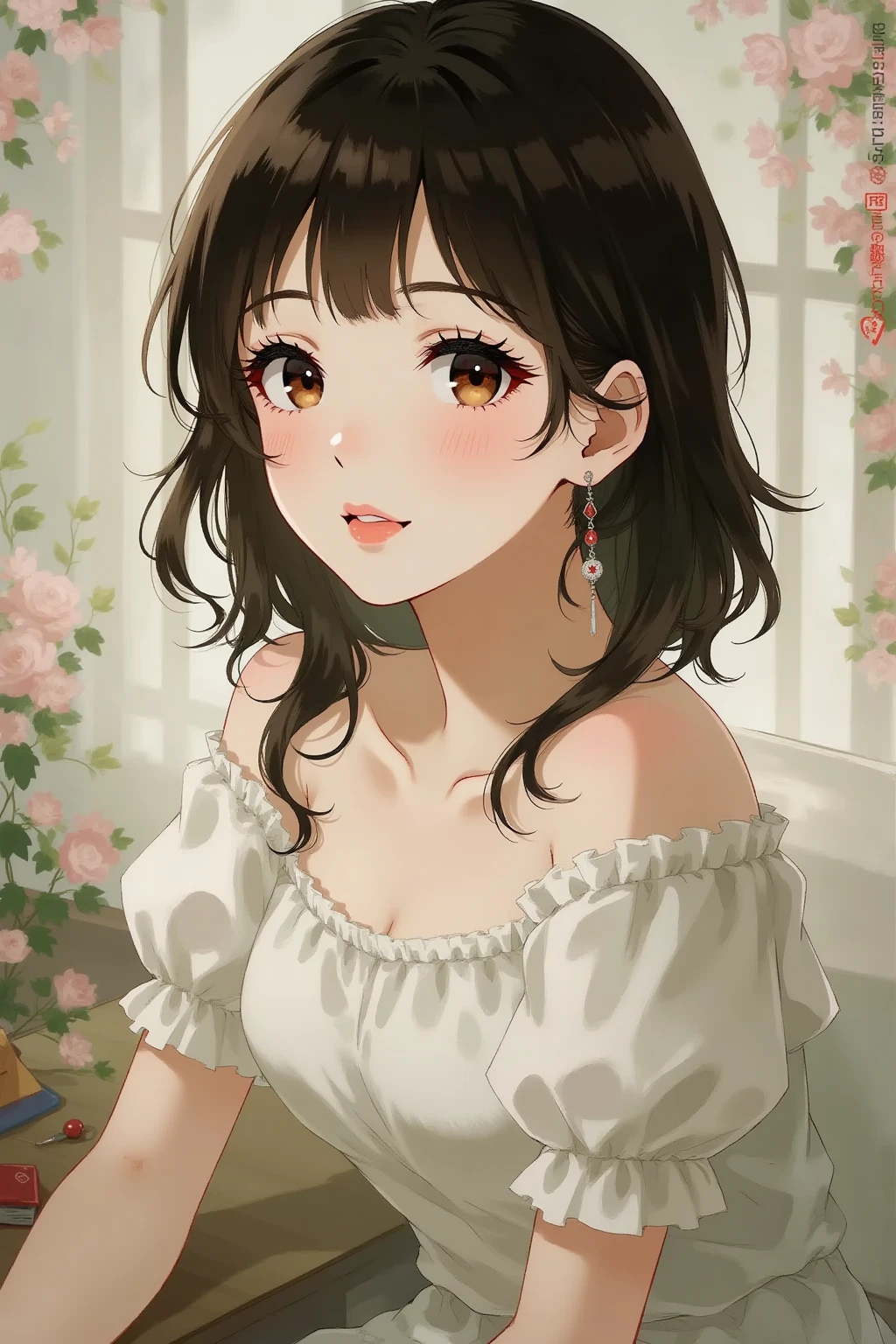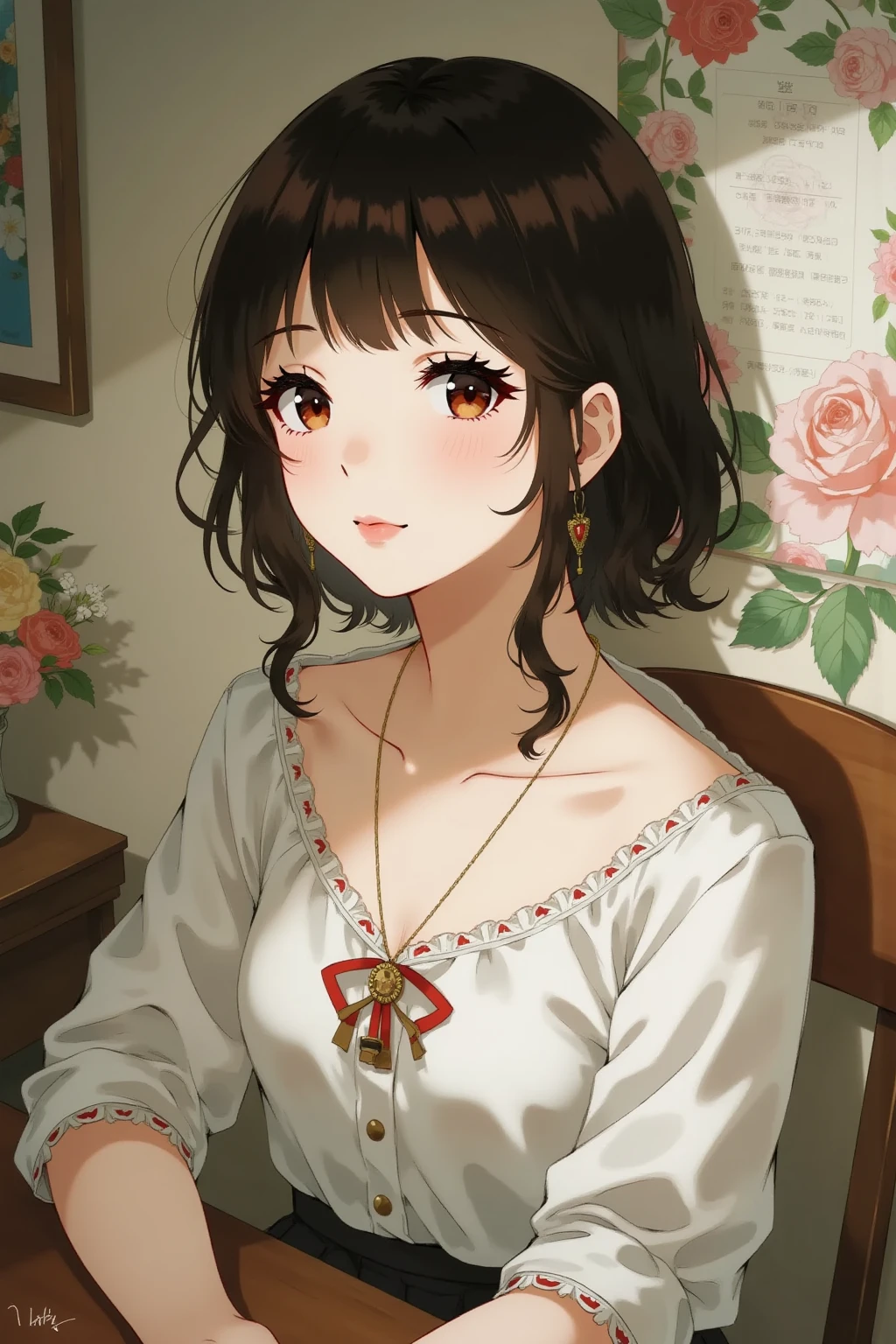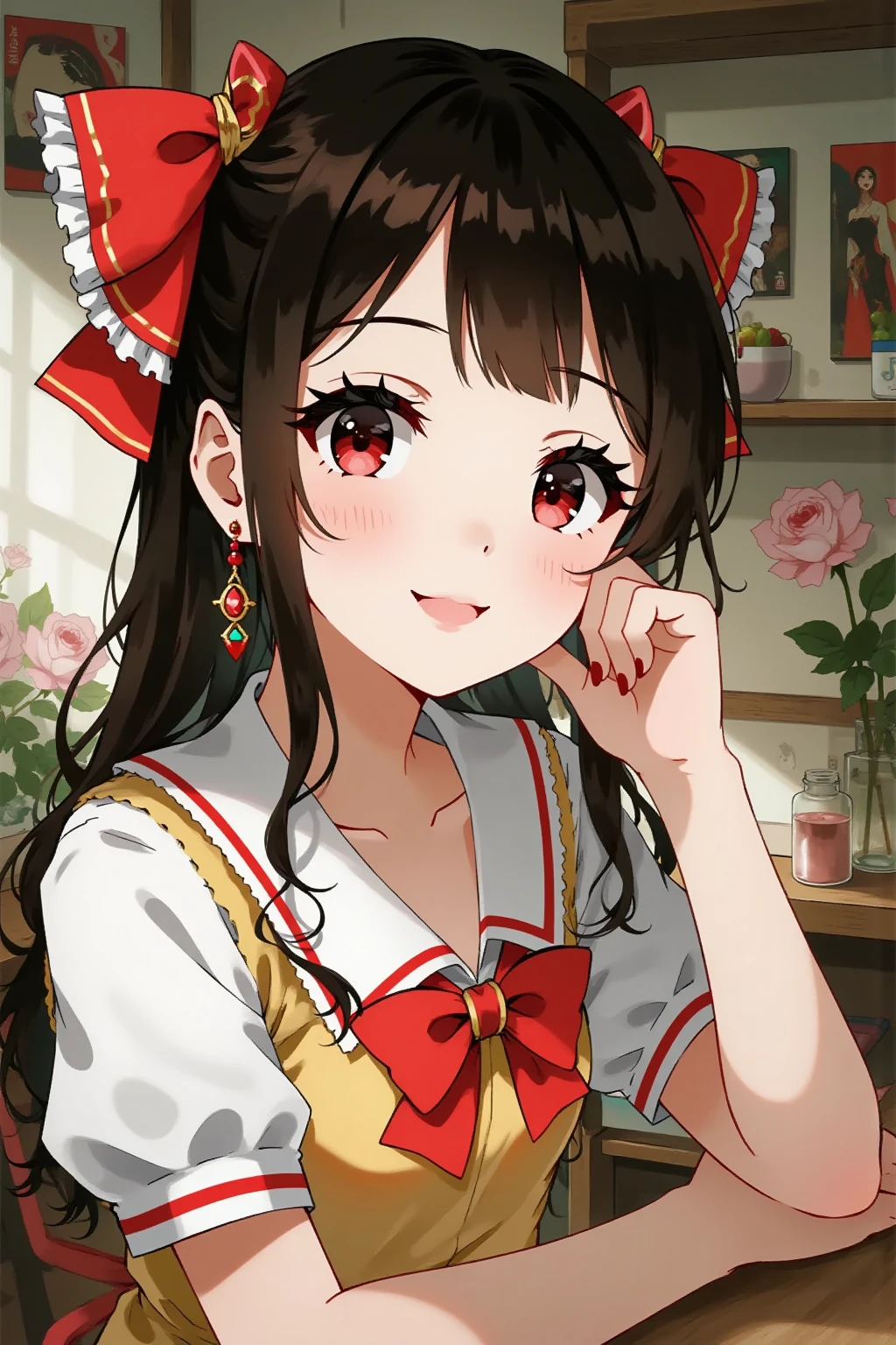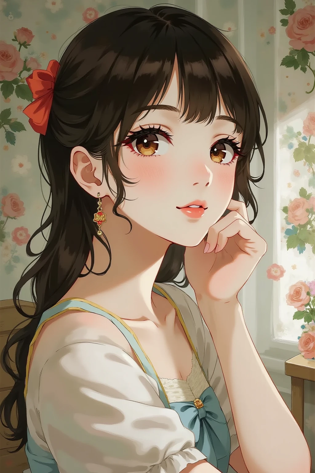 ポップアートアニメ顔、目立つ赤いアイメイクと赤い口紅をした女性のクローズアップの肖像画が描かれています。彼女の髪はゆるいカールにスタイリングされており、幾何学模様の垂れ下がるイヤリングを着けています。背景は落ち着いた緑色で、照明は柔らかく、彼女の顔の輪郭とイヤリングの複雑なディテールが際立っています。画像のスタイルはポップアートを彷彿とさせ、大胆な線と動きとエネルギーの感覚を呼び起こす鮮やかな色彩を備えています。