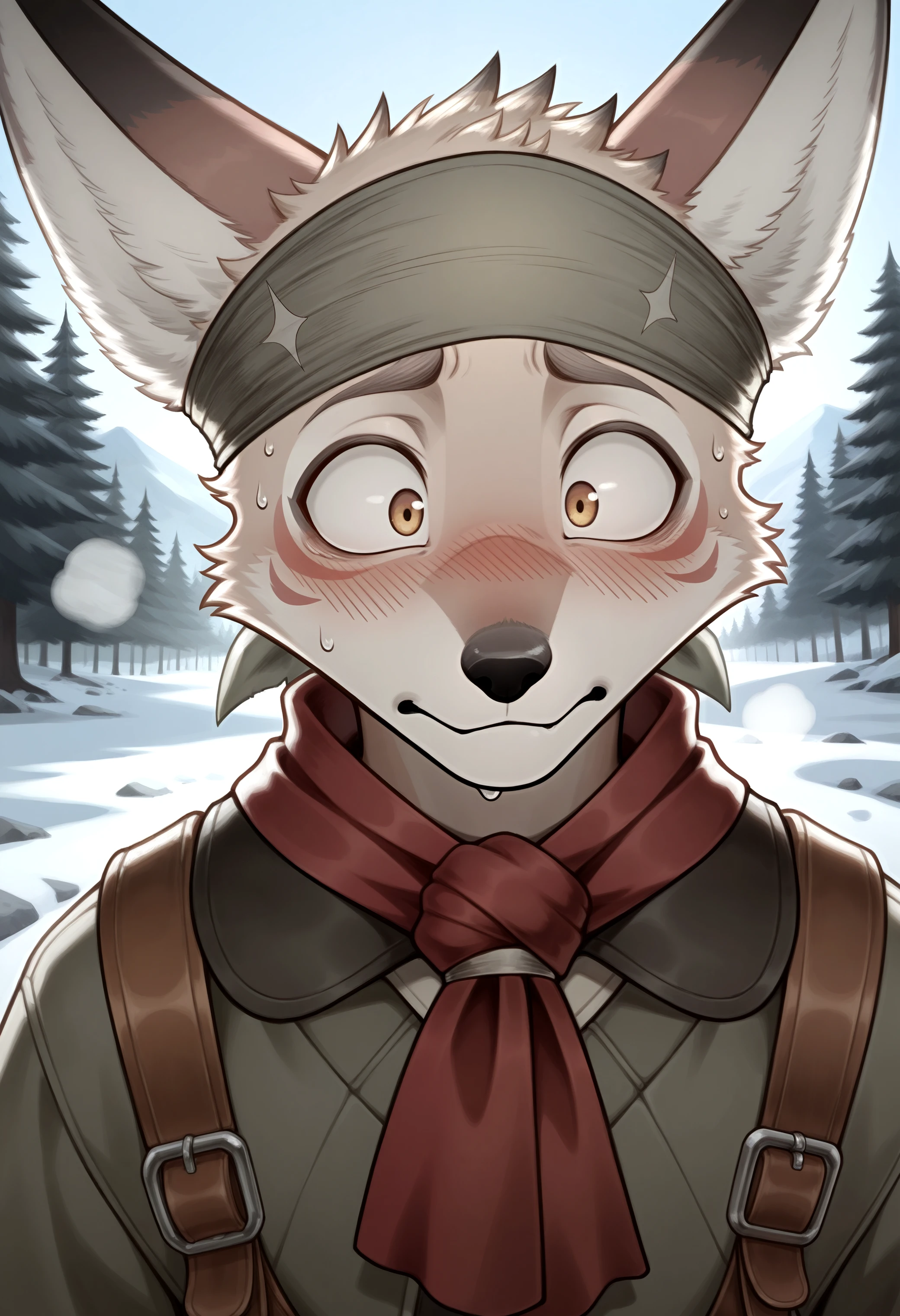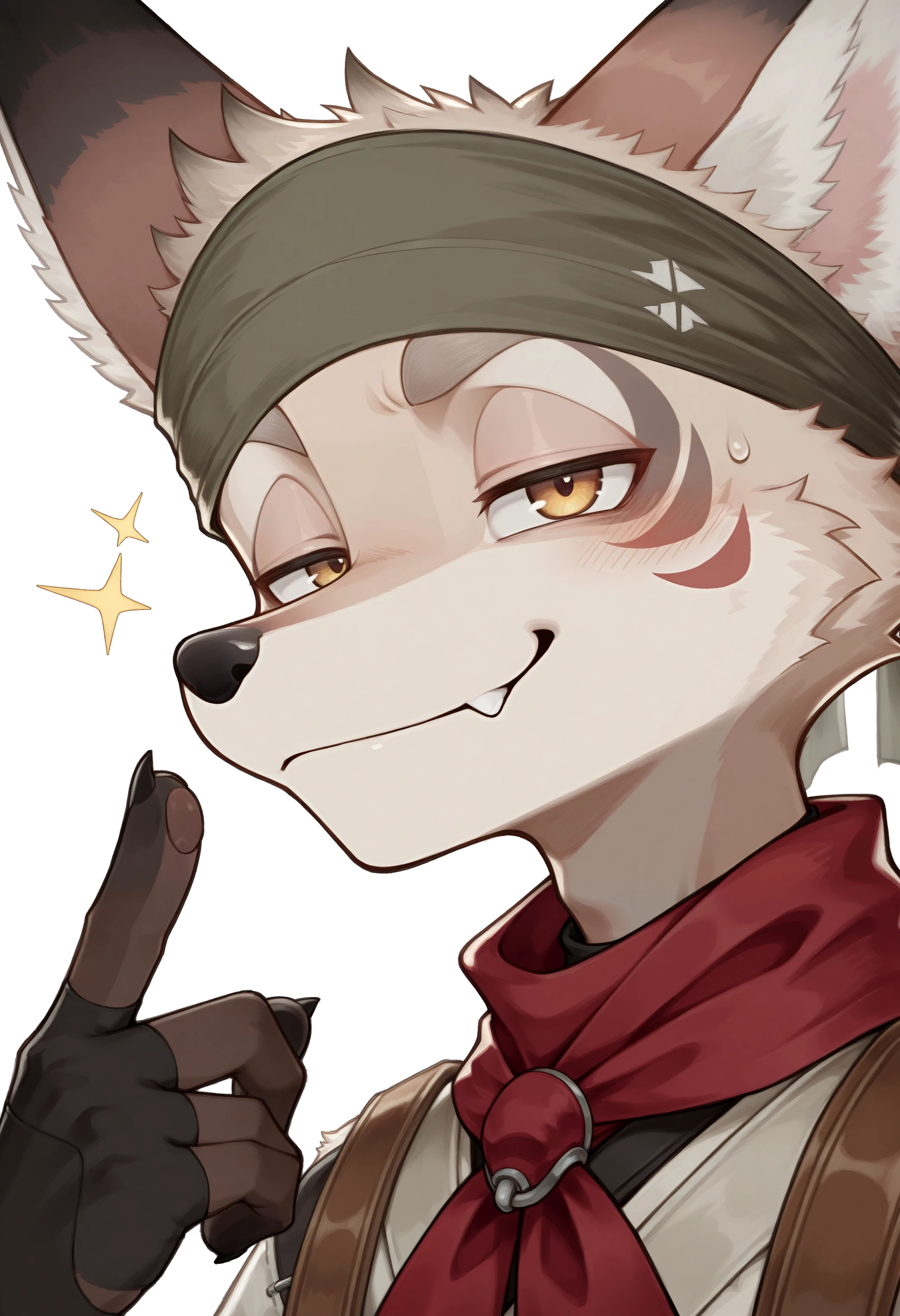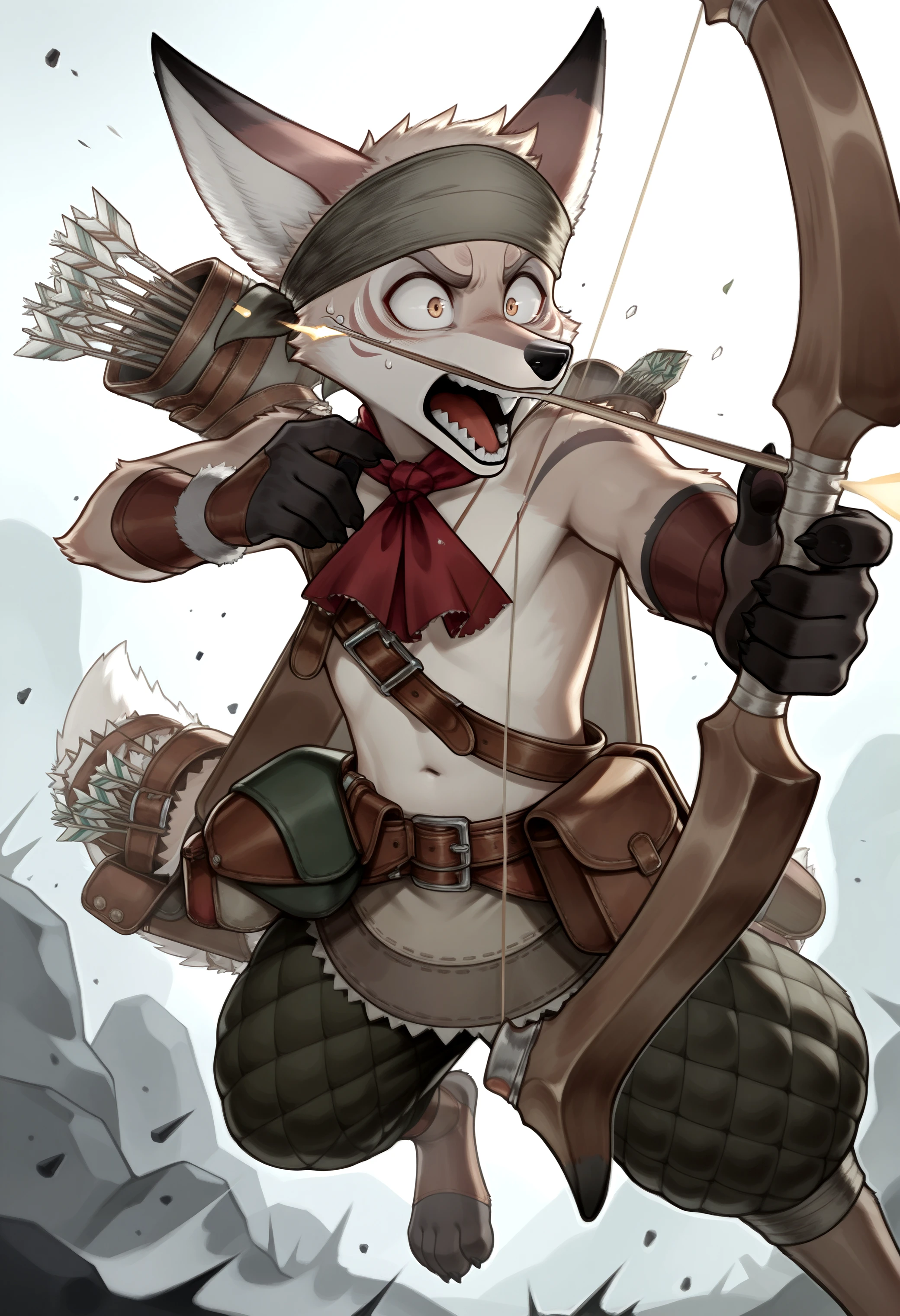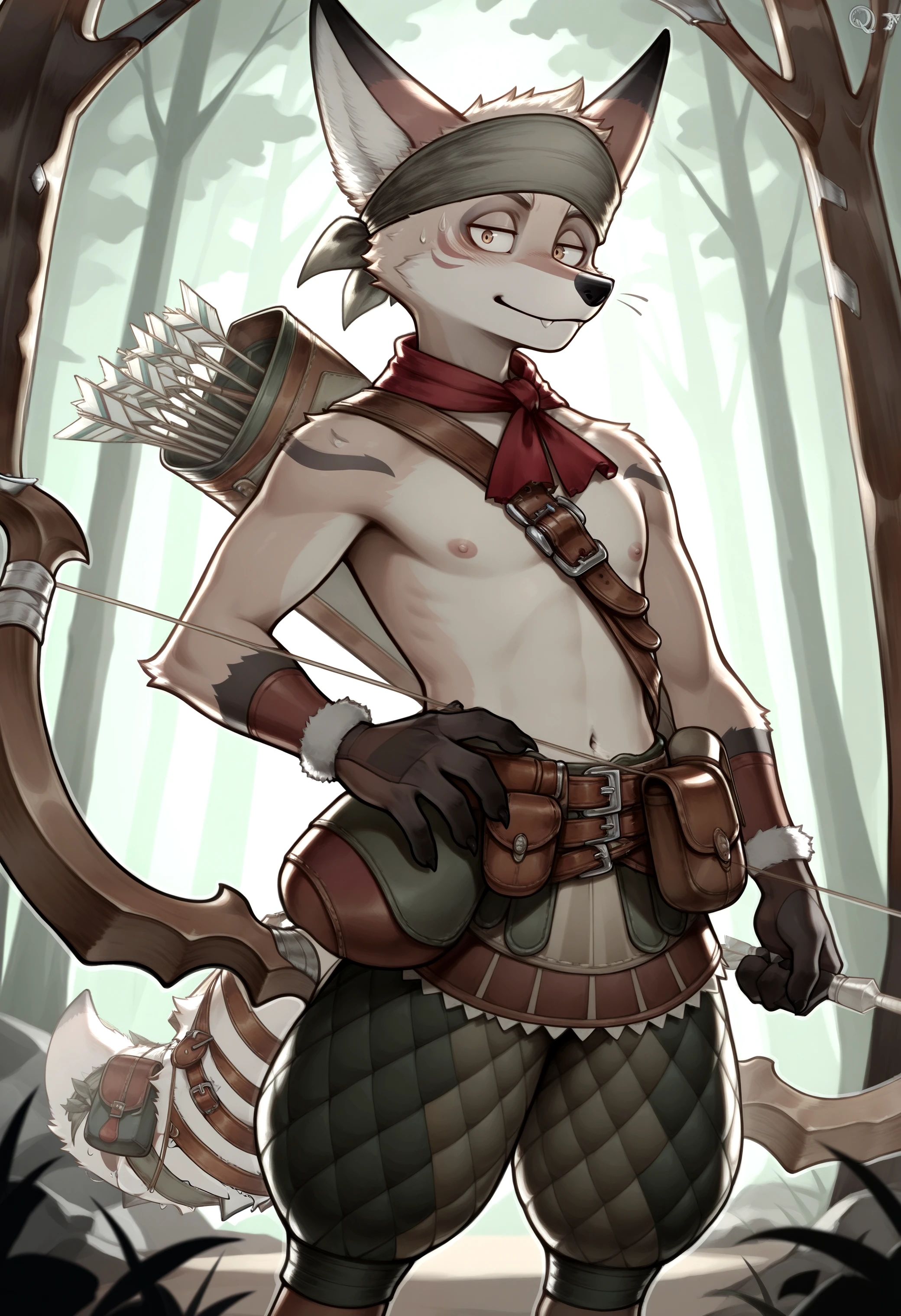 4m0r3y, fox boy, bow (weapon), green pants, headband, pouch, quiver, scarf, tail