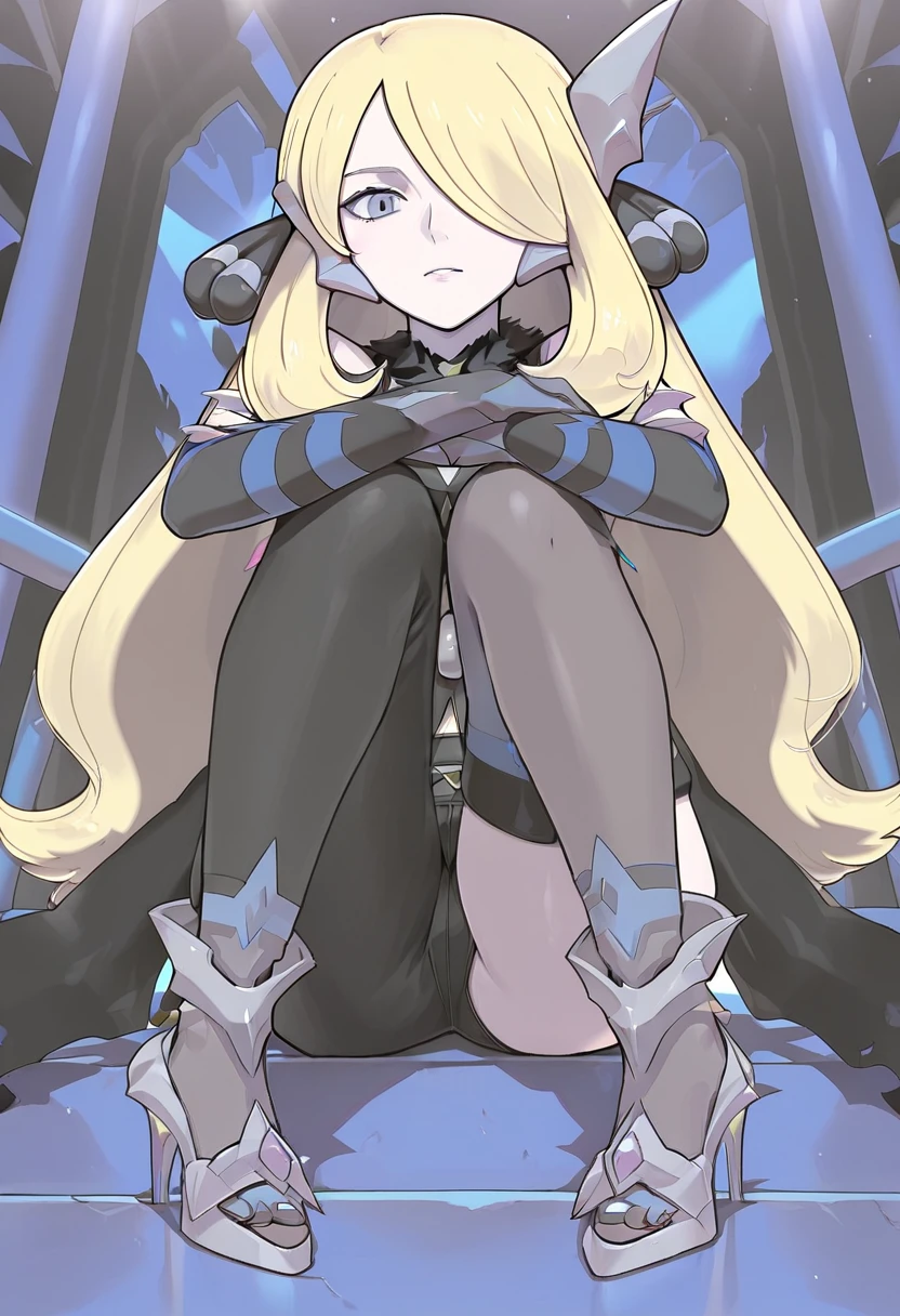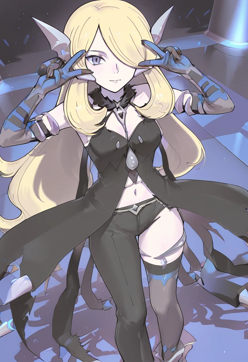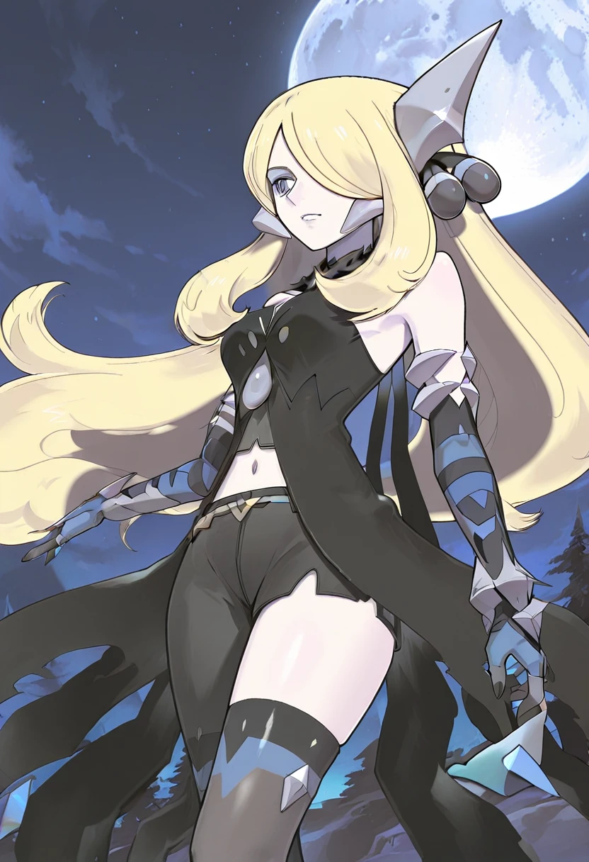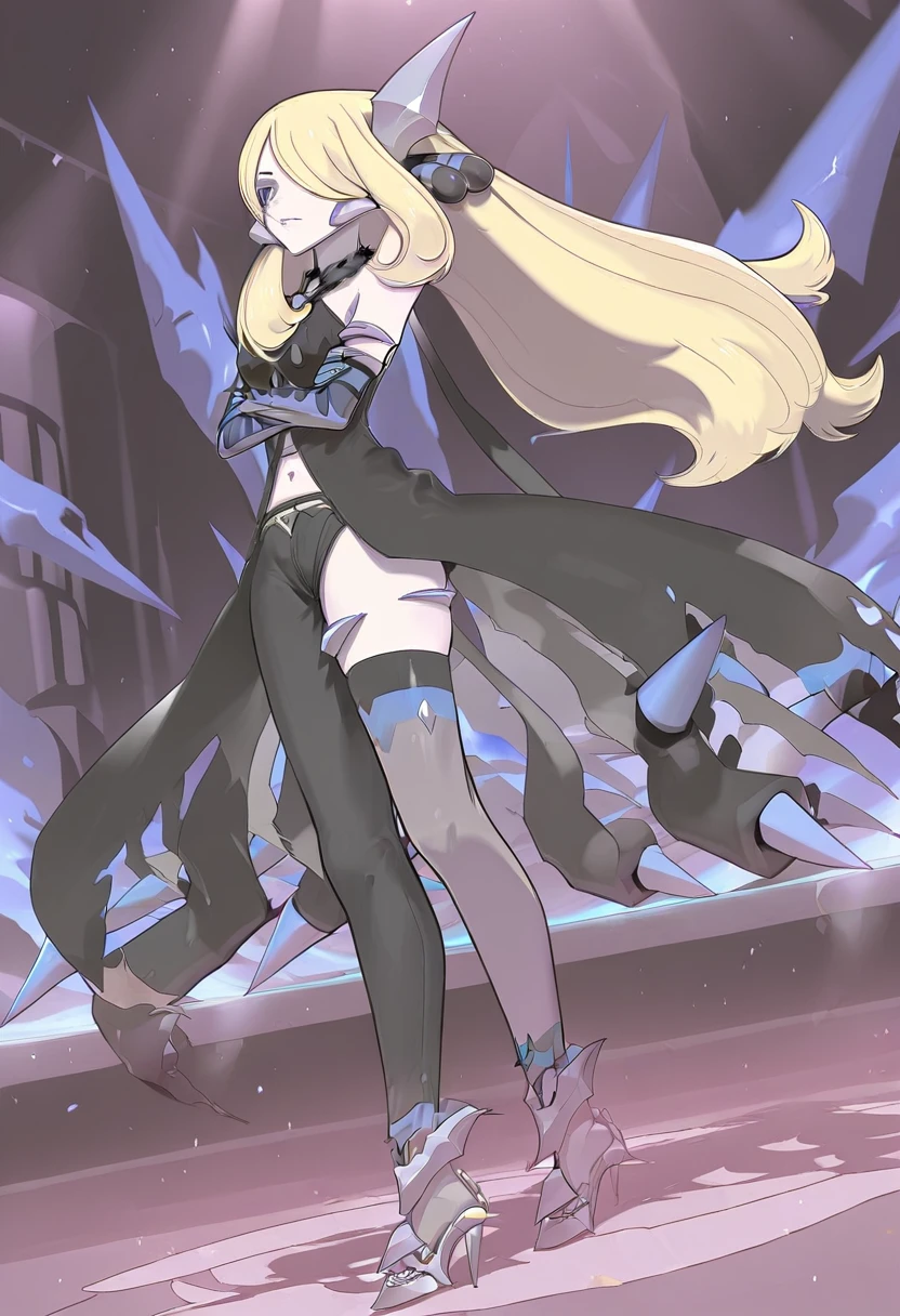 trigger words: cynthia \(pokemon\), 1girl, giracynthia, long hair, blonde hair, hair ornament, single thighhigh, coat dress, halterneck, asymmetrical pants, elbow gloves, navel, spikes, high heels