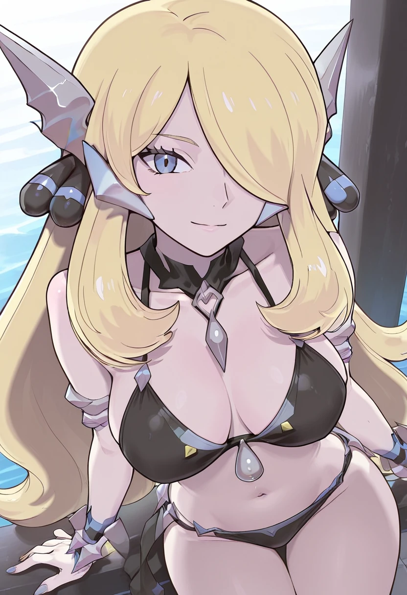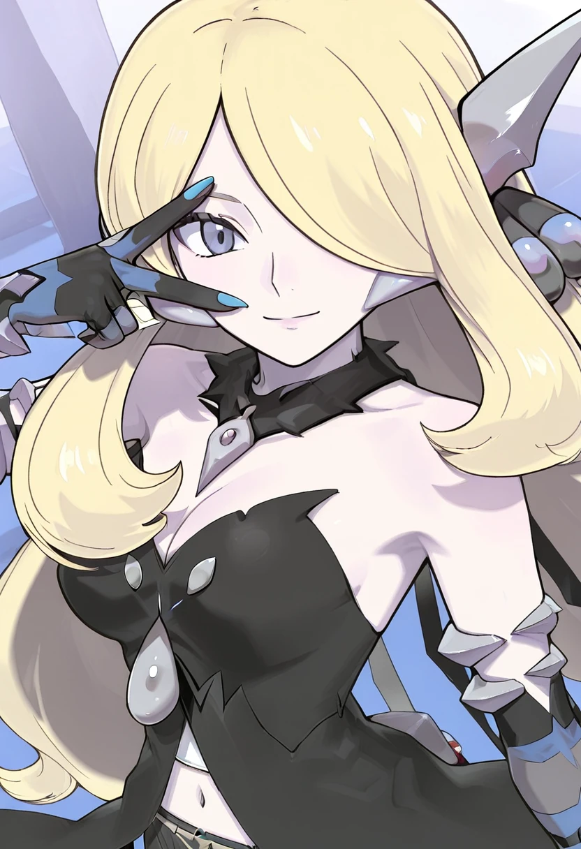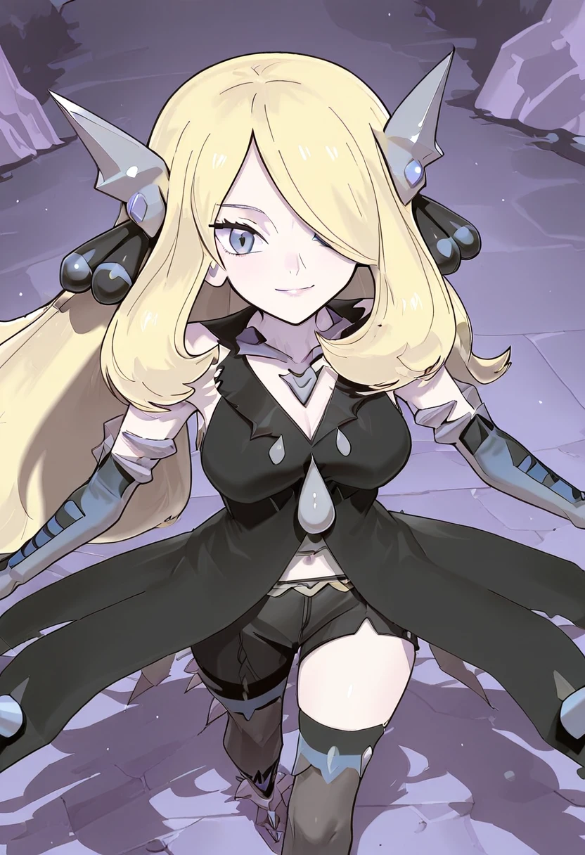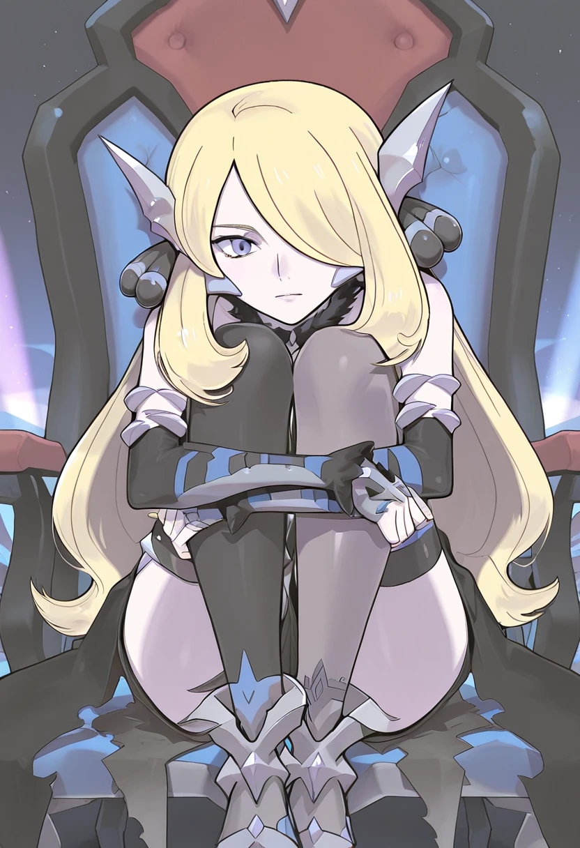 trigger words: cynthia \(pokemon\), 1girl, giracynthia, long hair, blonde hair, hair ornament, single thighhigh, coat dress, halterneck, asymmetrical pants, elbow gloves, navel, spikes, high heels