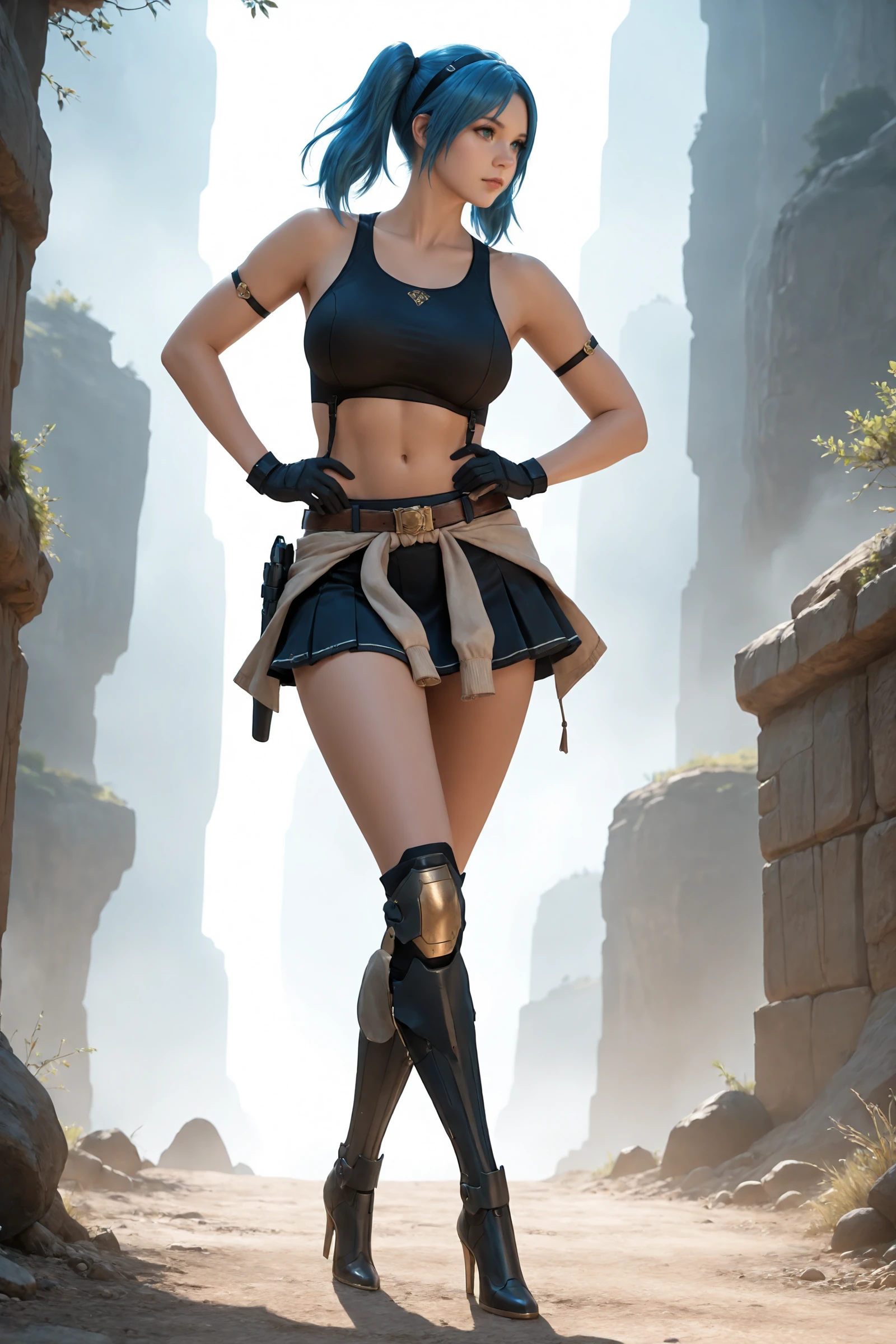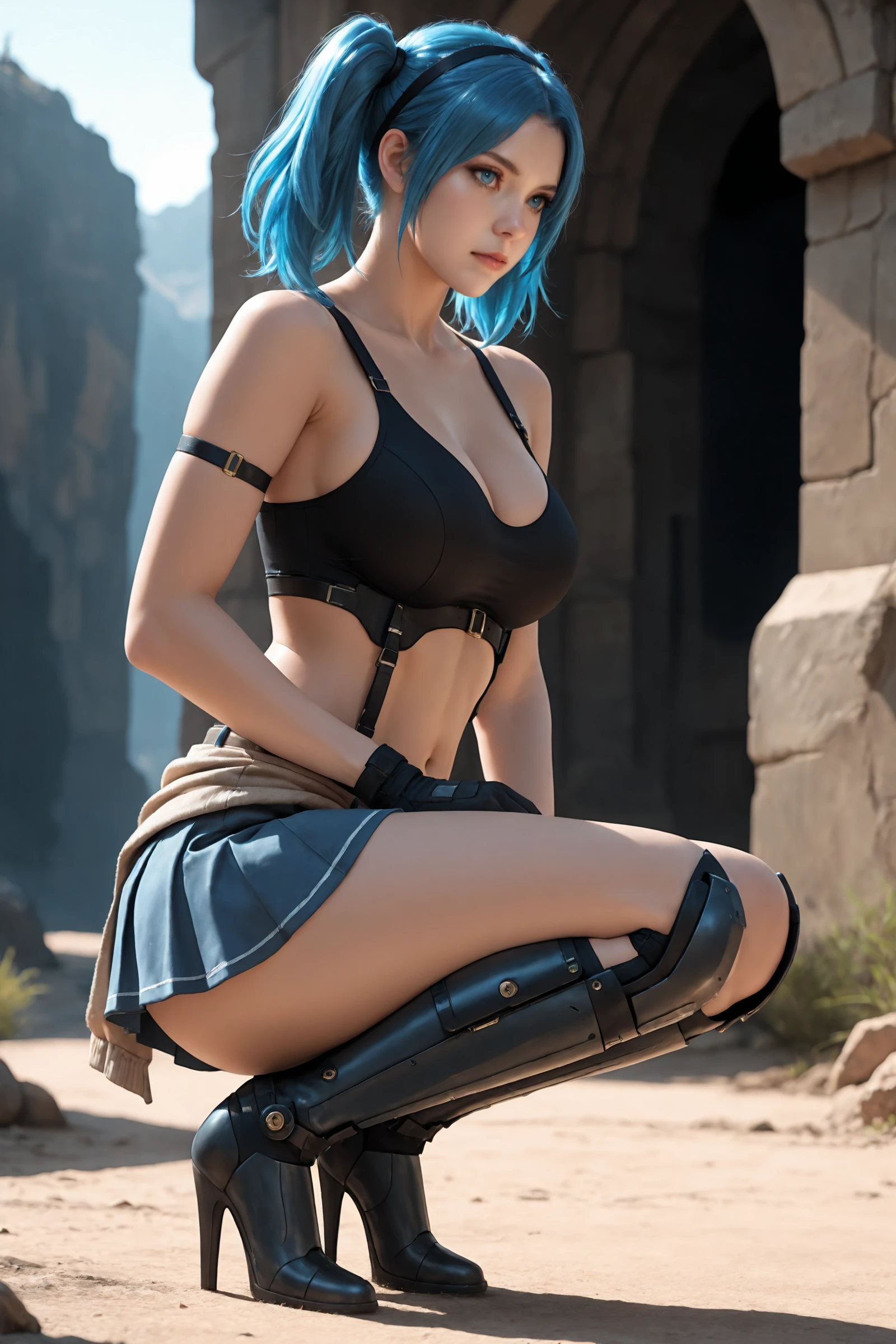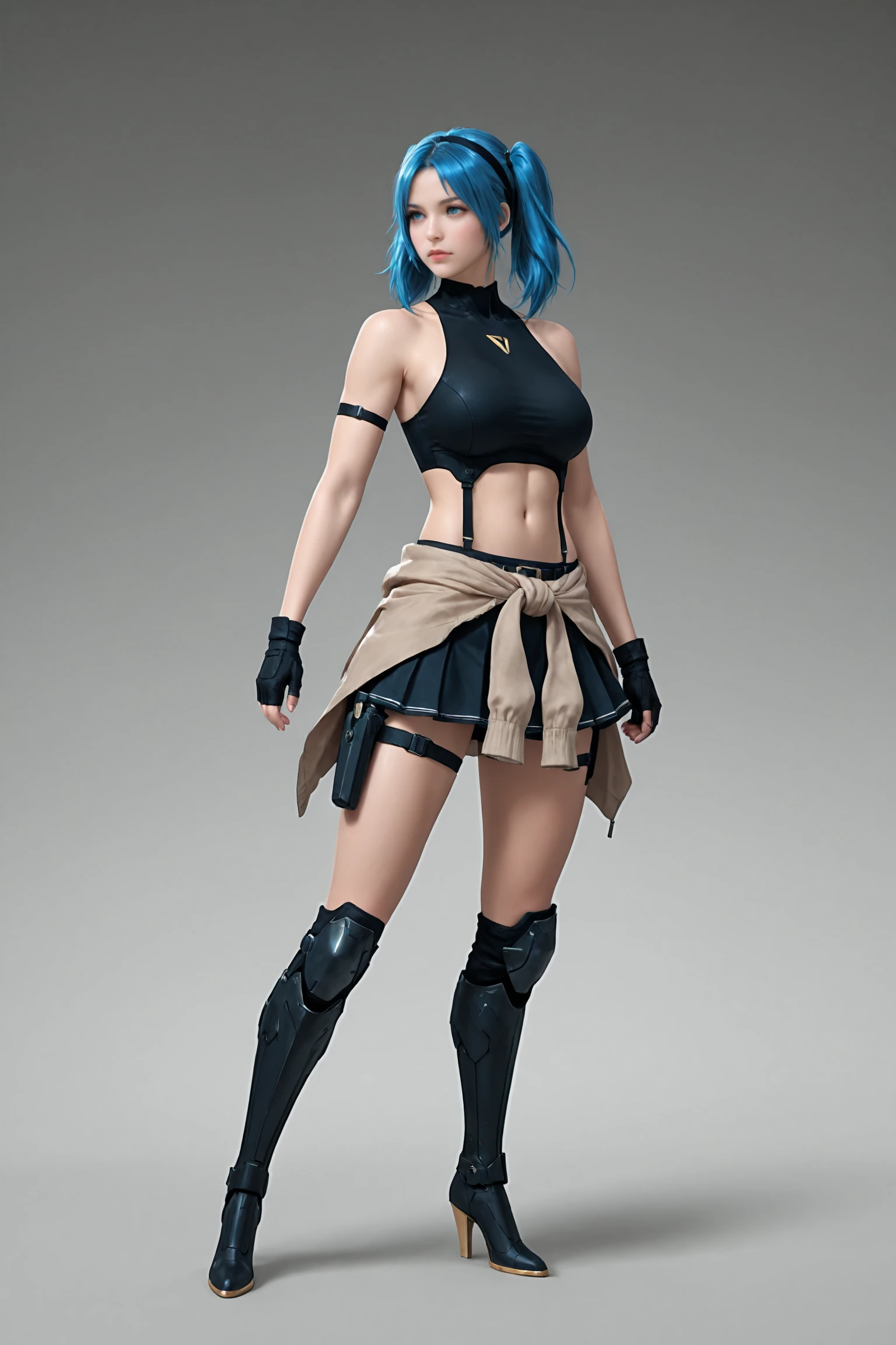 twintails,blue_hair,hairband, large_breasts,navel,midriff,clothes_around_waist,bare_shoulders, crop_top,belt,armlet,black_gloves,skirt,holster, mechanical_knee_boots,high_heels,