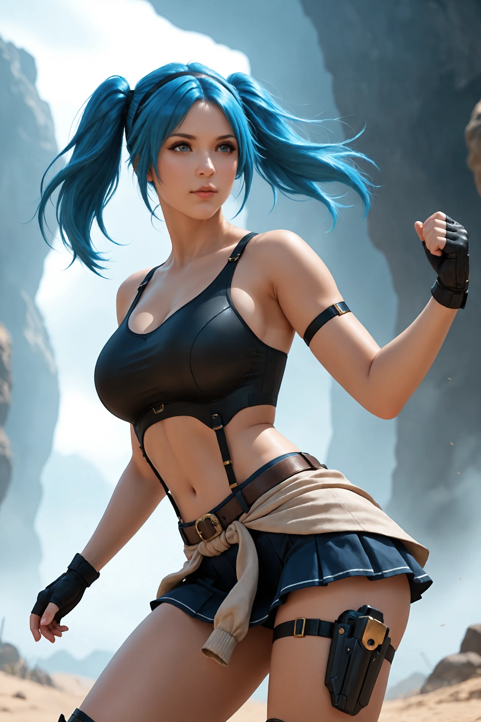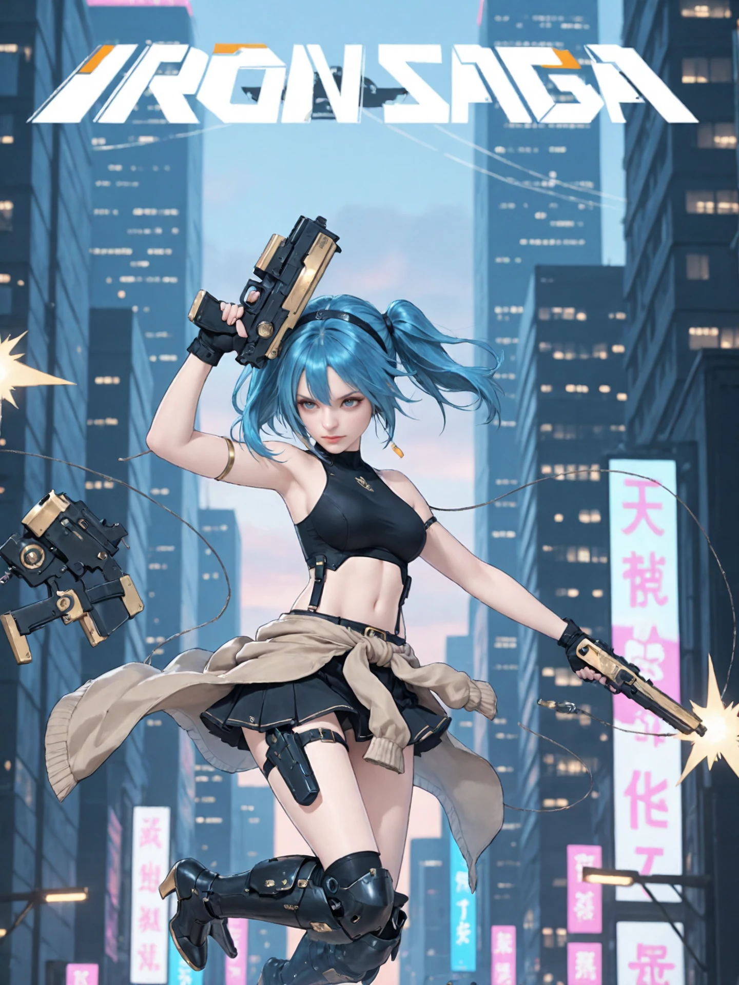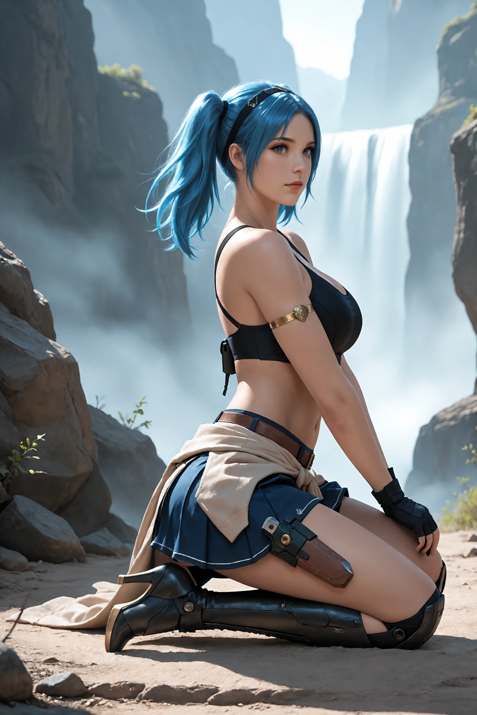 twintails,blue_hair,hairband, large_breasts,navel,midriff,clothes_around_waist,bare_shoulders, crop_top,belt,armlet,black_gloves,skirt,holster, mechanical_knee_boots,high_heels,