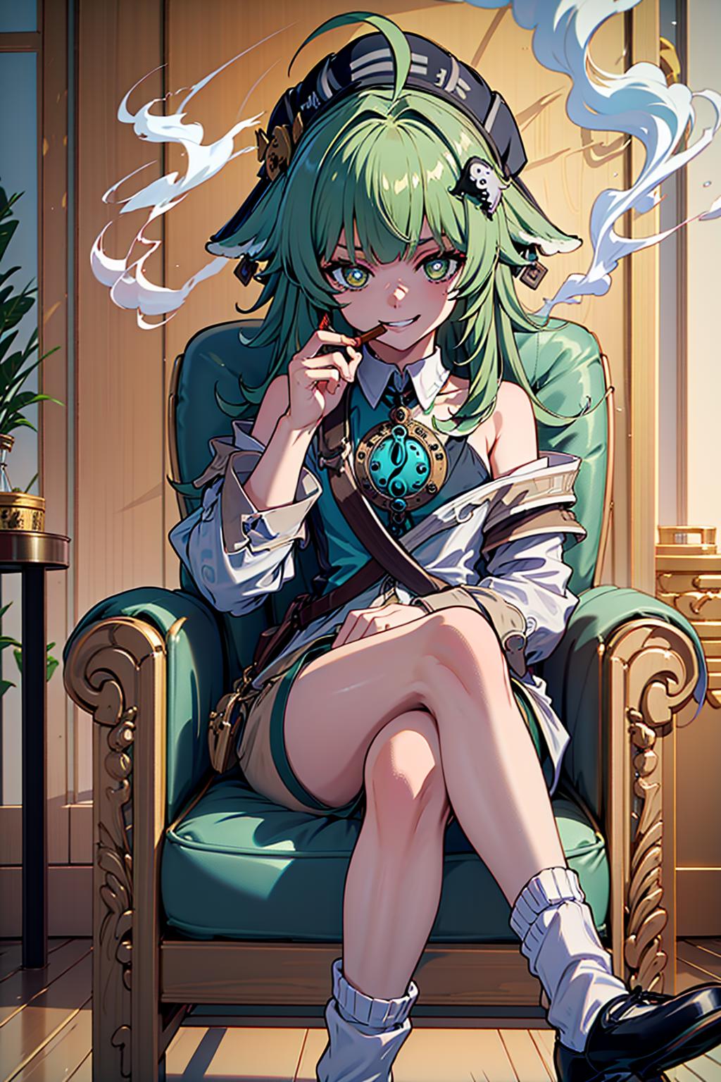 huohuo, green hair, bangs, long hair, ahoge, animal ears, beret, hair ornament, green eyes, shorts, white socks, shirt, off shoulder, fox tail