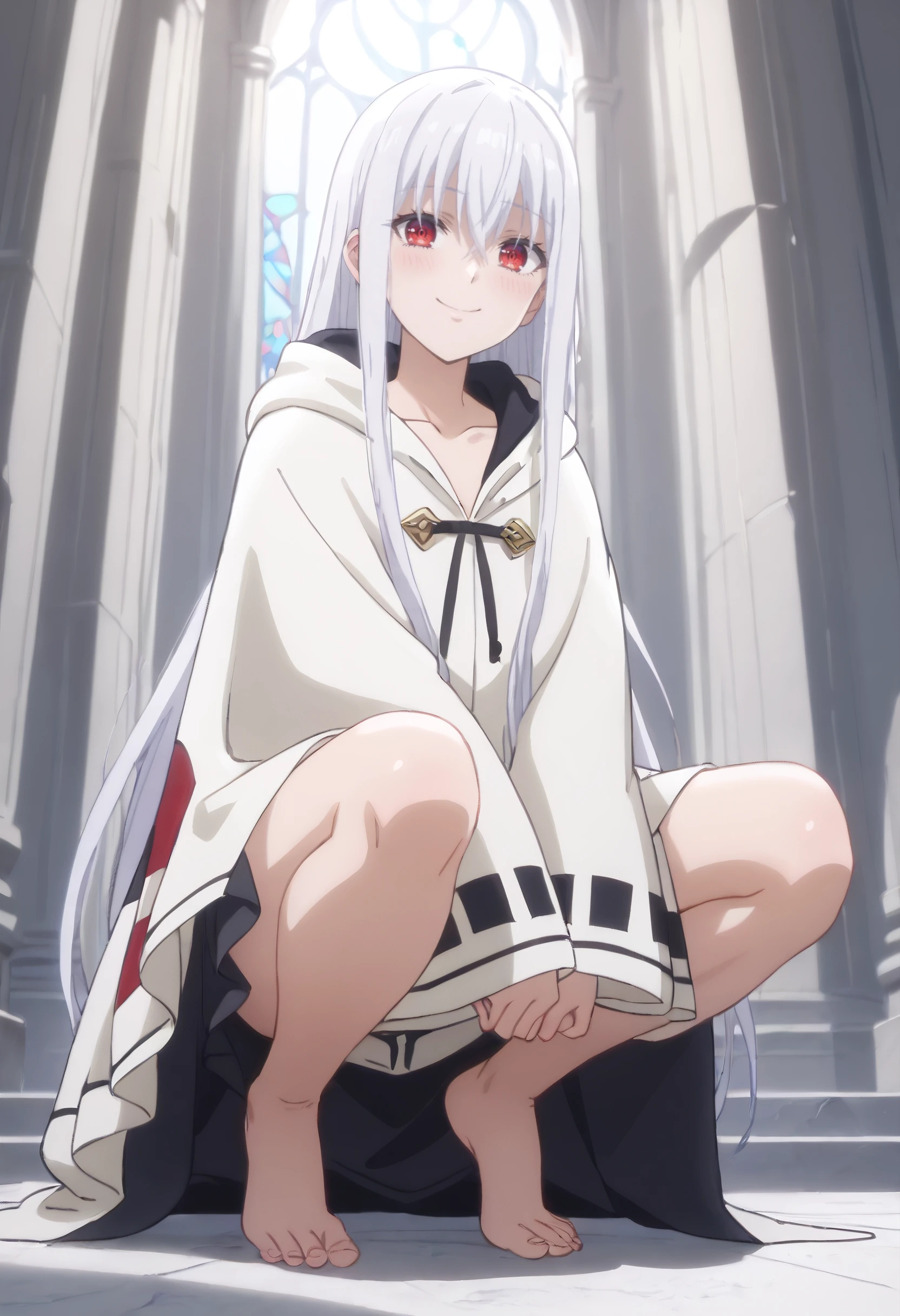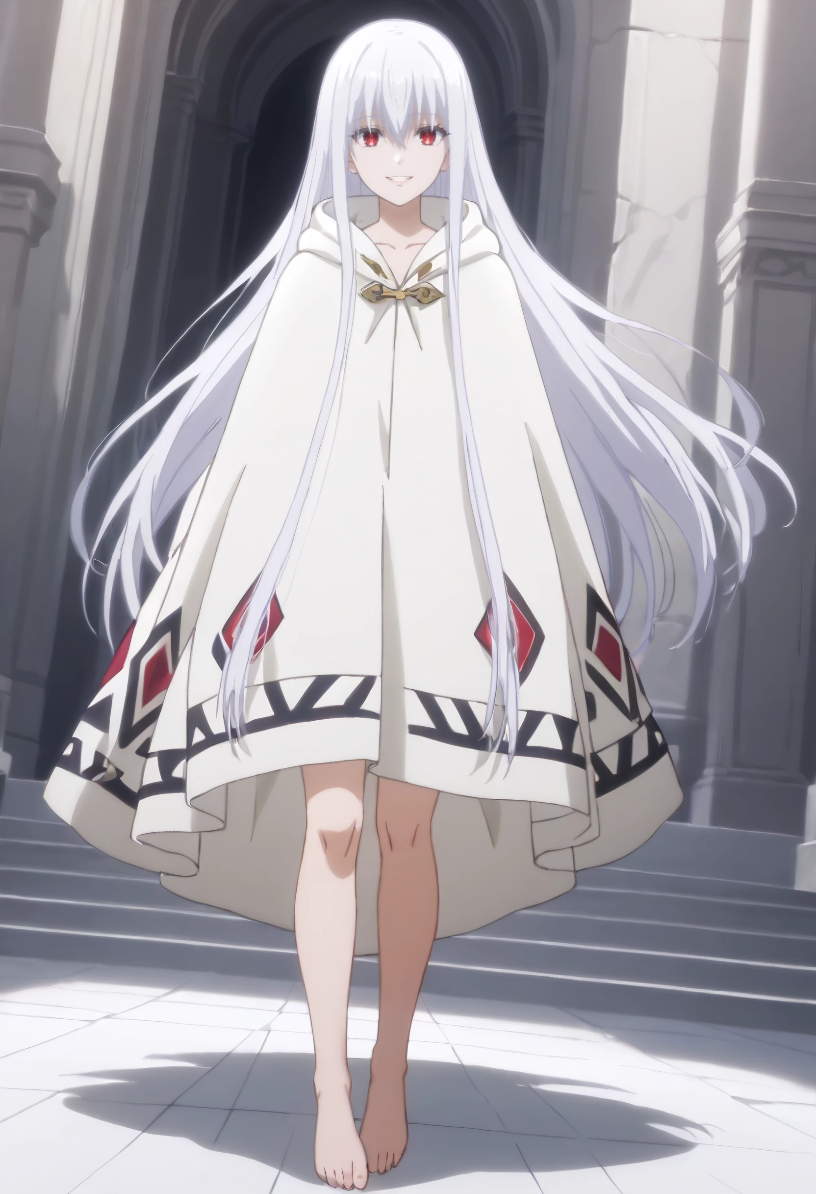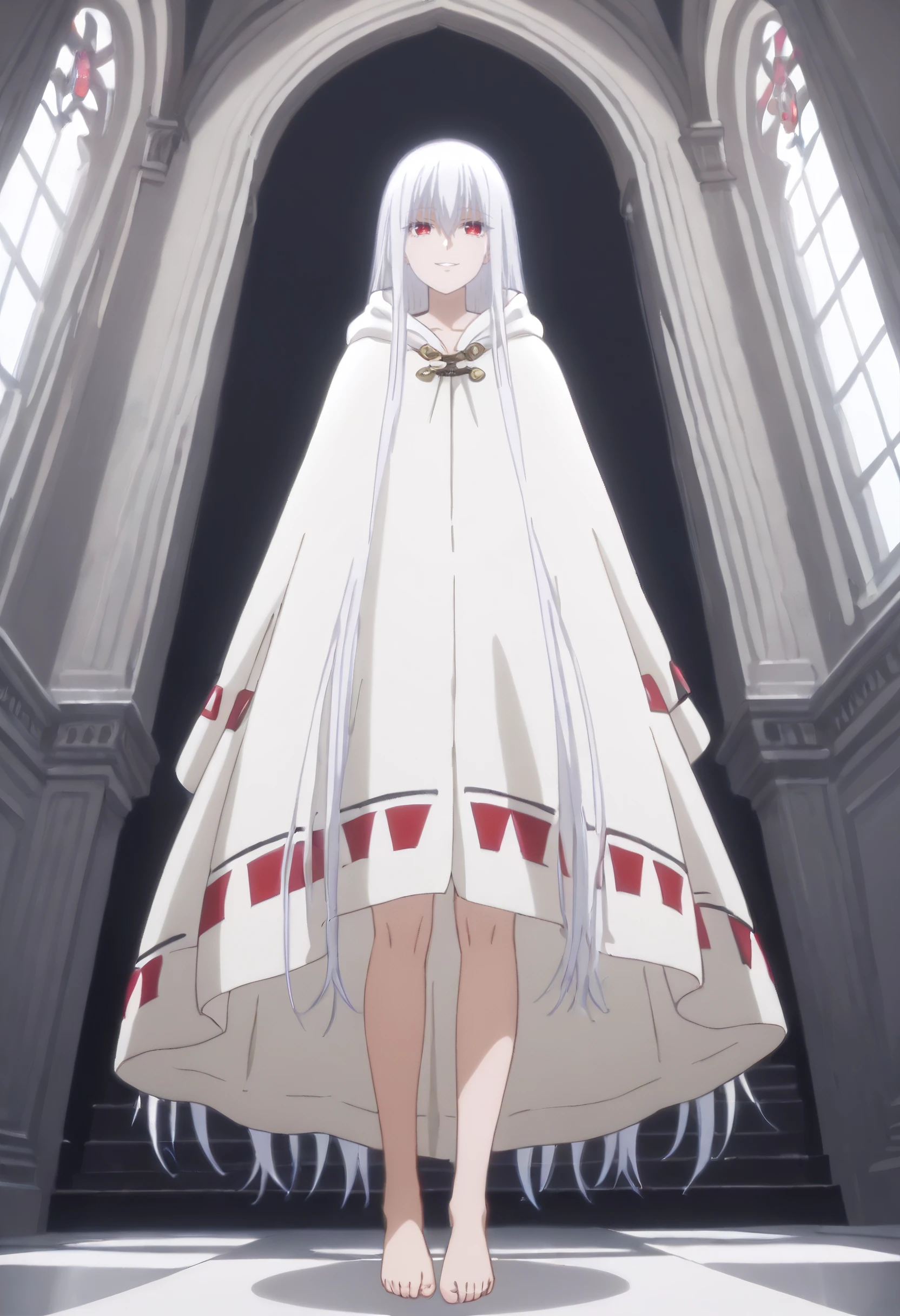 hood, collarbone, long sleeves, cloak, hood down, barefoot, hoodie, dress, hooded cloak, white hoodie, bare legs, coat, robe,