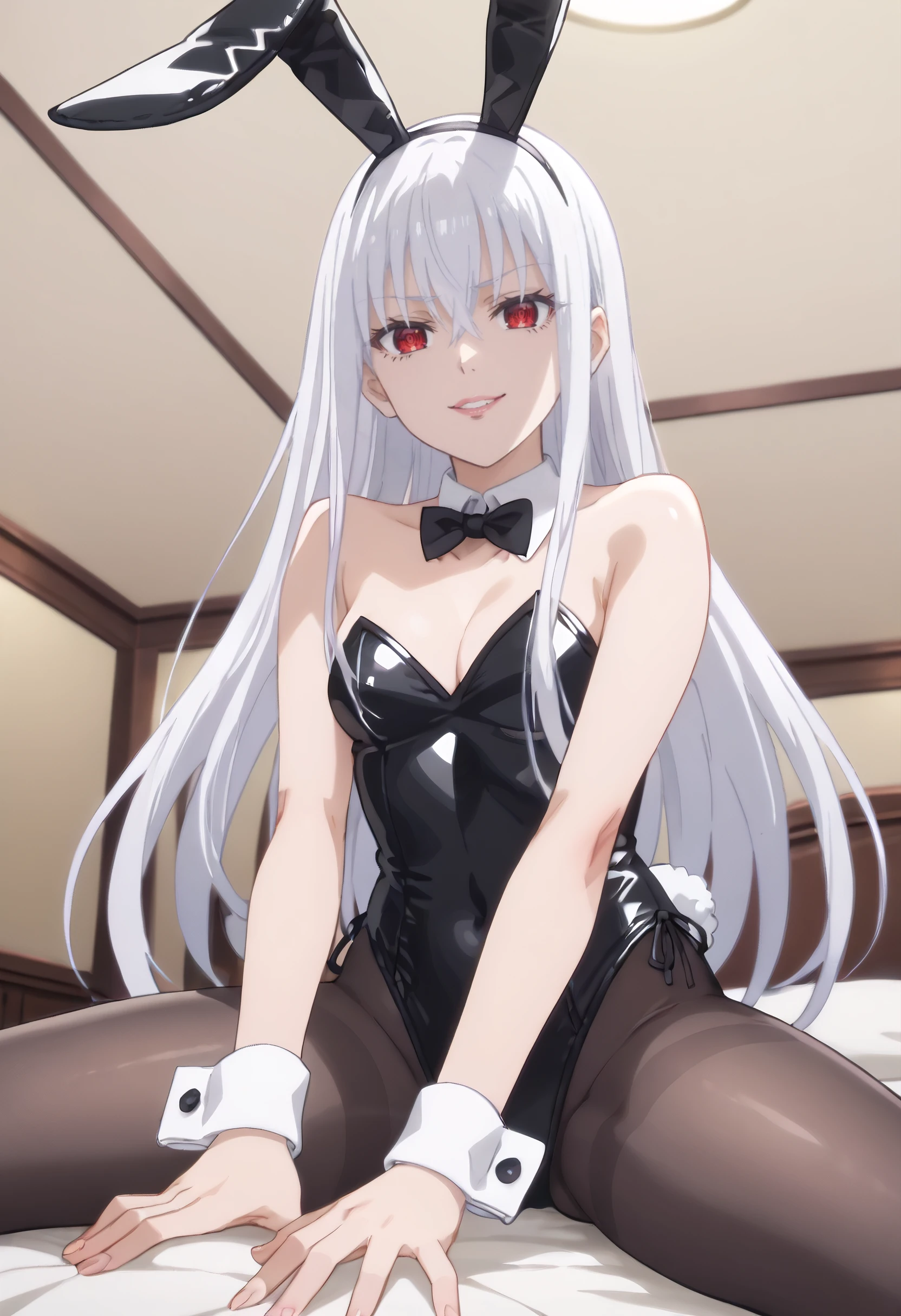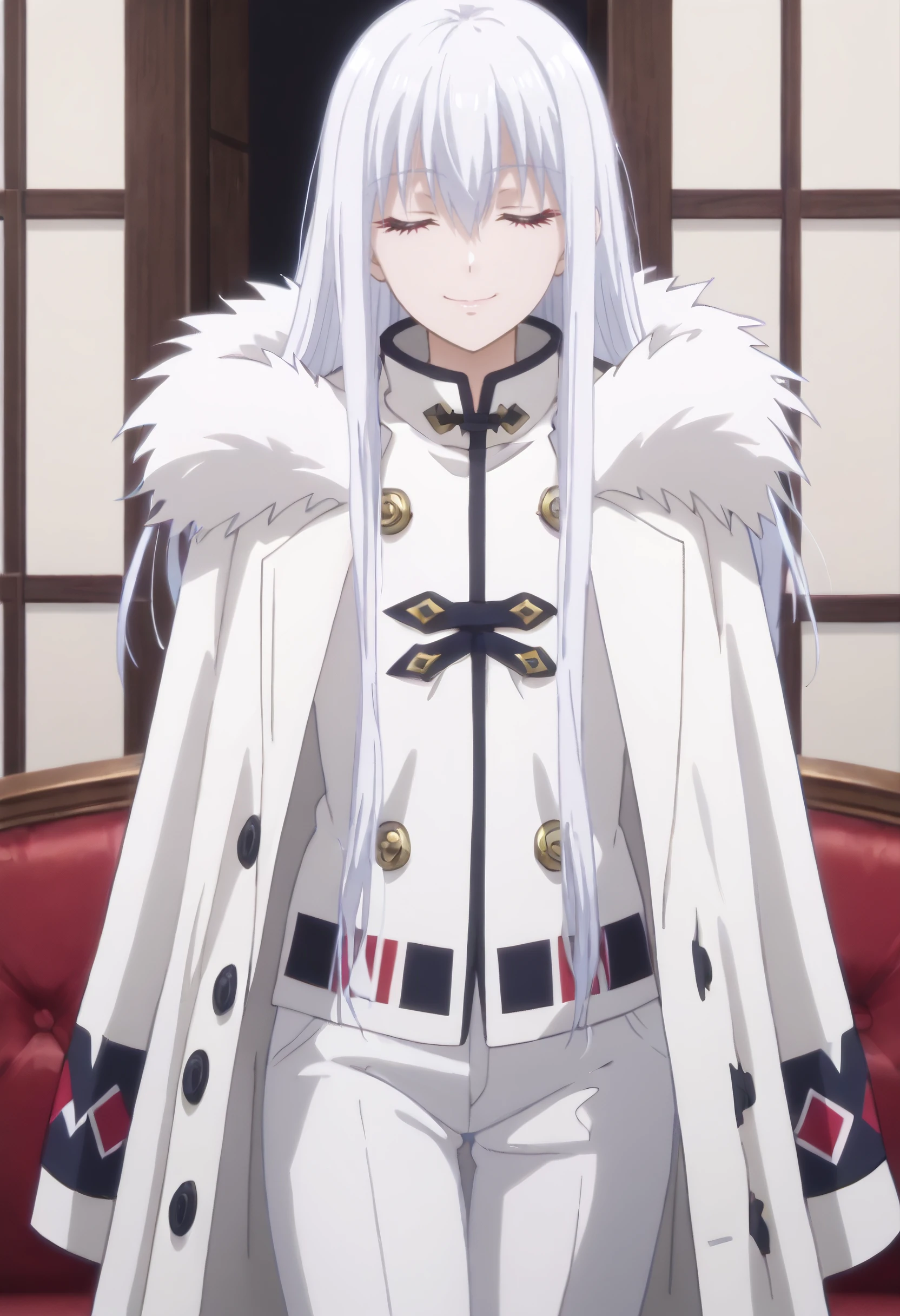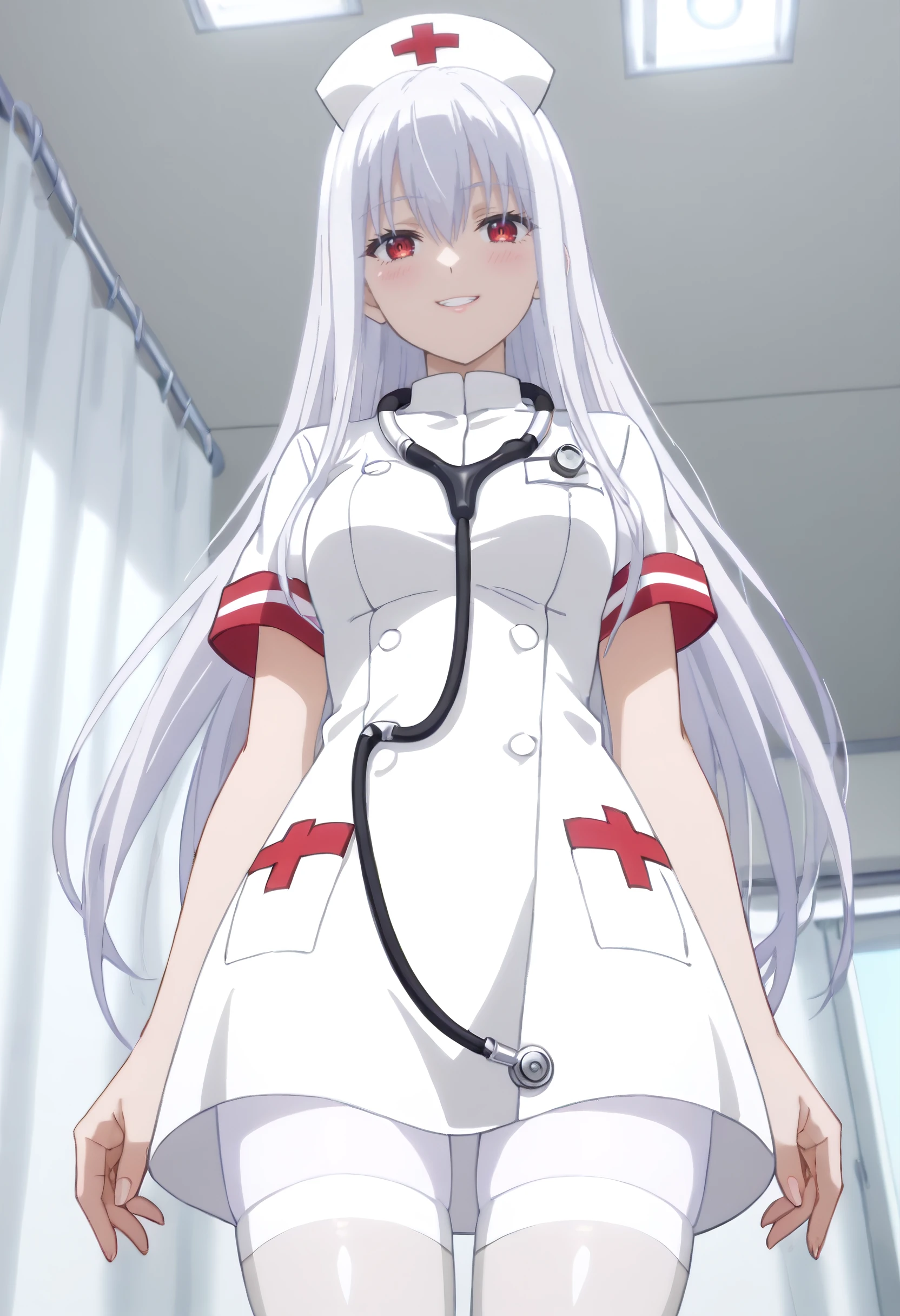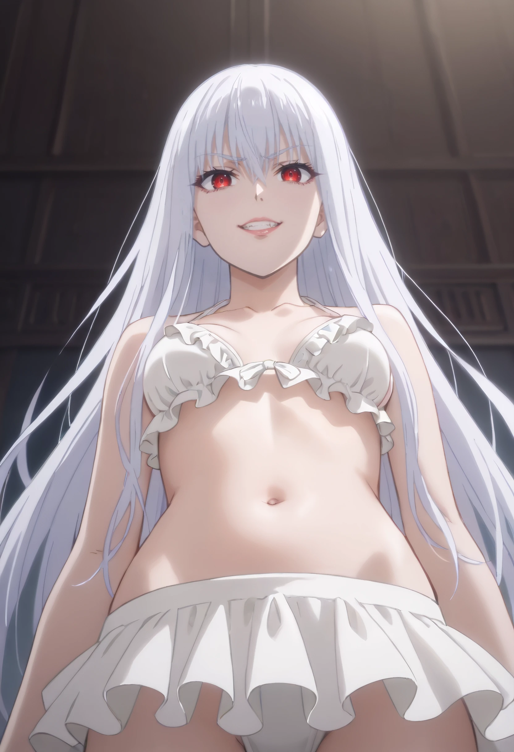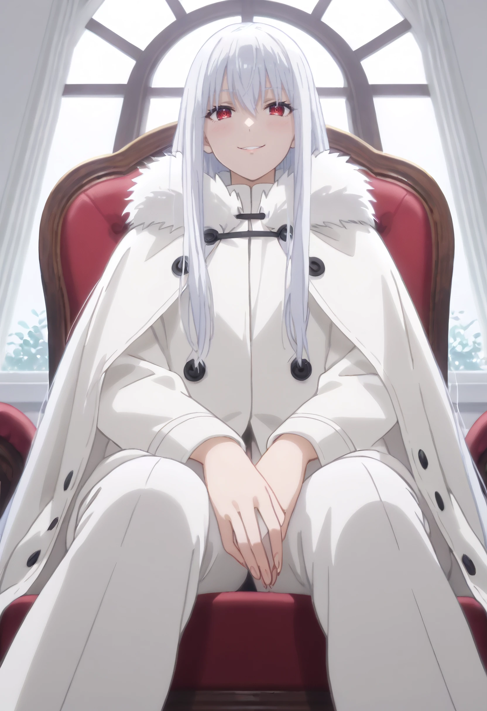 BNBLuna, bangs, long hair, white hair, hair between eyes, red eyes, eyebrows visible through hair,