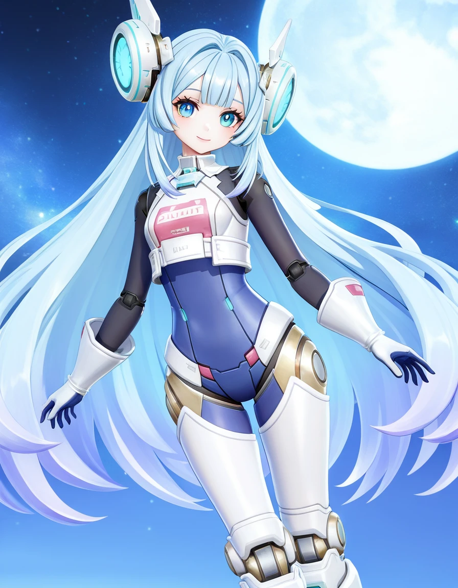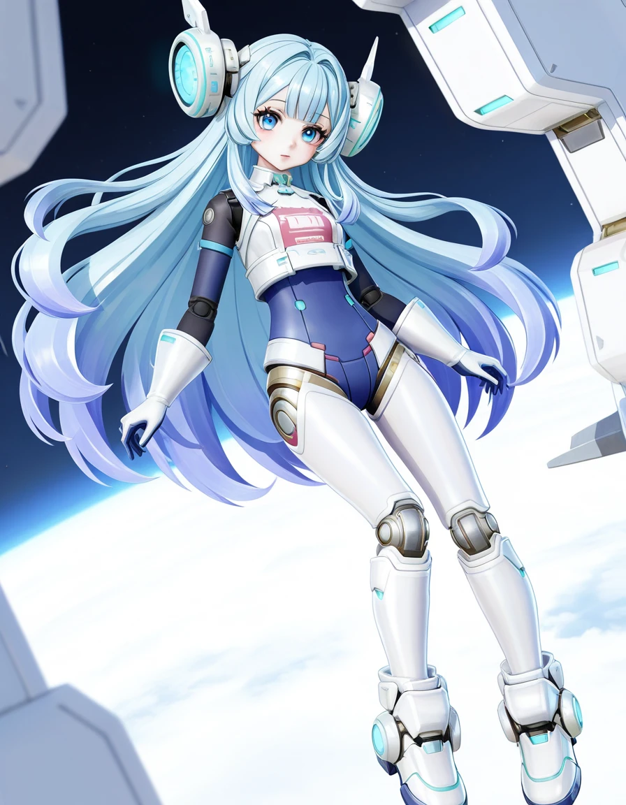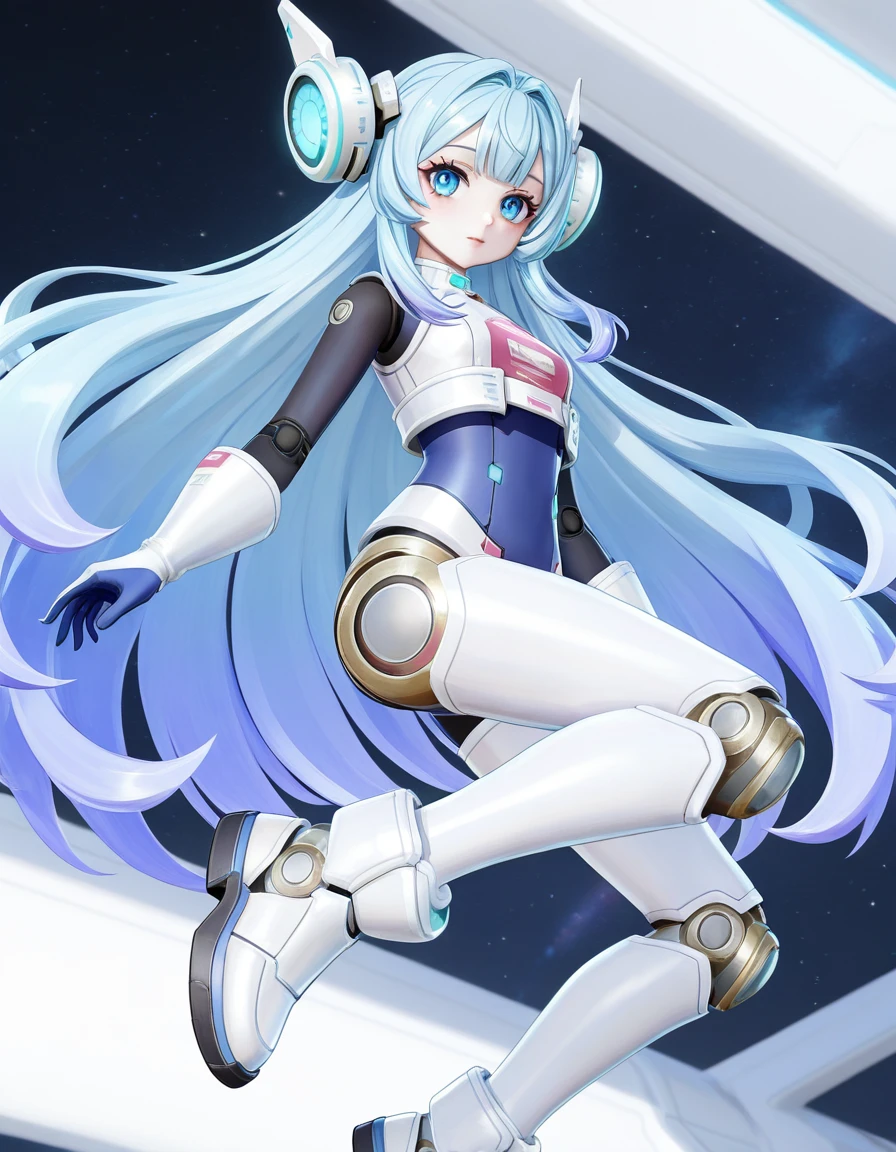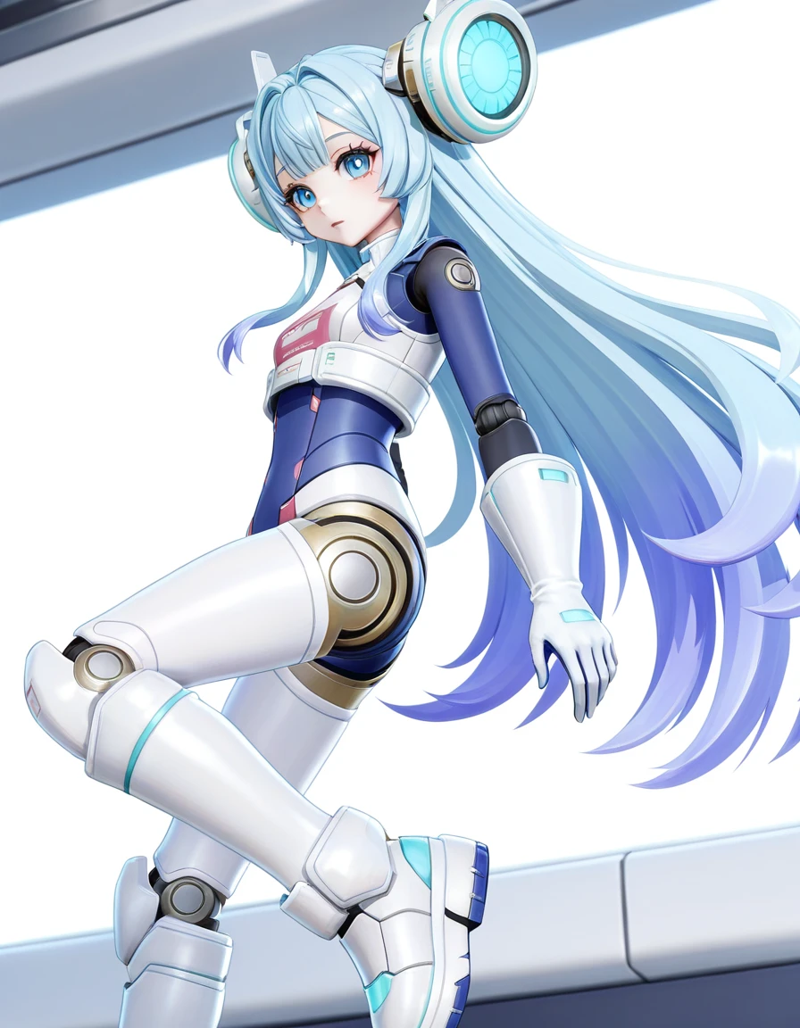 qiongtu, 1girl, solo, small , blue eyes, bangs, blue hair, gradient hair, light blue hair, long hair, very long hair, sidelocks, android, doll joints, mechanical arms, mechanical ears, mechanical legs, robot joints, blue , skin shirt, blue gloves, white gloves, hair ornament, headgear, white boots