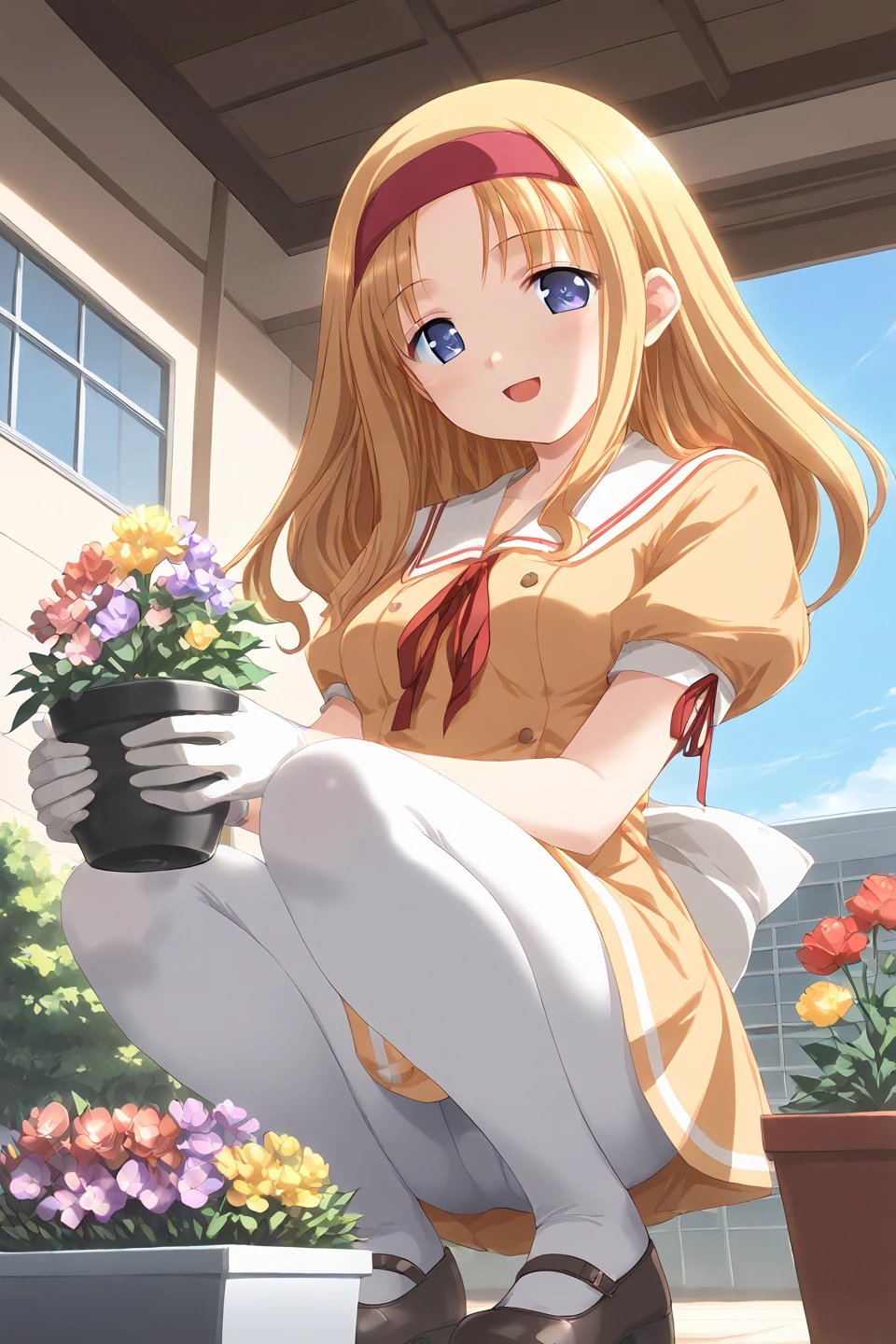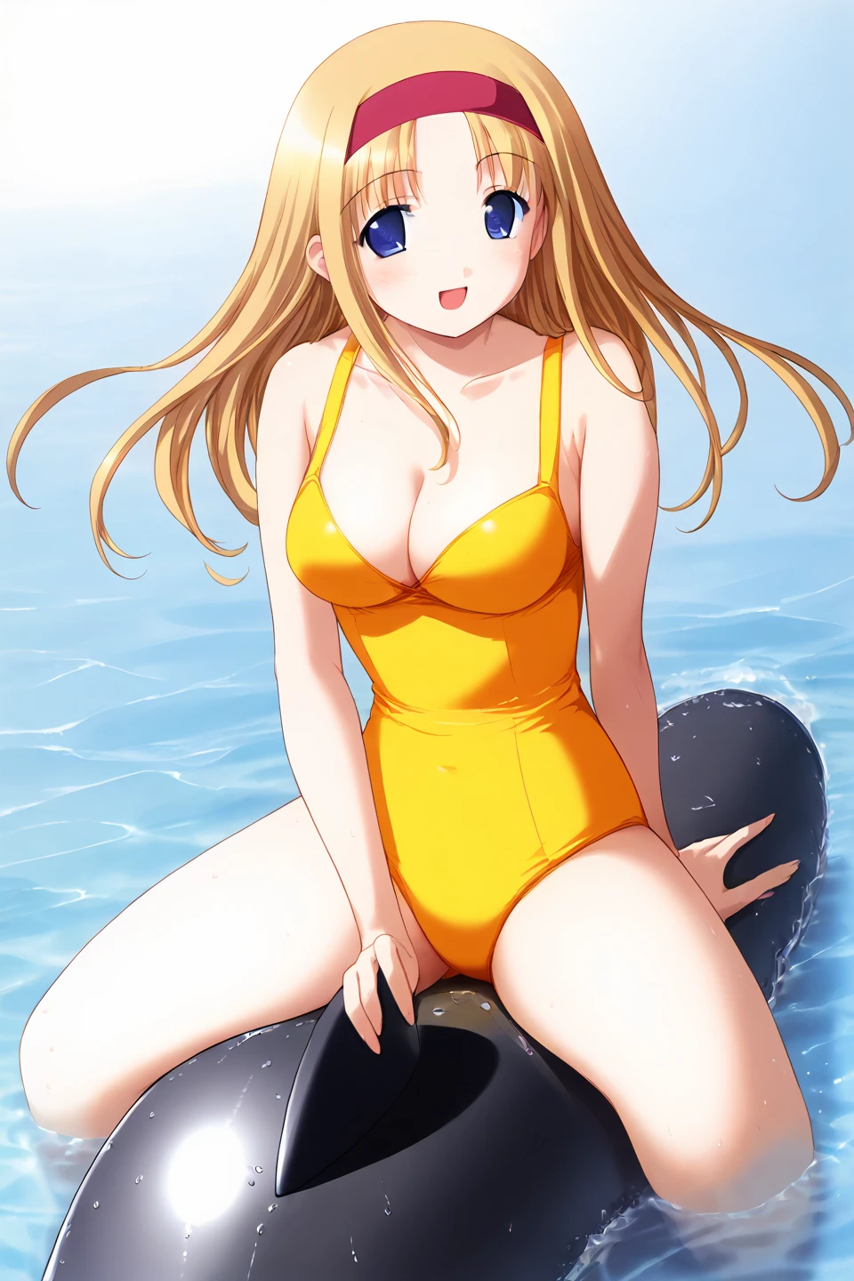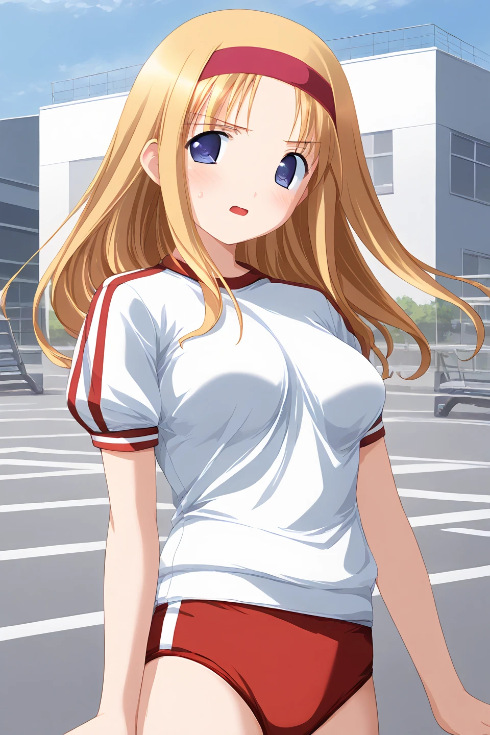 wakana chitose,1girl,solo,blue eyes,blonde hair,long hair,hairband,red hairband,