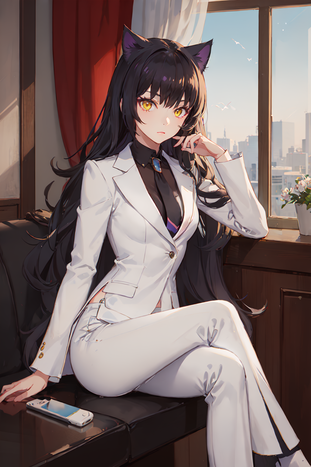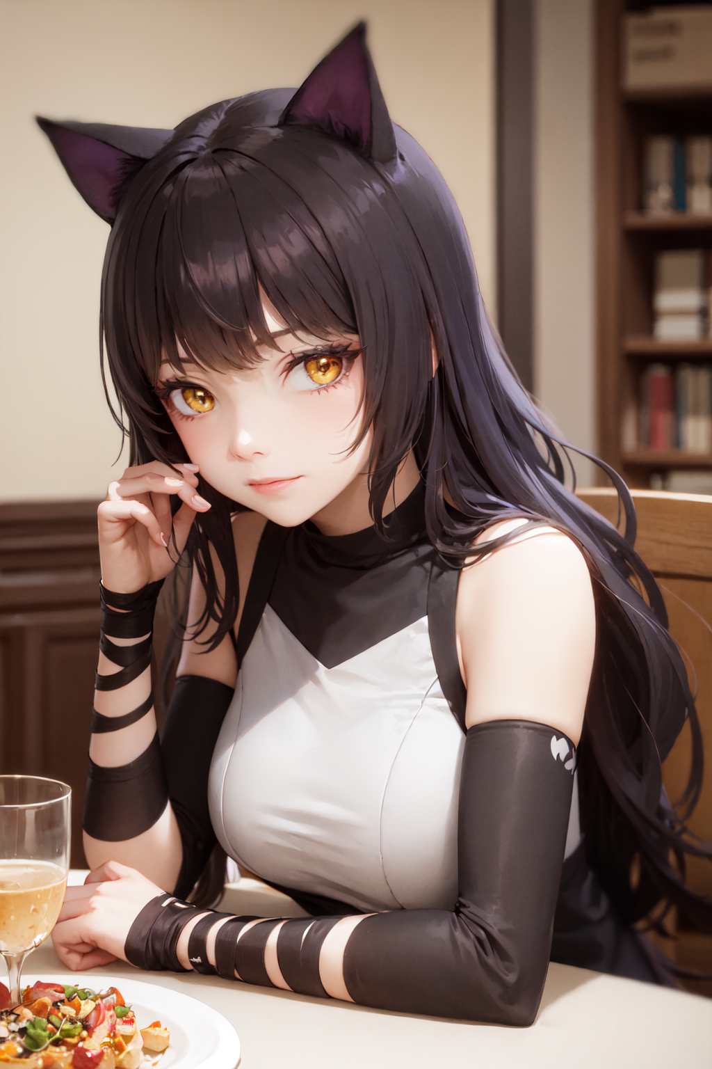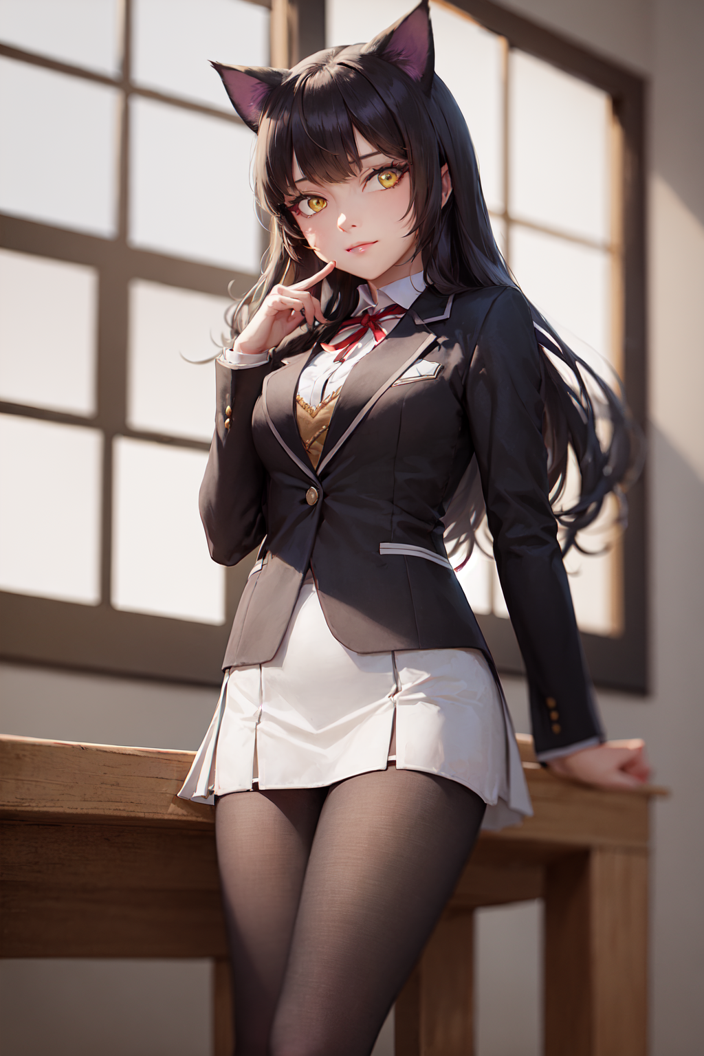 She wears a black hair bow to hide her cat ears. (Don't put these prompts together.)