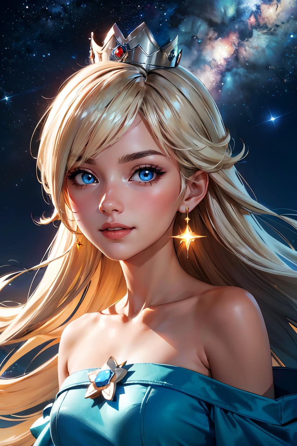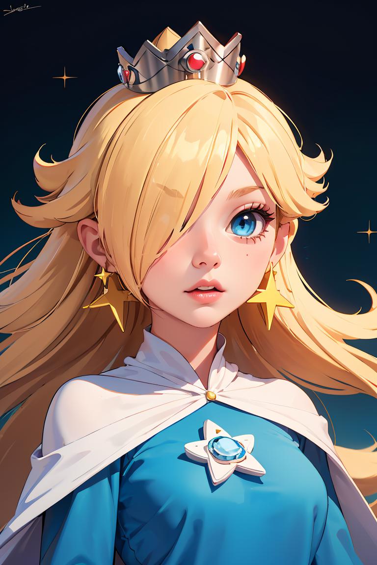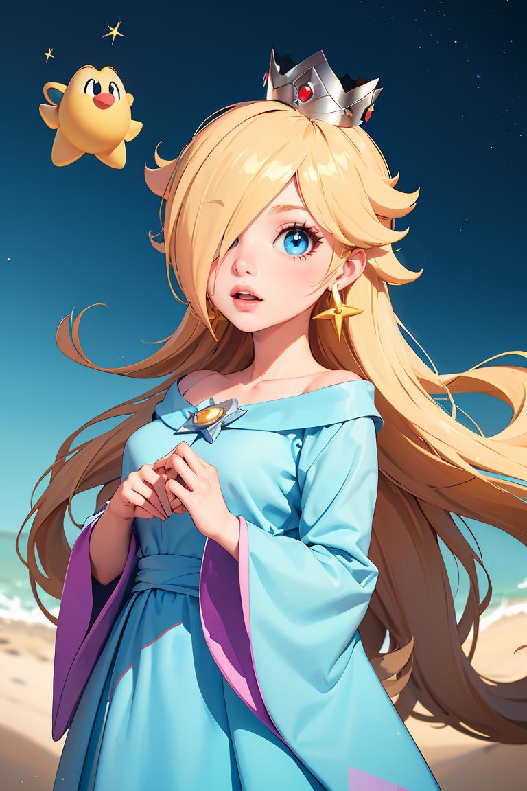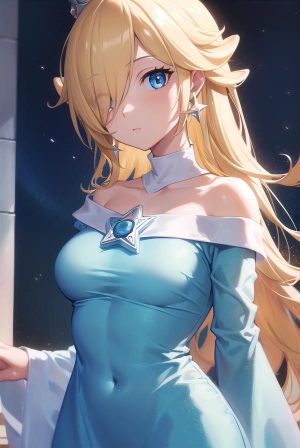 rosalina, blonde hair, blue eyes, hair over one eye, long hair,