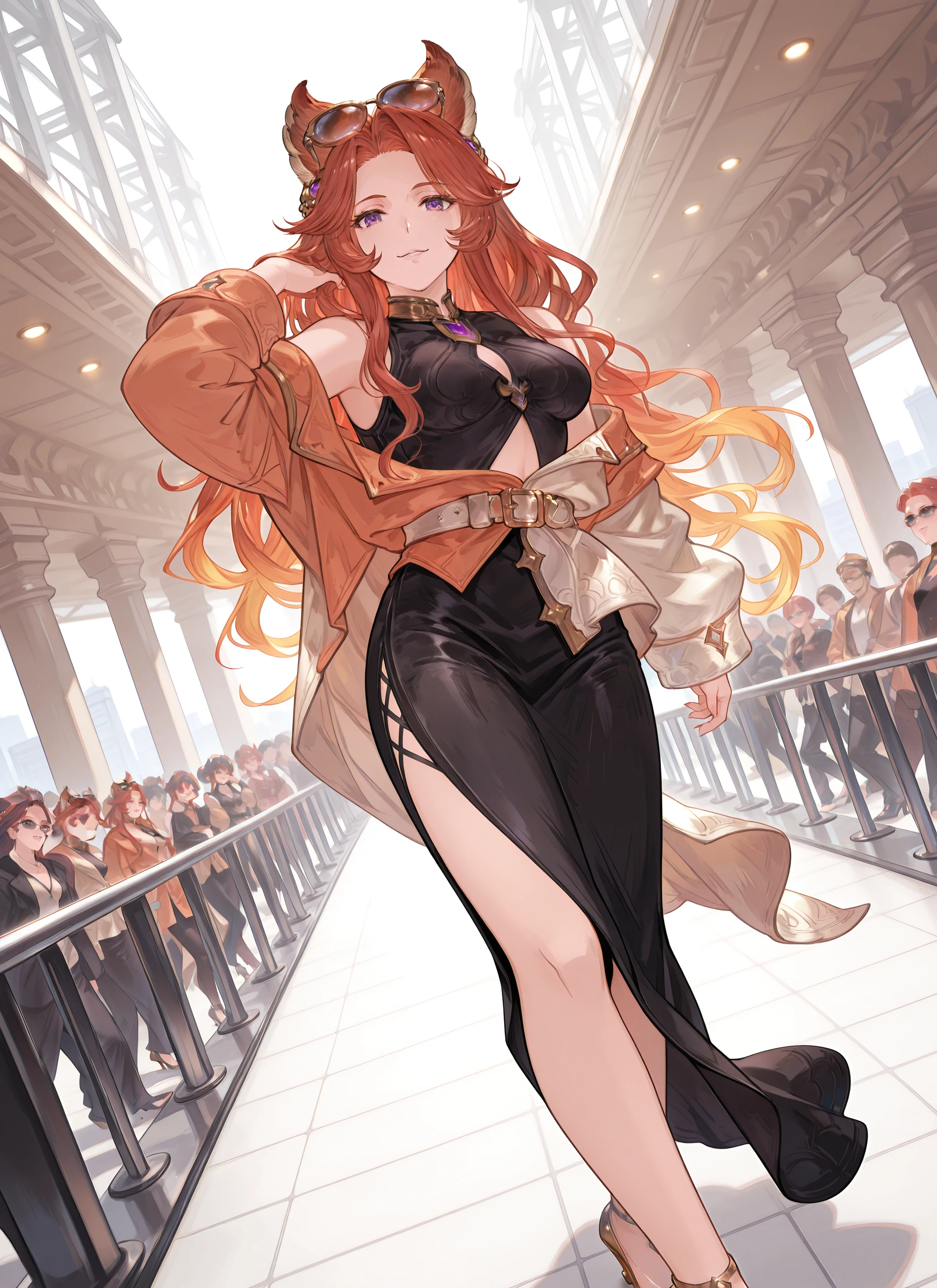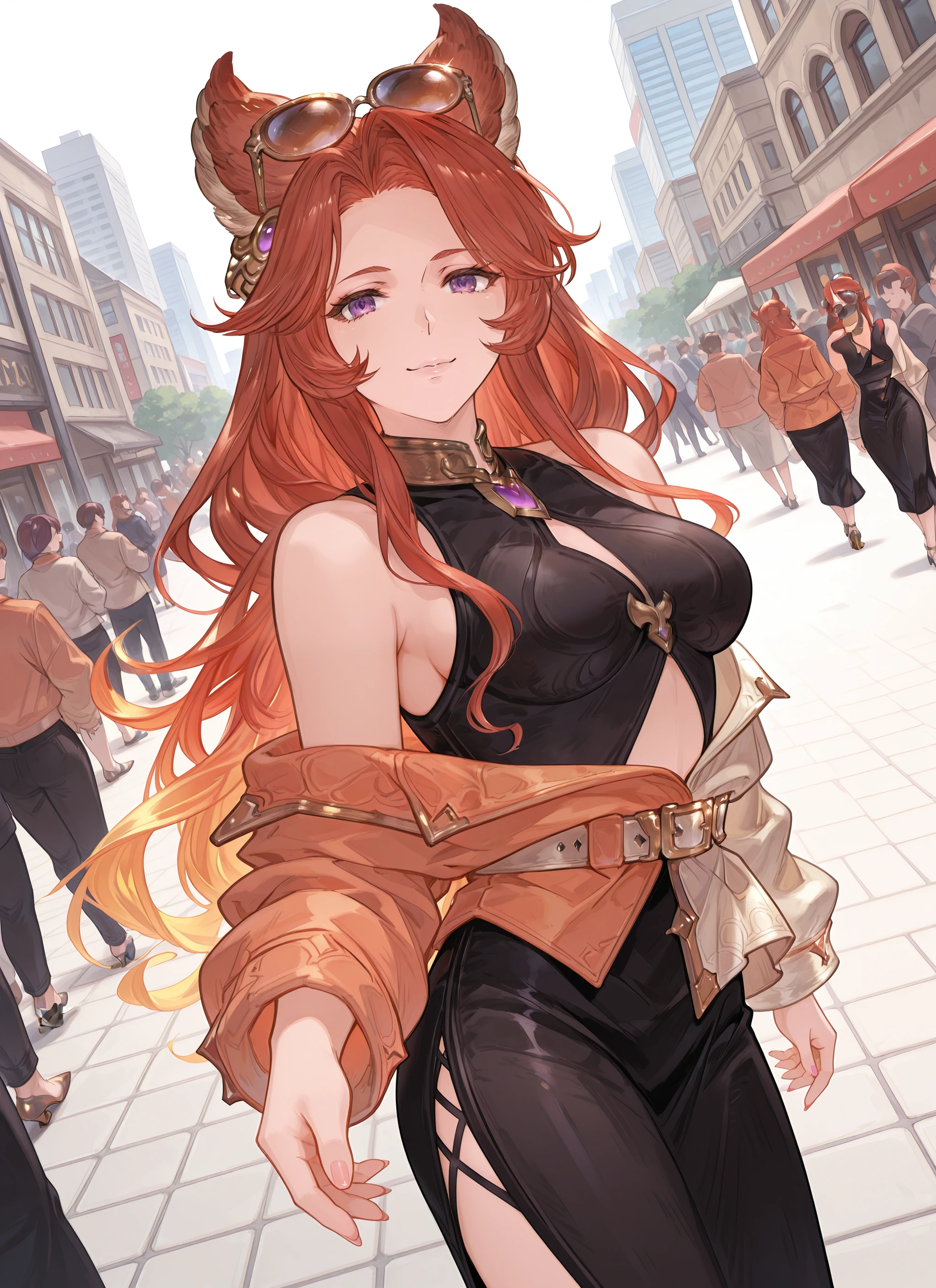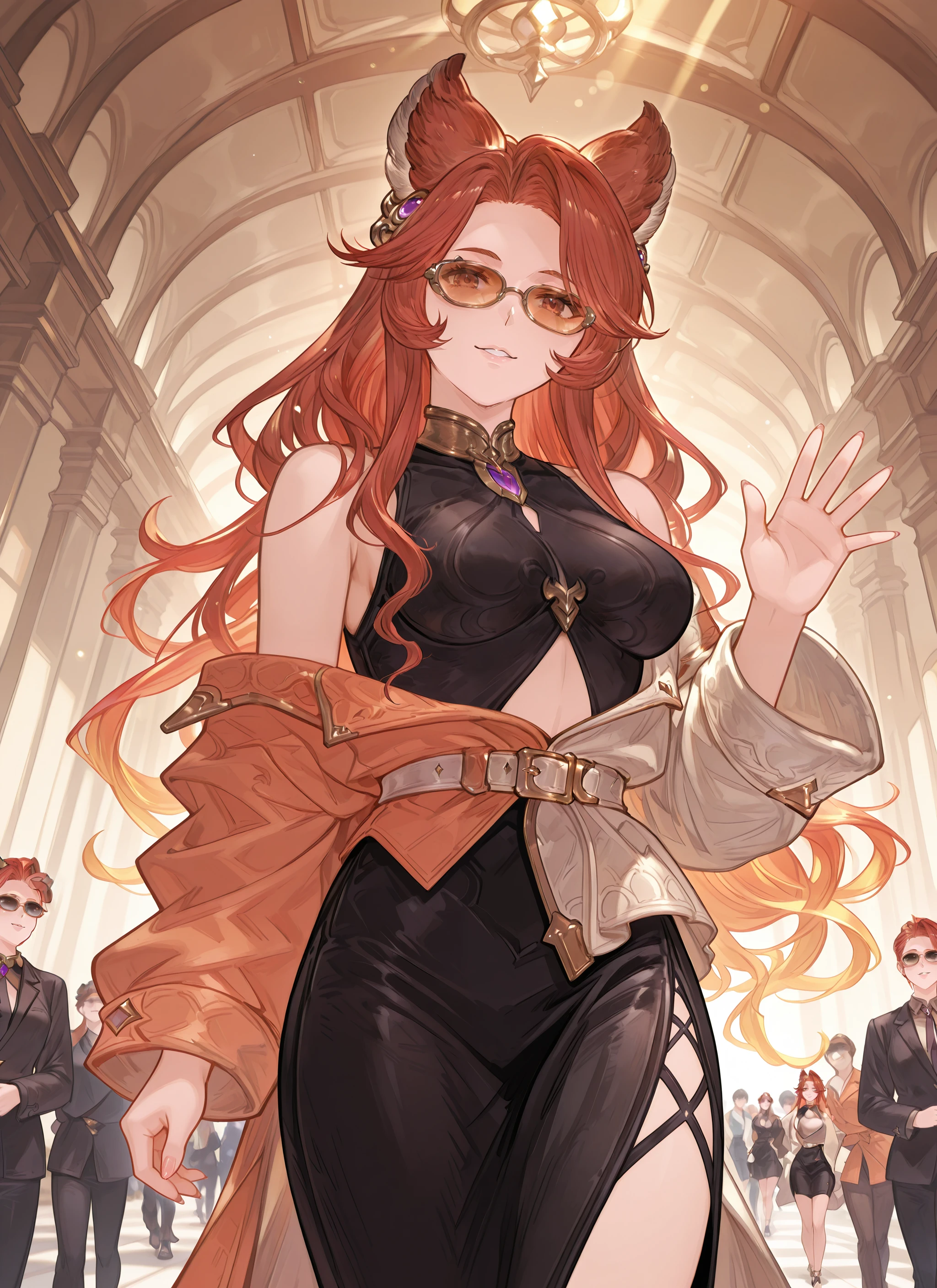 liliana, erune, animal ears, purple eyes, sunglasses on head, red hair, multicolored hair, orange jacket, half off jacket, black dress, side slit, high heels, sunglasses, mature female, medium breastsDescription