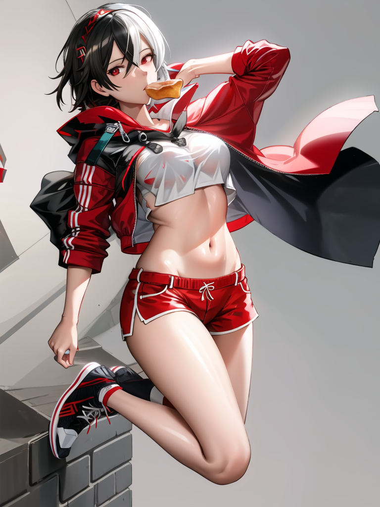 3) Brünhilde: Grain-Seizing Grani (Donut) >>> Bruenhilde, 1girl, SPD_outfit, white shirt, red hoodie, red shorts, wet, sweaty, red eyes, red headband, holding a donut with her mouth, hands behind body, black sneakers, white background, full body shot,