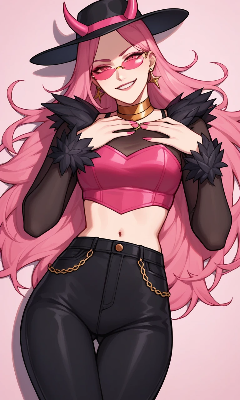 HazeHarp, pink hair, hat, tinted eyewear, horns through headwear, feather trim, long sleeves, pink bustier, gold choker,black see-through shirt, navel, black pants