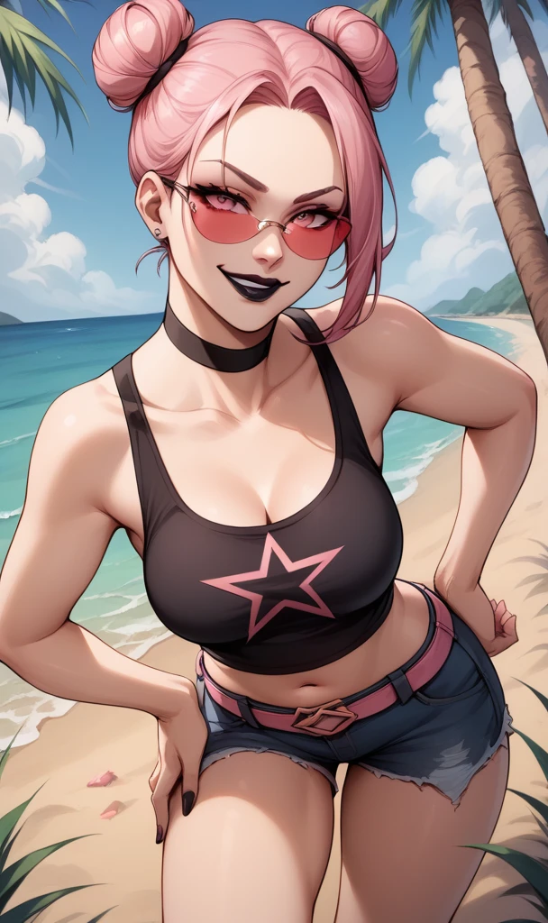 "HazeSW, double bun, pink hair, pink eyes, black crop top, print shirt, tinted eyewear, collarbone, choker. sleeveless, pink belt, denim shorts, navel" for her Surf Witch outfit