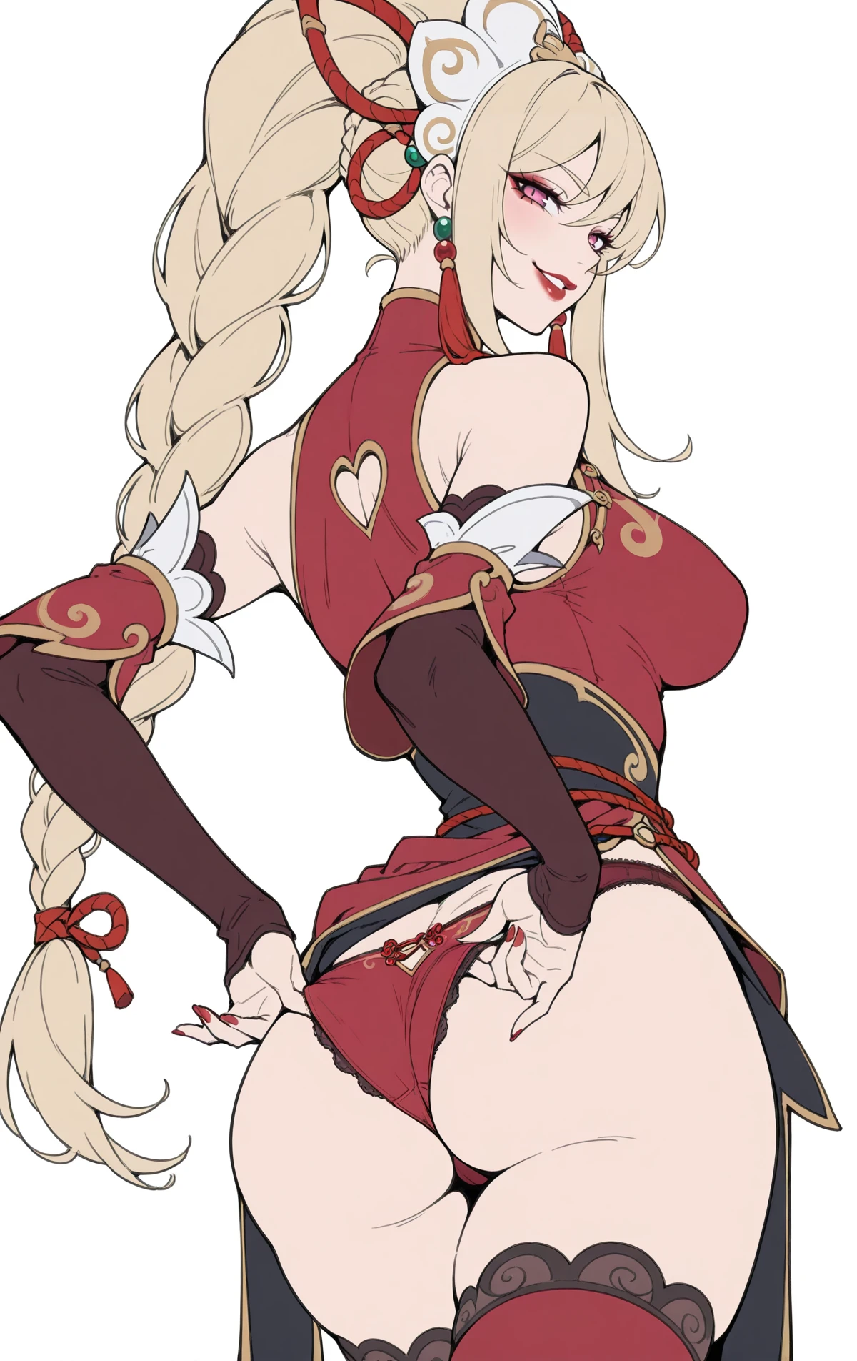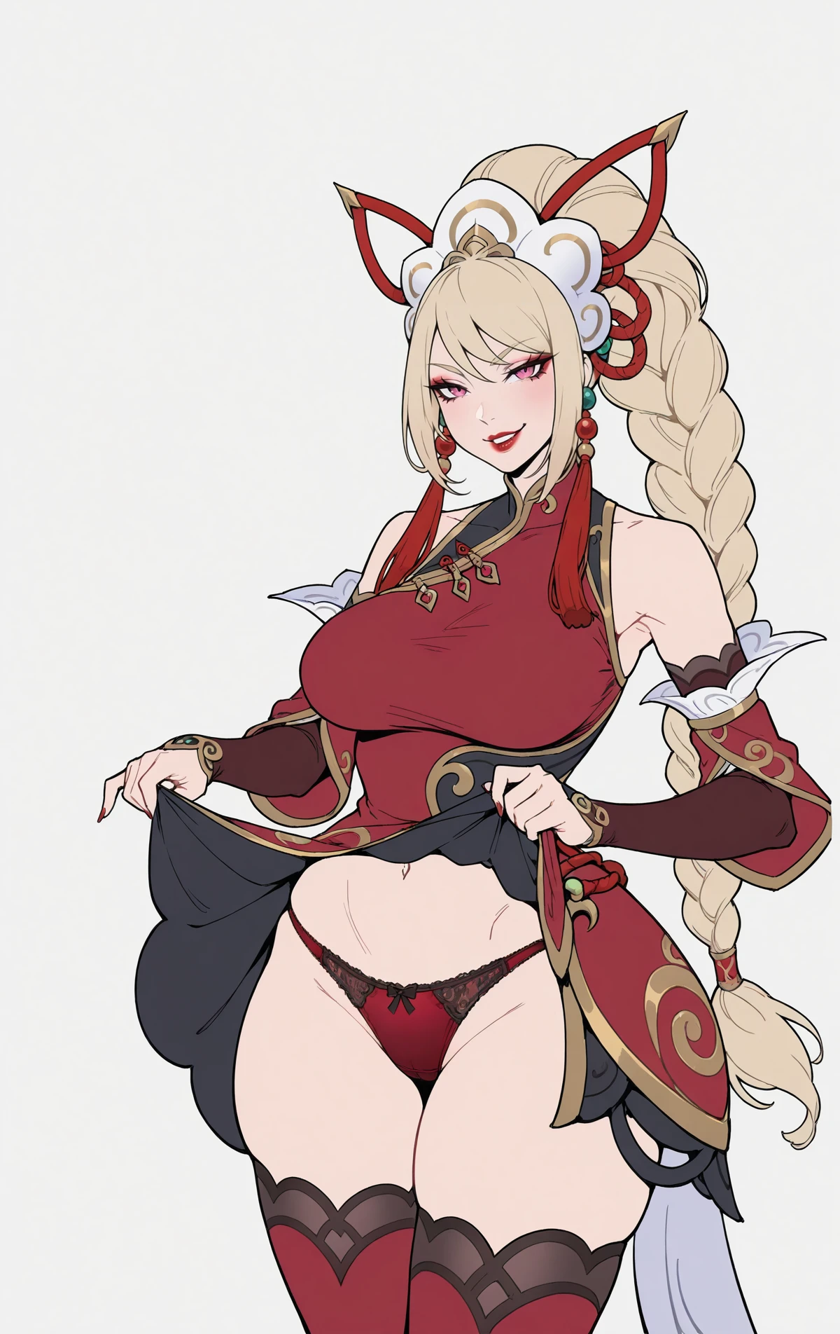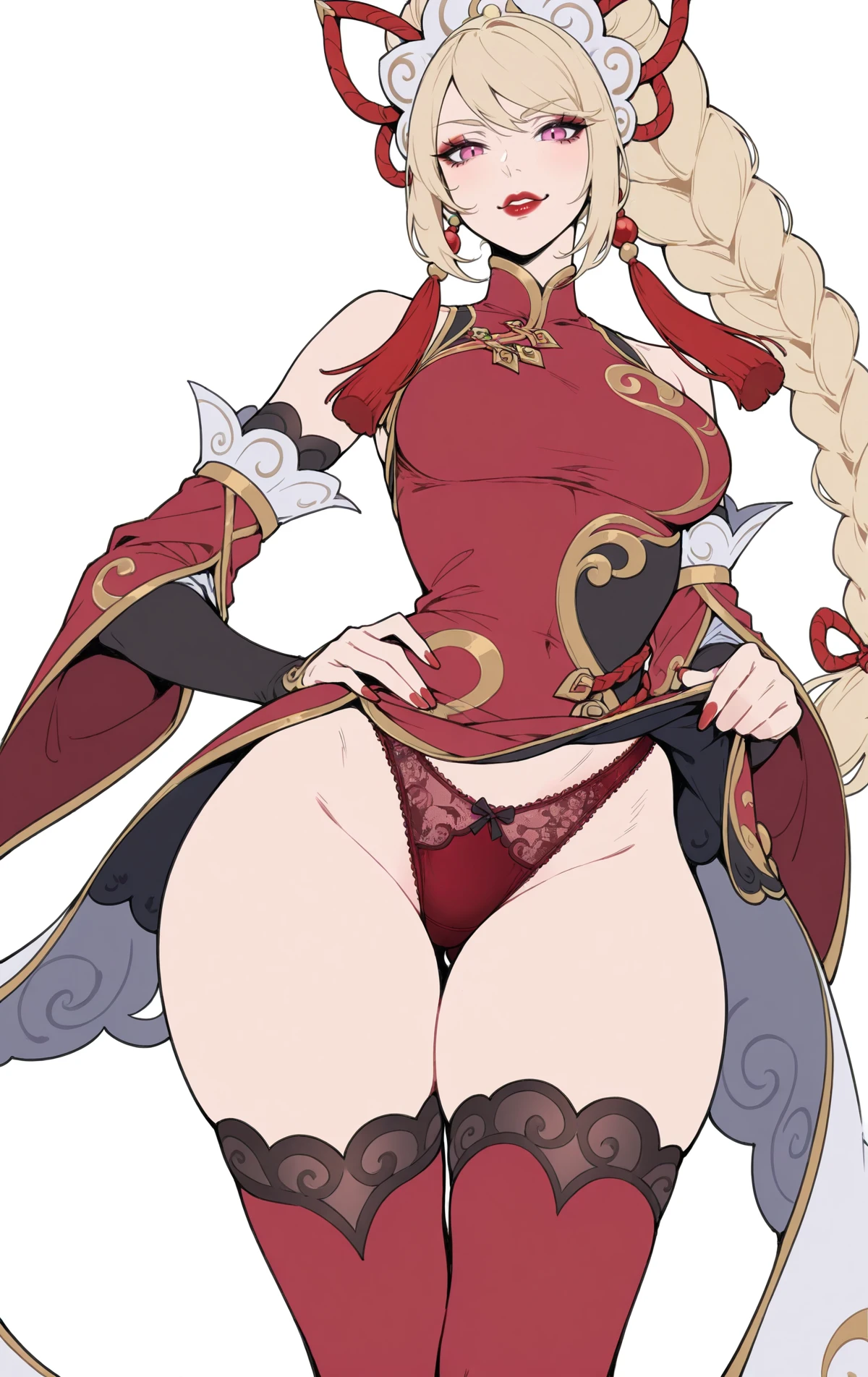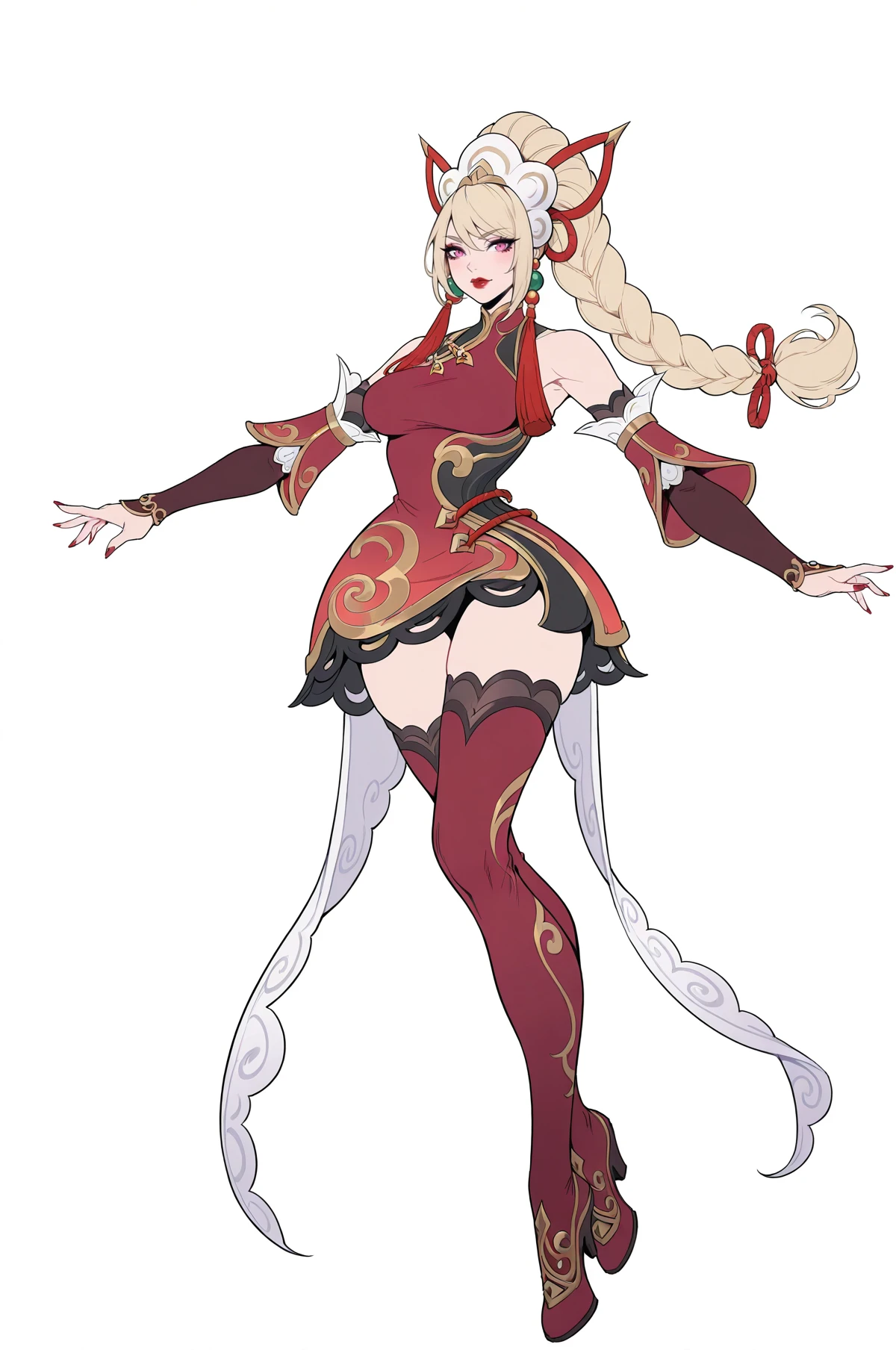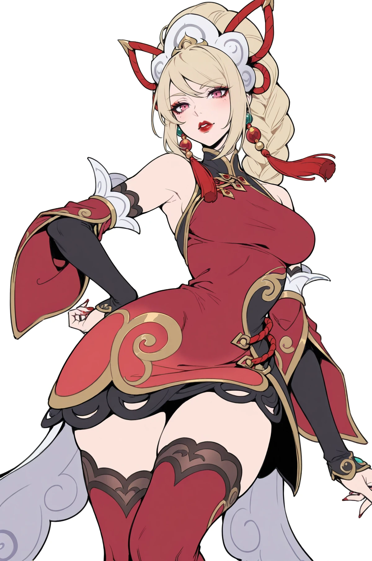 DD_Syndra,blonde hair,long hair,braided ponytail,thick braid,side bangs,pink eyes,thick thighs,bang, red lips, chinese dress,tight dress,short dress,bare shoulders,red sleeves,detached sleeves,hair ribbon,white bow,red stockings,