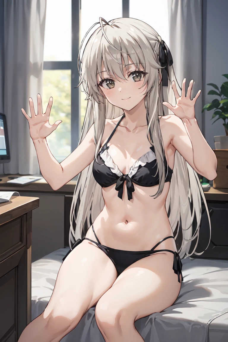 Apperance: kasuganosora, long hair, small breasts, black hair ribbon (hair ribbon and twintails optional)