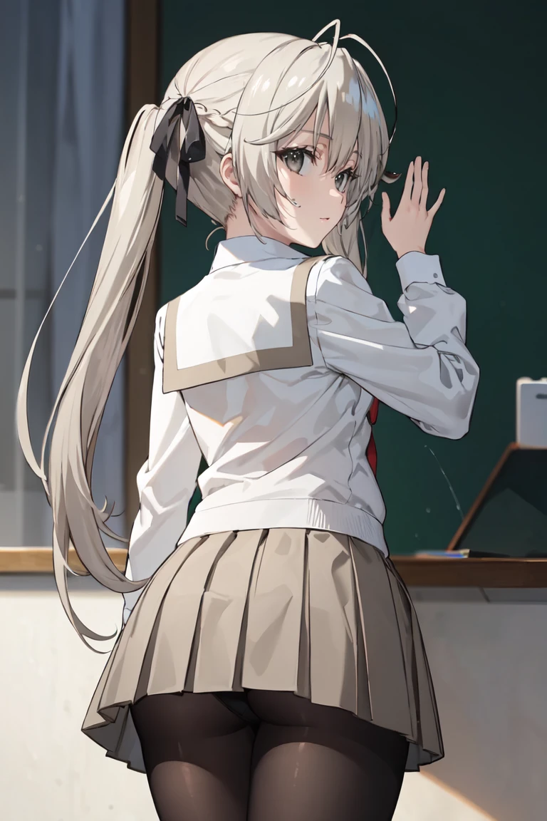 twintails, school uniform, white shirt, grey skirt, black pantyhose