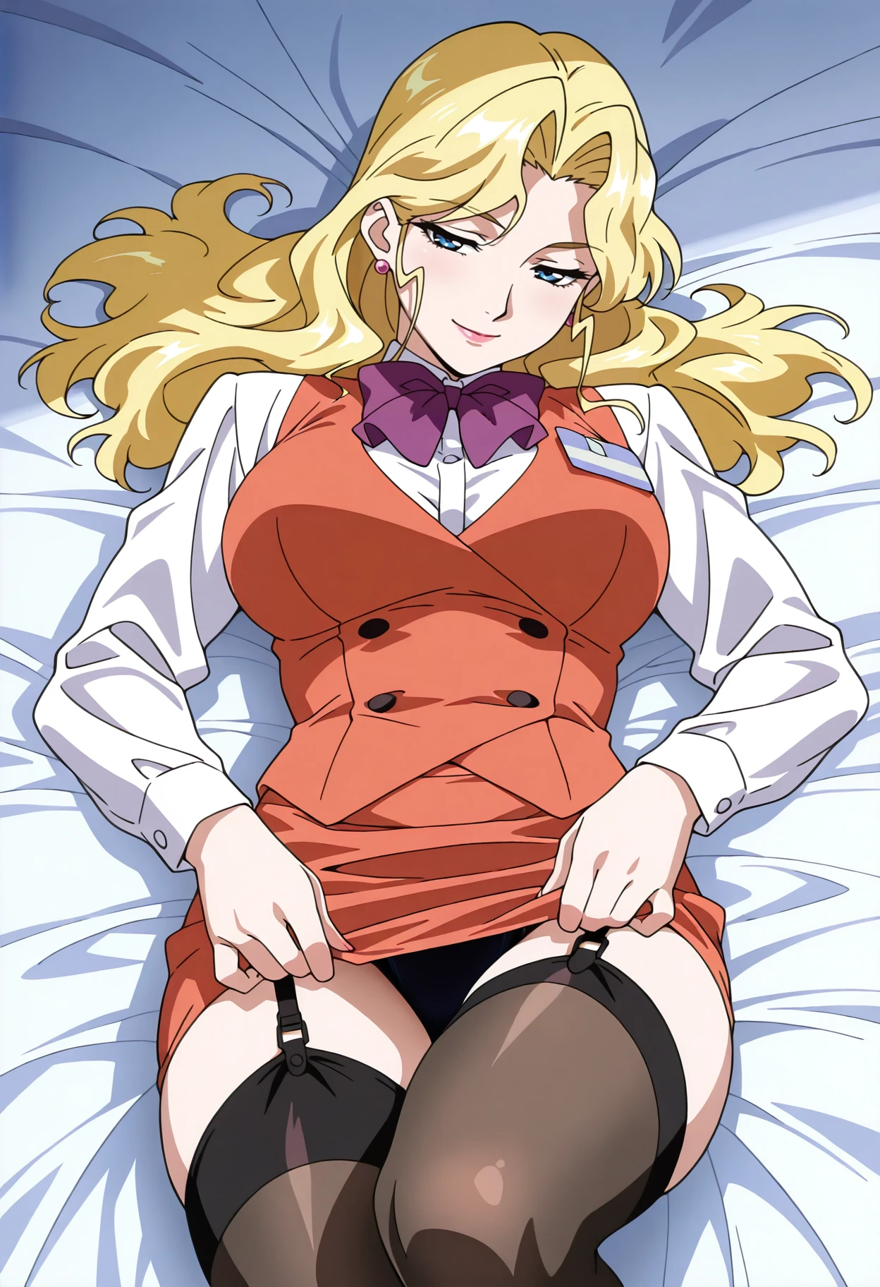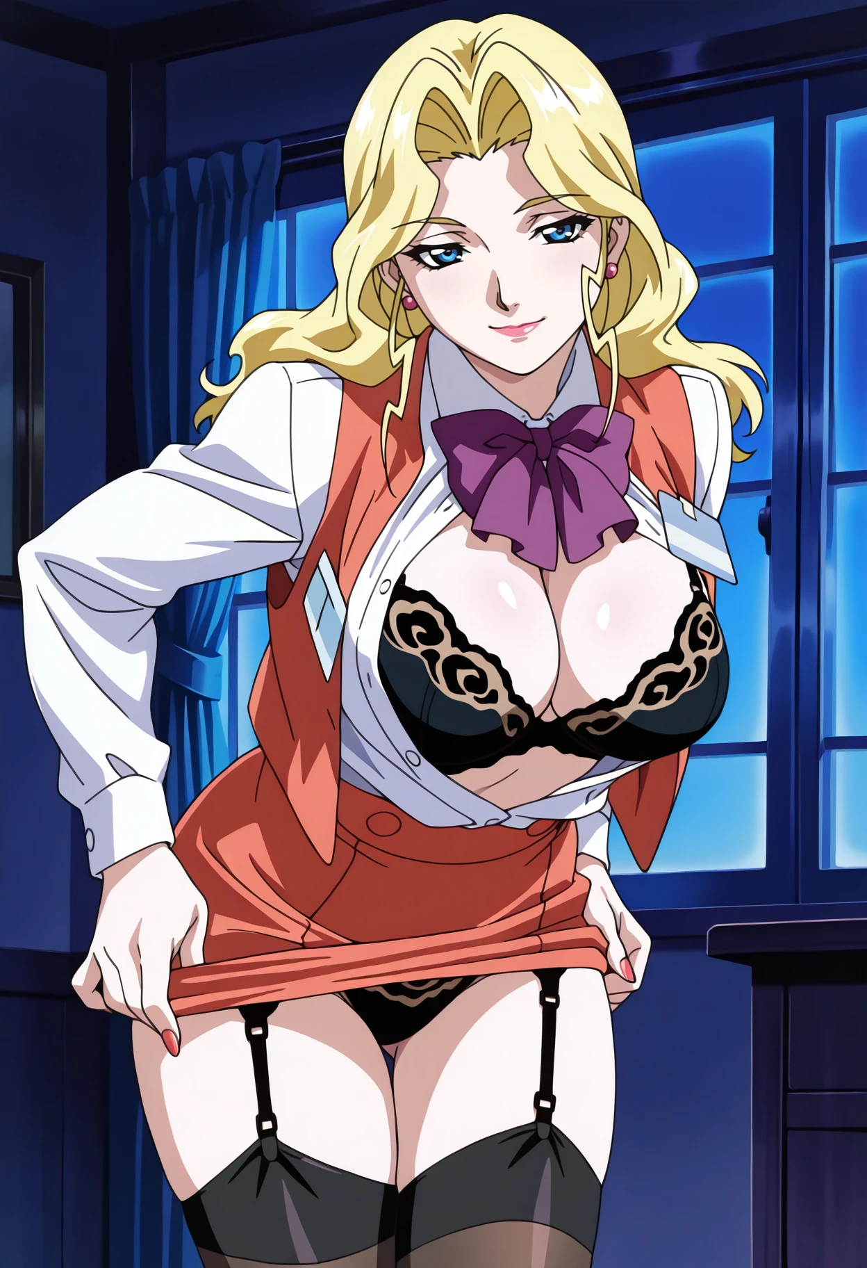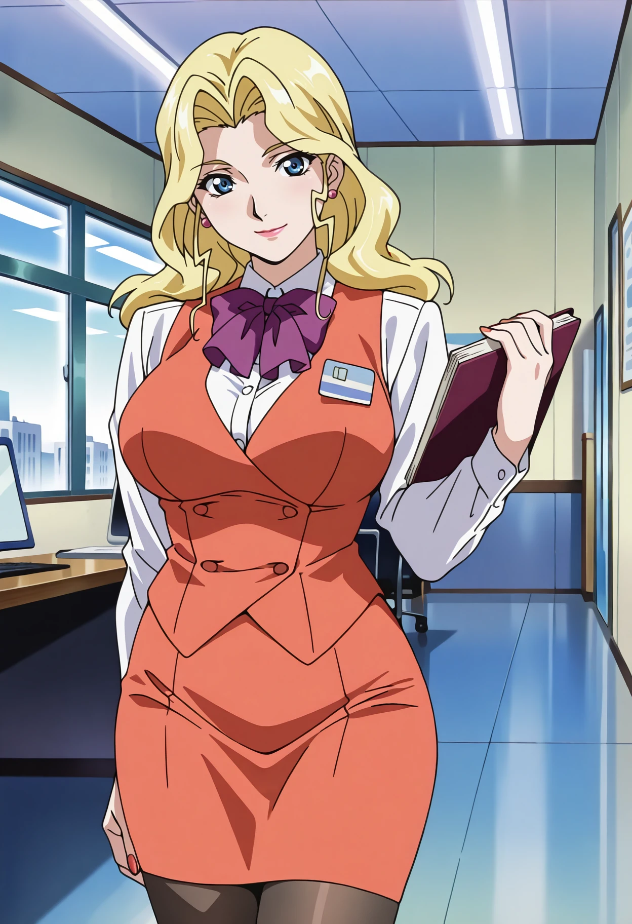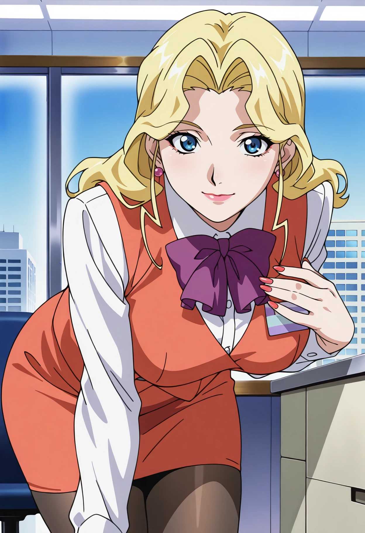 Base: n_alice, 1girl, anime coloring, retro artstyle, solo, long hair, blonde hair, sidelocks, blue eyes, earrings, jewelry, lips, lipstick, alice uniform, purple bowtie, red vest, collared shirt, long sleeves, name tag, pencil skirt, red skirt, large breasts, black pantyhose, fingernails, red nails,