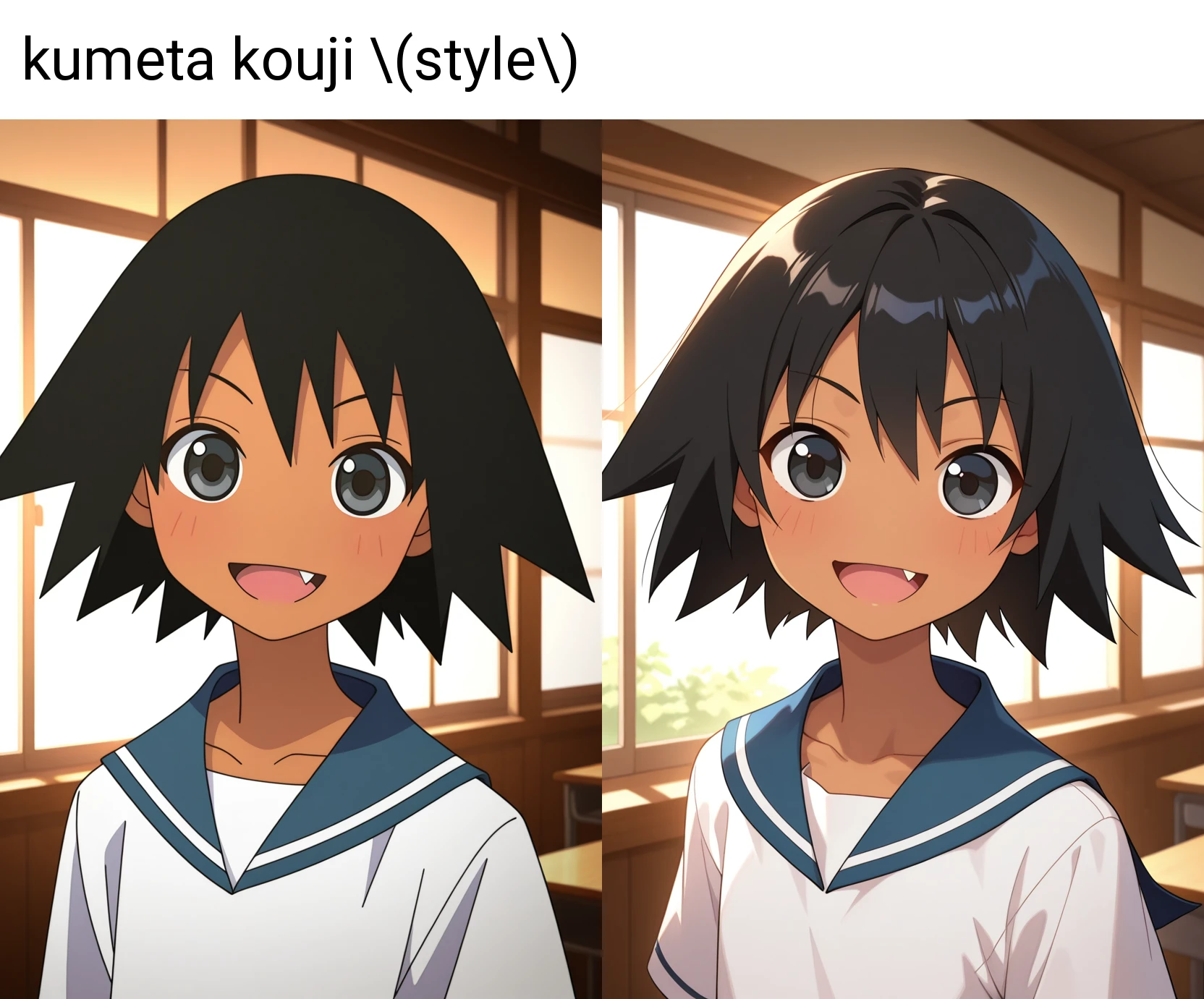 プロンプトに"kumeta kouji \(style\)"を追加する方が、再現度が高くなるようです。