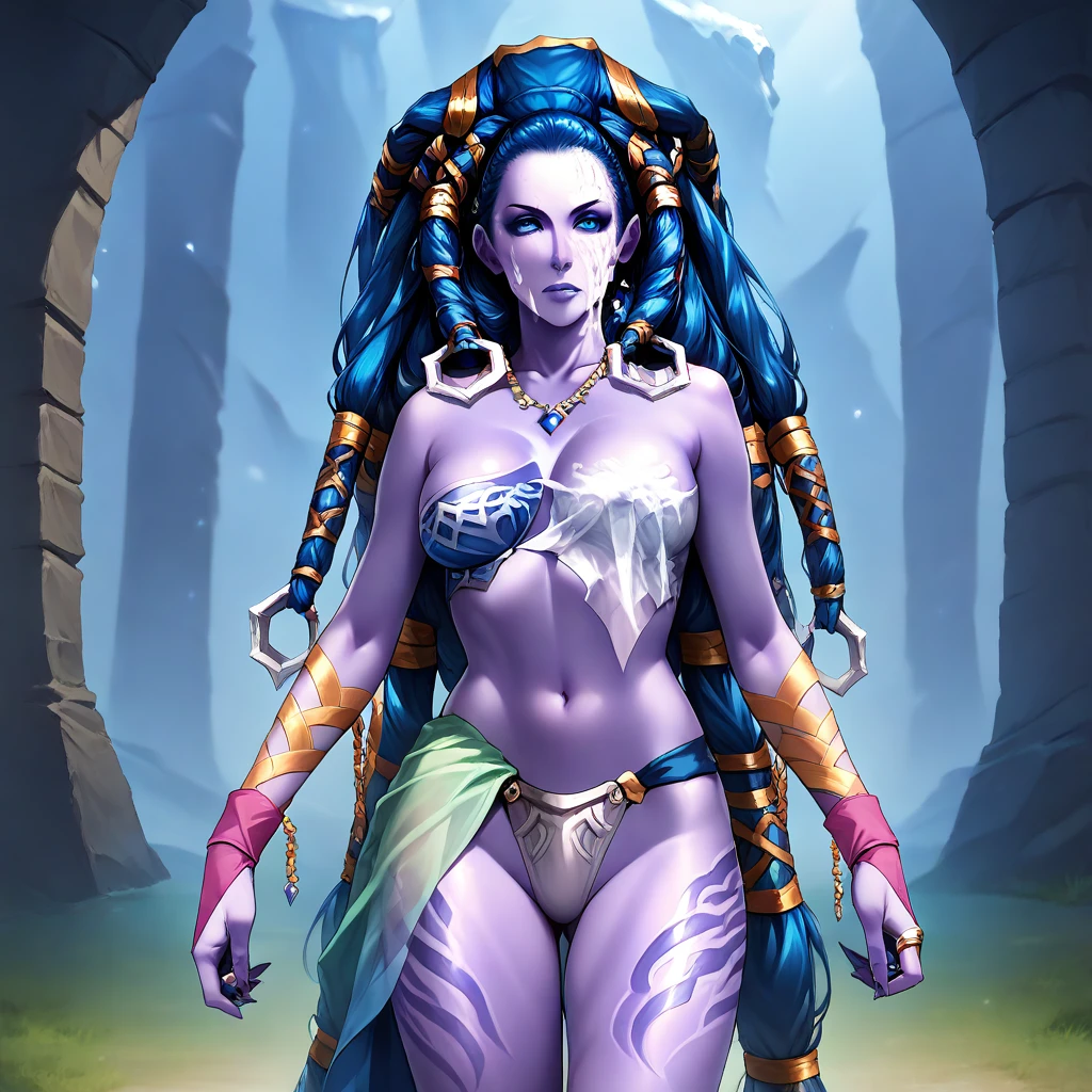 shivaffx, very long hair, hair pulled back, colored skin, blue skin, purple skin, blue hair, multi-tied hair, hair ornaments, hair rings, rings, blue eyes, facial mark,