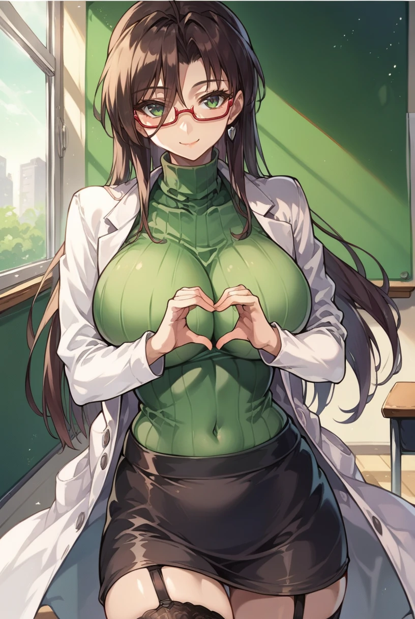 black hair, long hair, green eyes, glasses, red-framed eyewear, ribbed sweater, green sweater, thighhighs, turtleneck, lab coat, garter straps, miniskirt, black skirt,