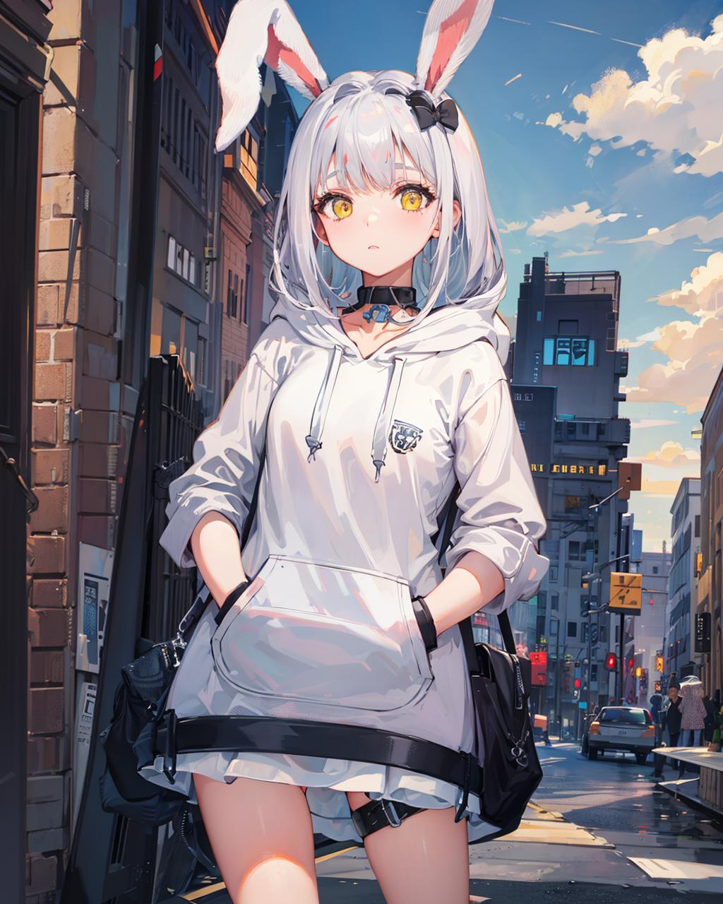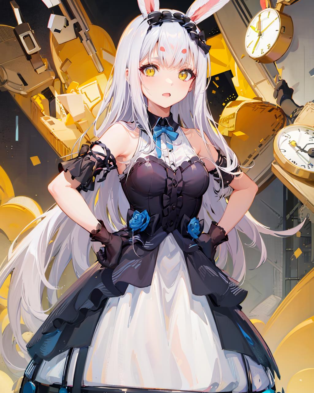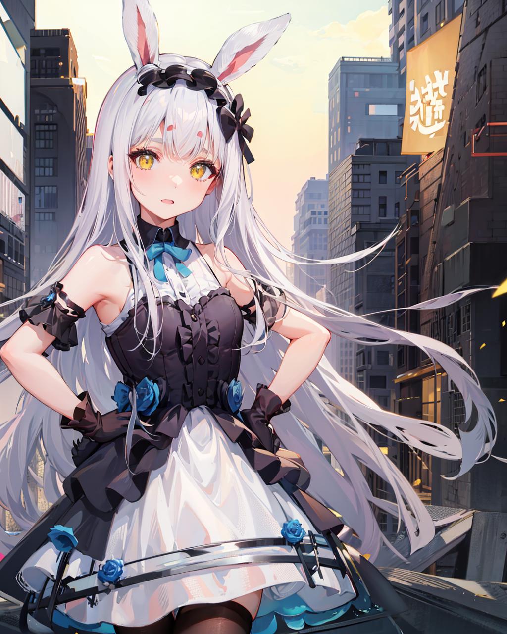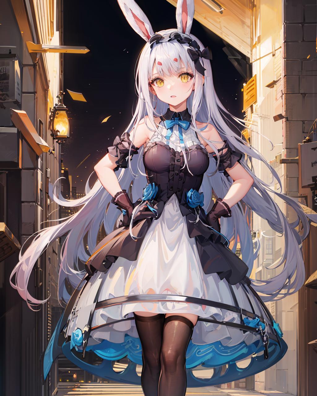 Suggested Tags to enhance her features: yellow eyes, rabbit ears, black gloves, black legwear, white hair.