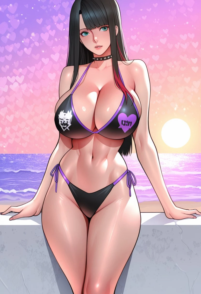 Studded choker, black leather, silver spikes choker, snug fit, bold accent, bikini top, blue fabric, red highlights, heart patterns, glossy finish, tie straps, adjustable ties, deep cleavage, structured cups, vibrant colors, seamless stitching, bikini bottom, matching design, purple trim, side ties, low-rise cut, wide hips coverage, lightweight material, stretchy texture, shiny surface, bold contrast, eye-catching print