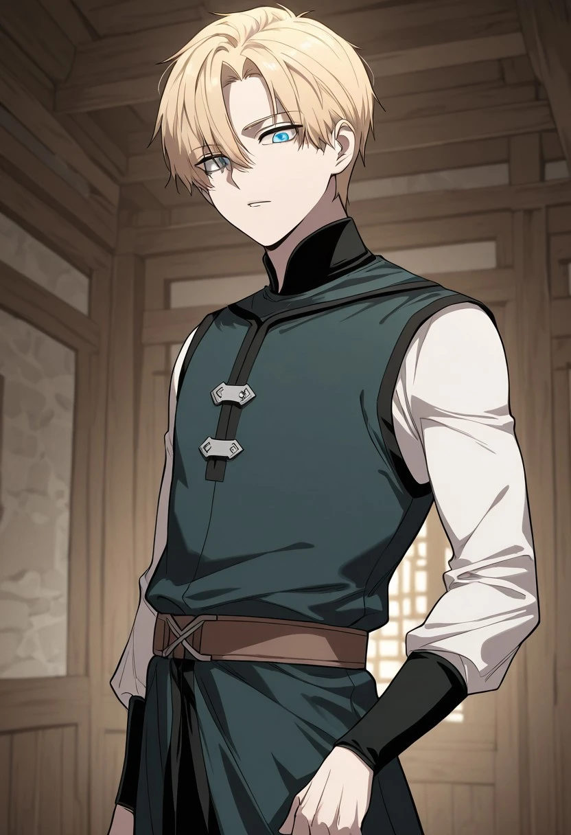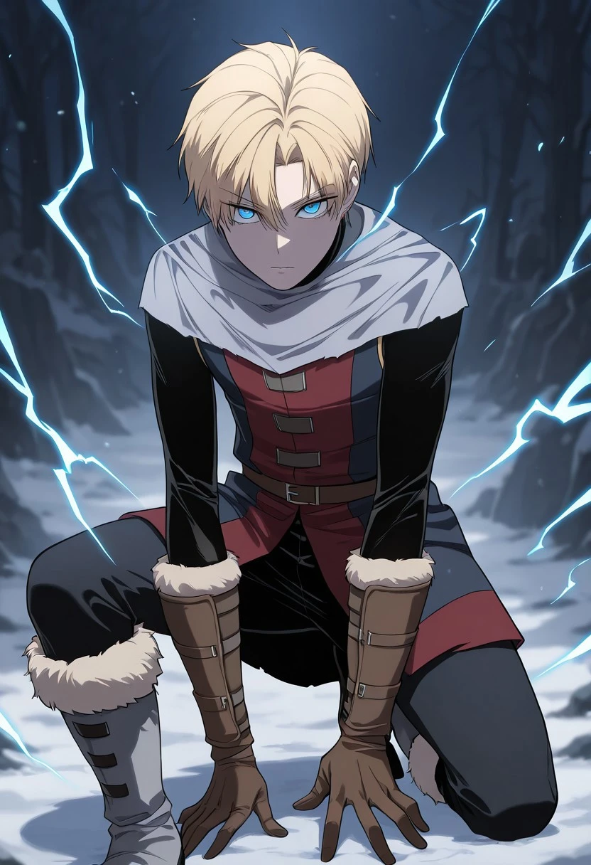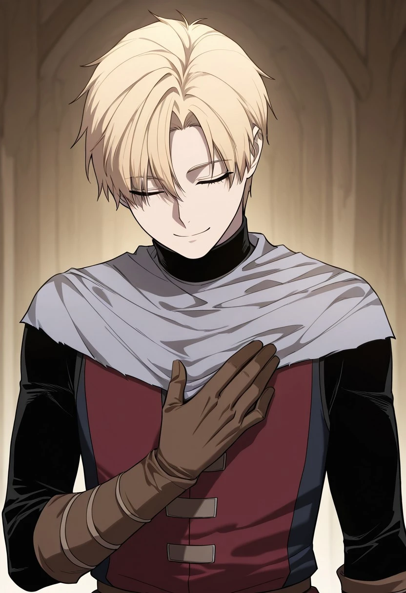 1boy, male focus, solo, blue eyes, blonde hair, short hair, side part, black shirt, turtleneck, long sleeves, grey cowl, red tunic, sleeveless tunic, brown vambraces, brown gloves, belt, fur-trimmed boots,