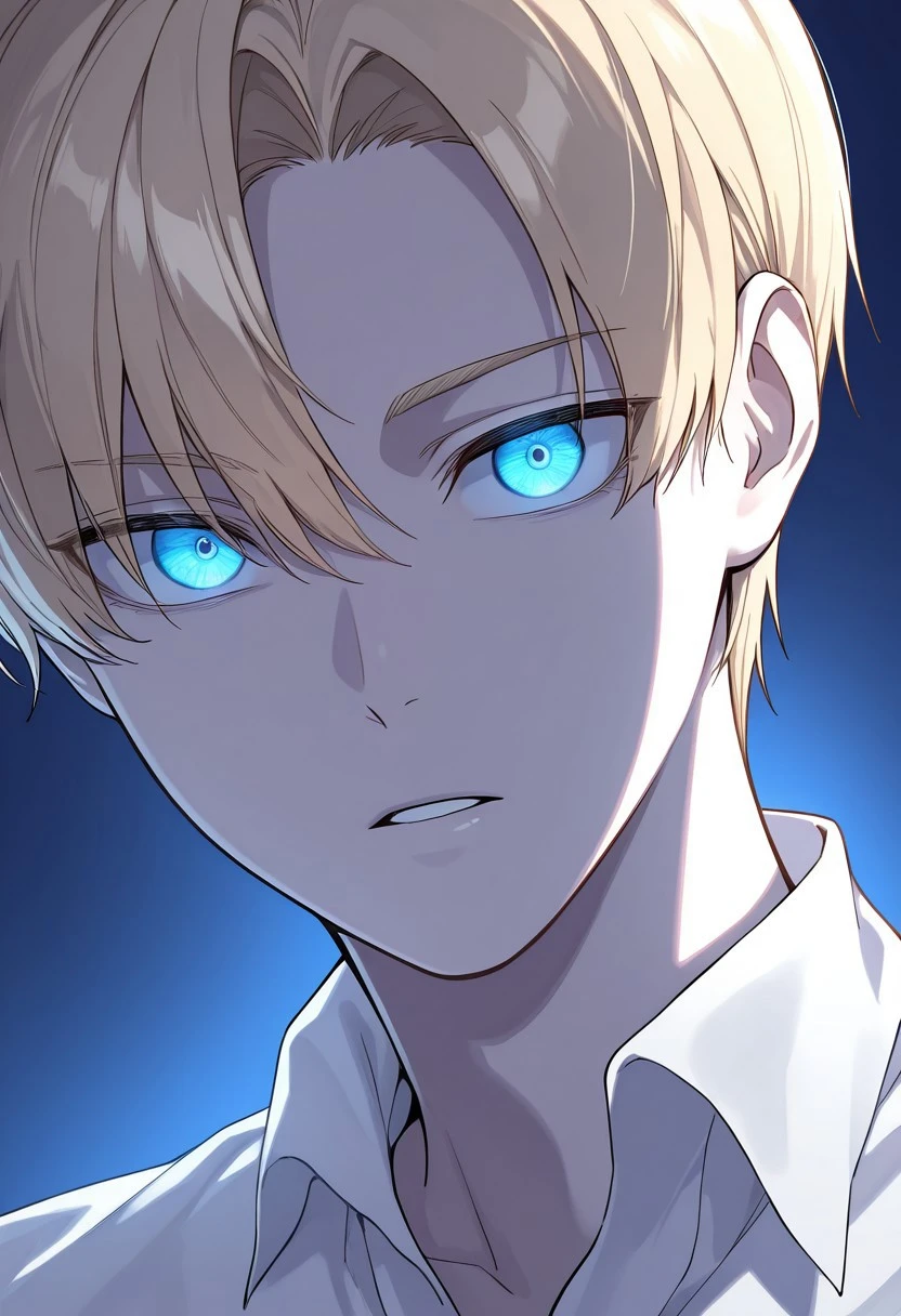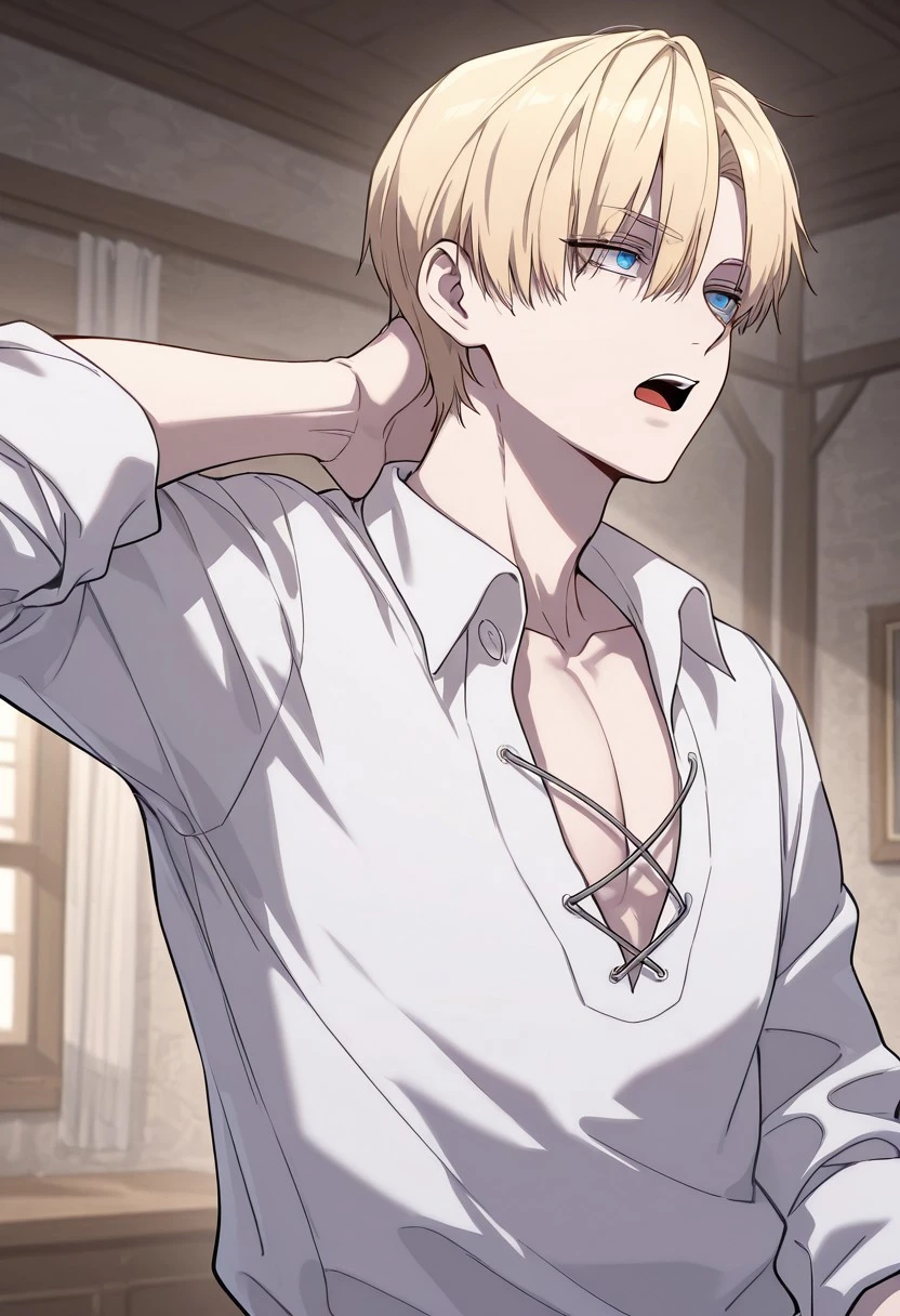 1boy, male focus, solo, blue eyes, blonde hair, short hair, side part, white shirt, collared shirt, open collar, collarbone, pectoral cleavage, sleeves rolled up, shirt tucked in, black pants, boots,