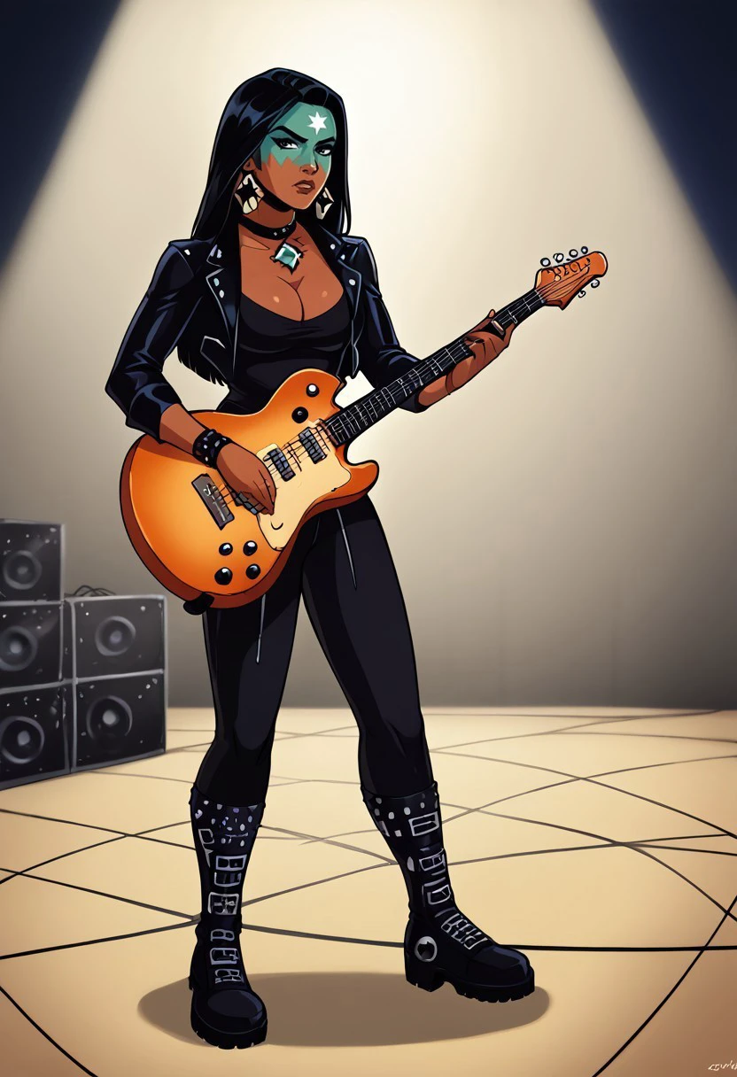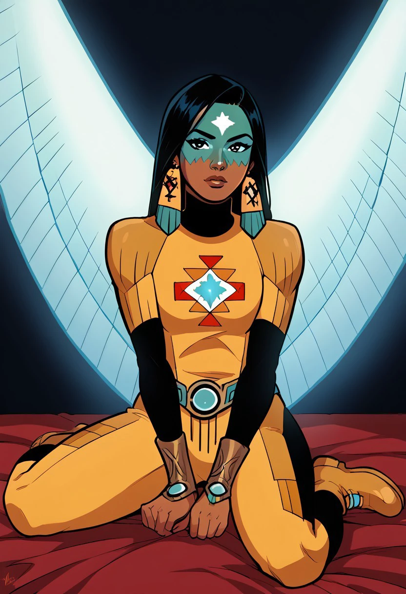 General Prompts: DSf, dark skin, black hair, long hair, black eyes, facepaint, star facial mark, earrings, jewelry, turtleneck, multicolor bodysuit, yellow bodysuit, black bodysuit, bracer, belt, boots, glowing blue wings,